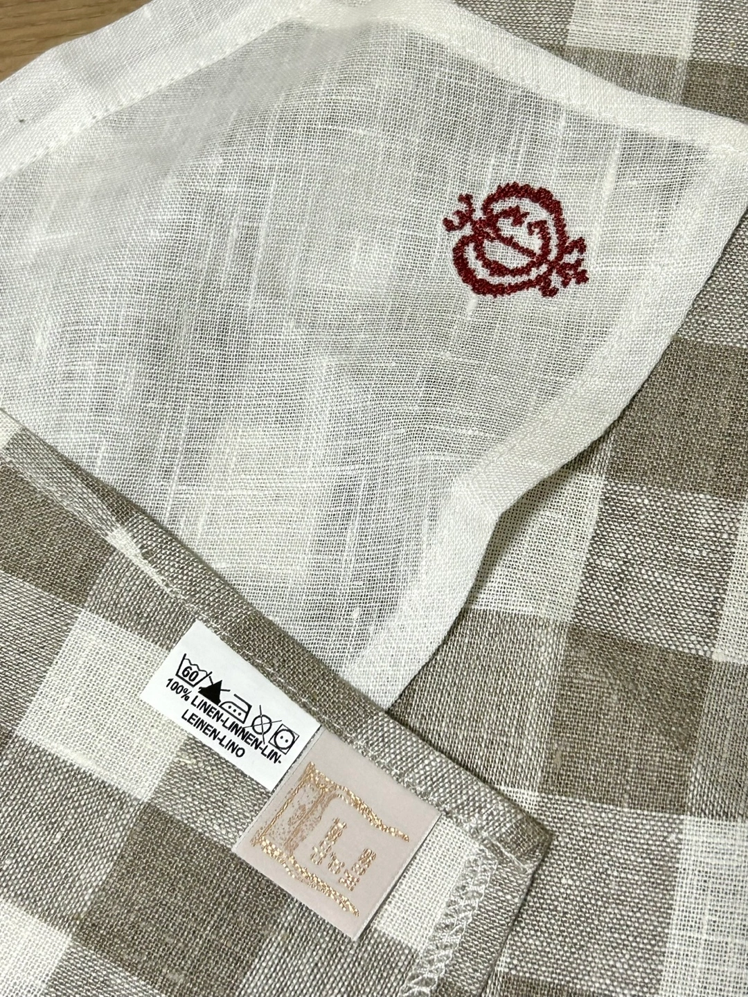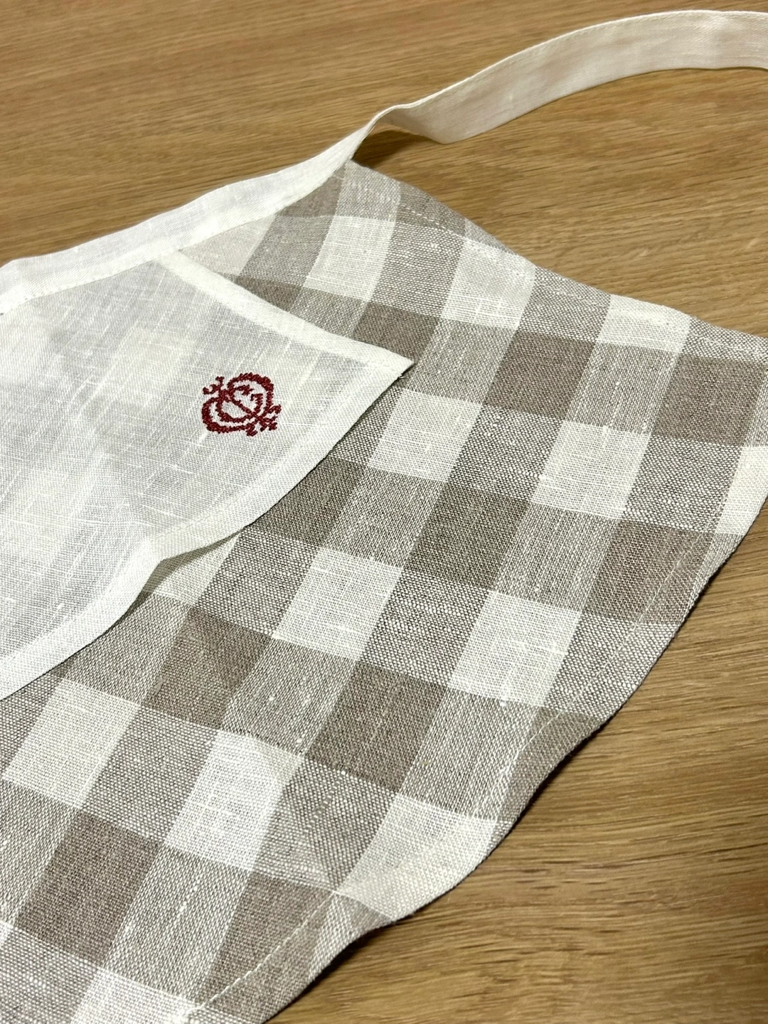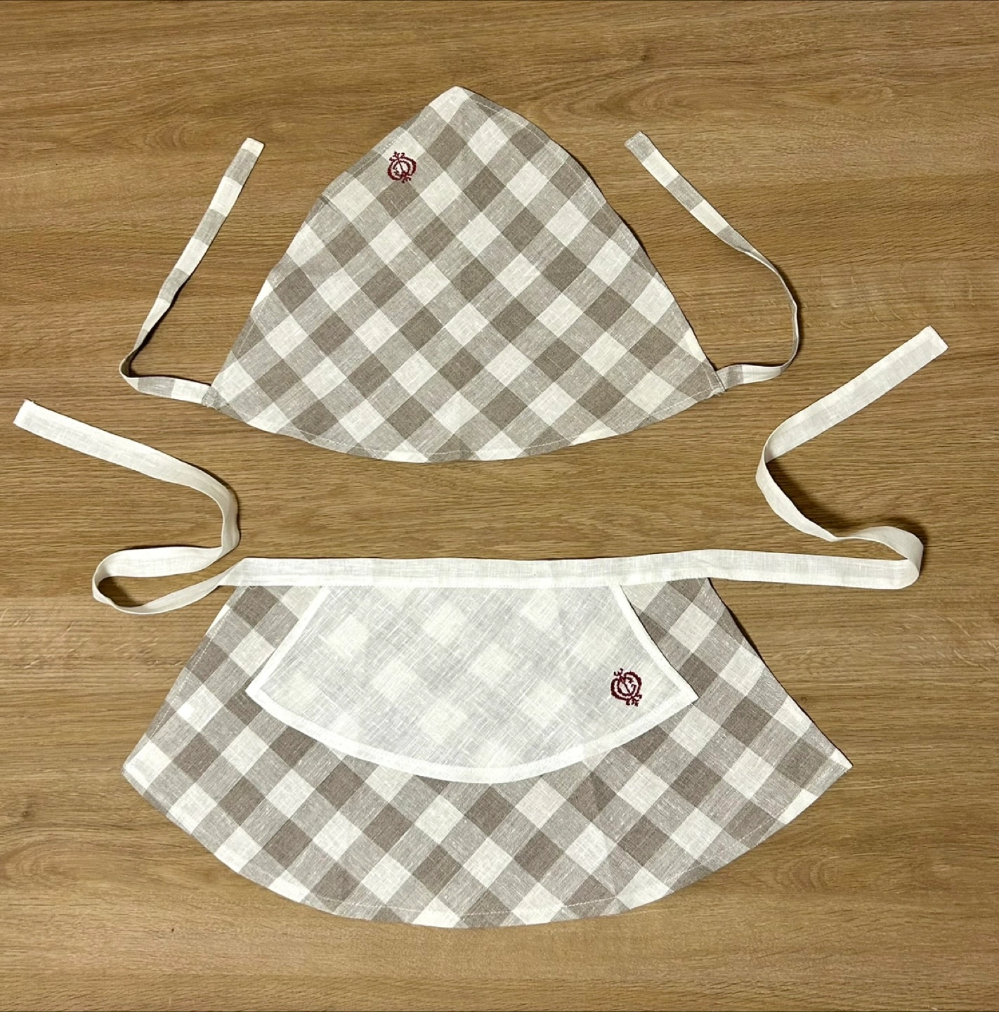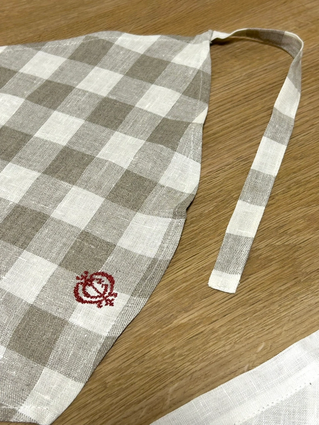 子供用のナチュラルな腰エプロンとバンダナ(三角巾)のセットです。 ハリのある質のよいリネンを使用しています。 エプロンはチェック生地と透け感のあるホワイト生地のコンビでとても可愛いです。 リネン専門店で購入しました。未使用のまま長期保管です。 たぶん4〜5歳から小学低学年くらいのお子様に合うサイズだと思います。 詳しくは画像ご確認ください 【サイズ・仕様】 色:ベージュxホワイトチェック サイズ:画像2、3枚目ご確認ください(多少の誤差あり) 素材:麻100%