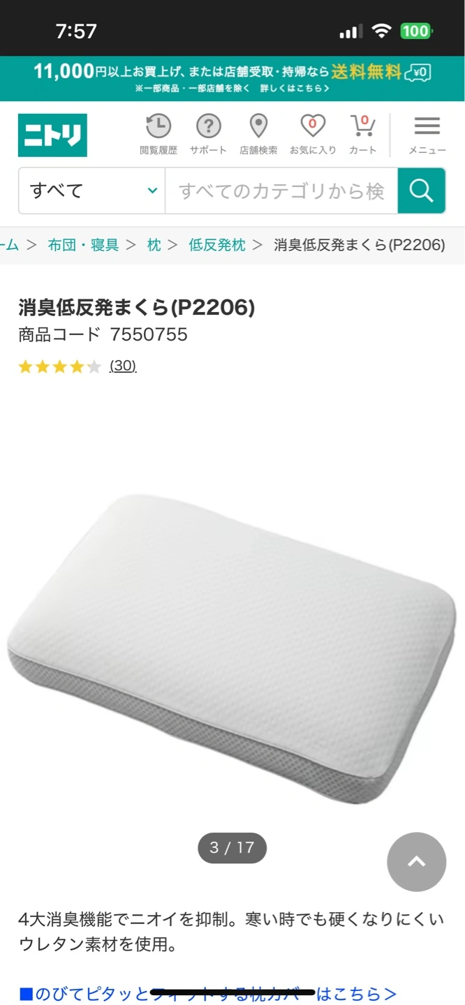 ニトリの無臭低反発まくらです。 購入したばかりで未使用です。 開封後タオルを敷いて試してみましたが、自分には合いませんでしたので出品します。 枕カバーはありません。 下記はニトリホームページからの引用です。 硬さが普通とありますが、自分には柔らかく感じました。 気になる点は何なりとチャットでお知らせください。よろしくお願いします。 枕の高さ 中 硬さ 普通 素材 ウレタン 低反発、抗菌防臭、消臭加工 幅56x奥行36x高さ13cm #受け渡し場所は東雲駅、国際展示場駅、豊洲駅周辺でも大丈夫ですのでご相談ください。