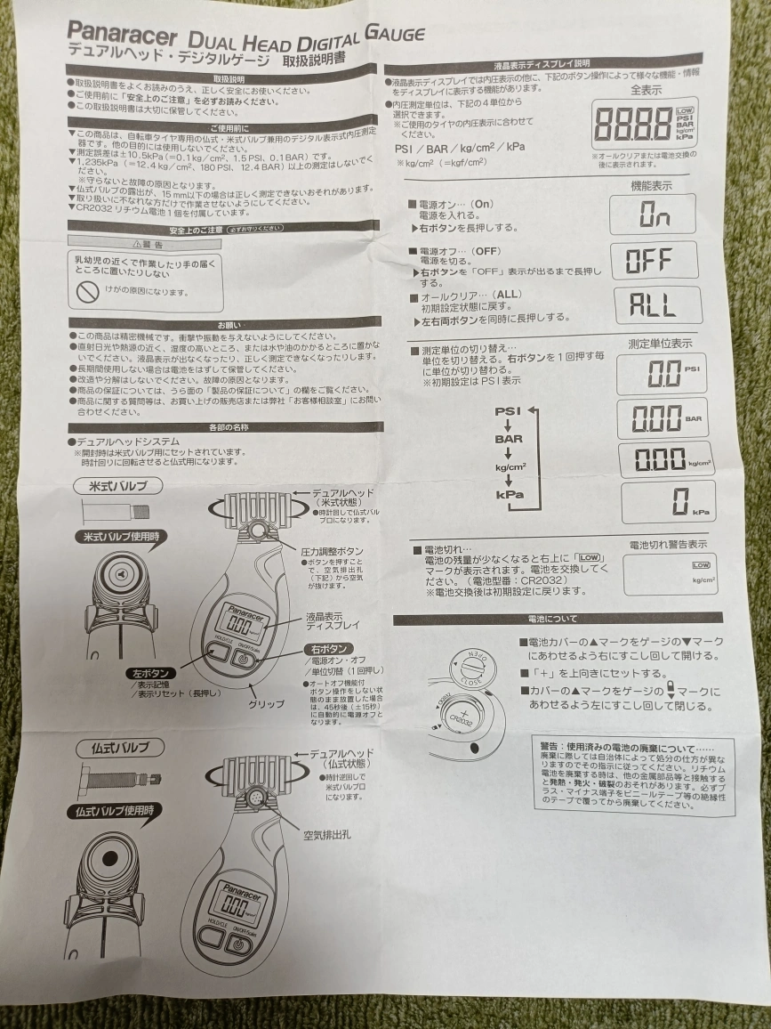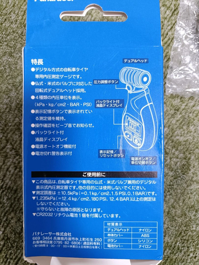 ご覧いただきありがとうございます☆ 実家に眠っておりました パナレーサーの自転車の空気圧測定器です。 空気も入るものかと思い間違えて購入してしまった為お譲り致します。 電池付き。 説明書付き。 サイズ 34 x 70 x 132 mm 回転式デュアルヘッド採用で仏・米式のバルブに対応 2種類の単位で内圧を表示(kPa・BAR) ワンボタン(左側)で表示記憶・表示リセットが可能 オートOFF機能があるので消し忘れても自動でOFF(45±15秒でOFF、その5秒前にビープ音) 空気圧を測定したまま調整出来る、圧力調整ボタン付き ⚠️動作確認済み。確認するため絶縁シートを1度外しましたが、元に戻してあります。 Amazon参考価格¥2745 お安く出品しておりますのでお値下げ不可になります。 ドタキャンされない方でお願いします。(通報&ブロックします) ご不明点等ございましたらお気軽にお問い合わせ下さい。 他のサイトでも出品中です。 溝ノ口駅、津田山駅、梶ヶ谷駅周辺でもOKです。