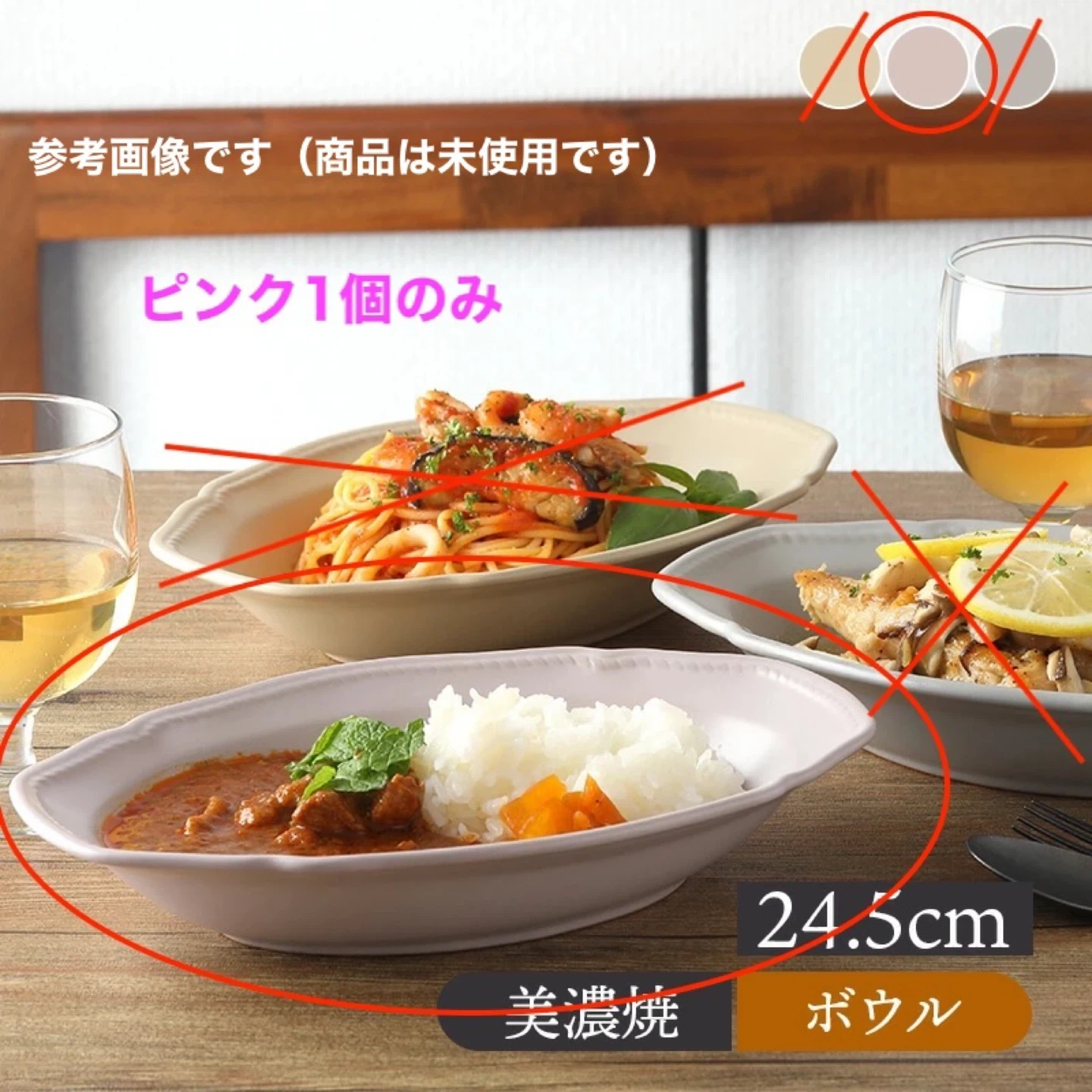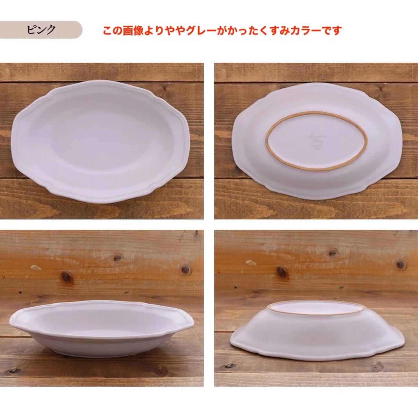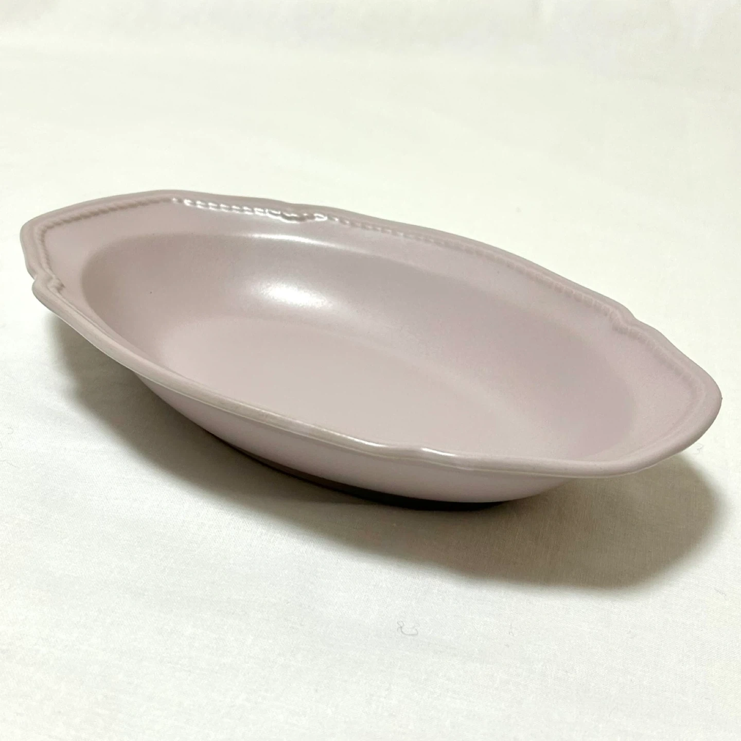 ロマンチックなオーバルボウルです。 可愛いお皿は色々ありますが、便利なオーバル型は珍しいと思います。 適度に深いのでカレーやシチュー、パスタなどにおすすめ。 おかずの大皿にも便利だと思います。 アンティーク調のデザインに落ち着いた薄ピンクで甘すぎないデザインです。 色はパープルグレー寄りの暗めのピンクです。 未使用ですが包装はありません。 購入時定価:¥1,119 【サイズ・仕様】 サイズ/24.7×17×高さ4.7cm 重さ/約372.5g 容量/約722.6cc 素材/陶器 質感/マット 生産地/日本(美濃焼) 電子レンジ・食洗機・オーブン・直火不可 ※サイズは全て外寸になります。 ※サイズ・重さ などは商品により誤差があります。