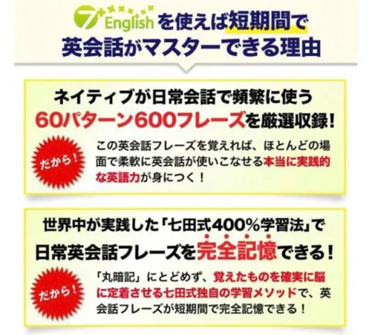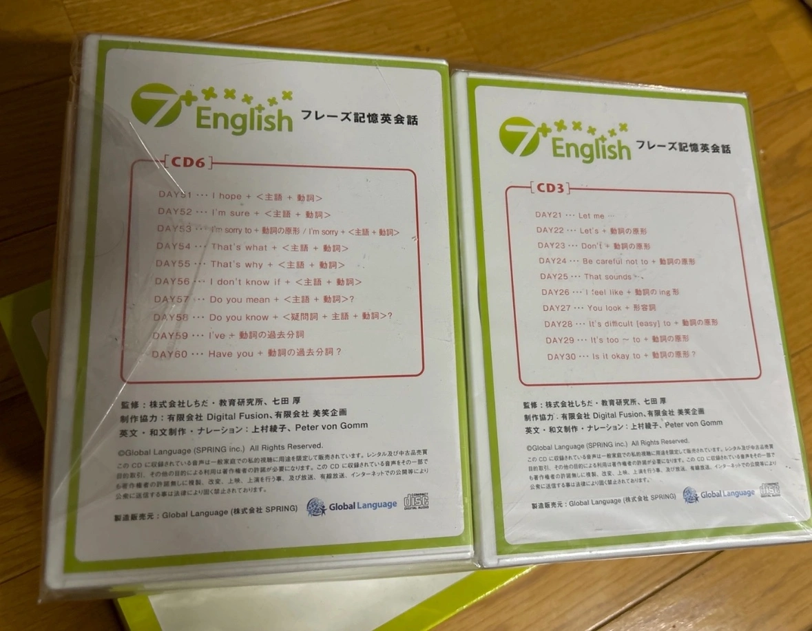 七田式英会話教材 7+English(セブンプラスイングリッシュ) 「600の英会話フレーズを60日で完全記憶して英語が話せる。たった60日で英語が話せる。」で有名な教材です。 テキストもCDも未開封です。 確認もできていません セット内容ご確認ください。 •完全記憶CD(約60分×6枚) •利用マニュアル •英文テキスト集600 •600フレーズ完全解説 •頻出600フレーズチェックシート 購入した時、二つ届いてしまい返品できず保管してありました 一つは子供が使用しました。 ただ流しているだけでも良いと思います。 よかったらお子様の英語スタートにいかがですか? 数年自宅保管していたことをご理解の上、ご検討よろしくお願いします。