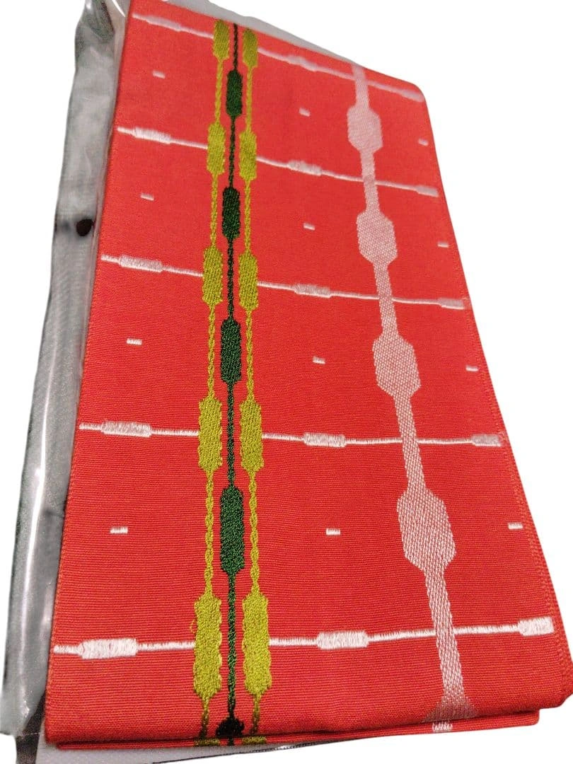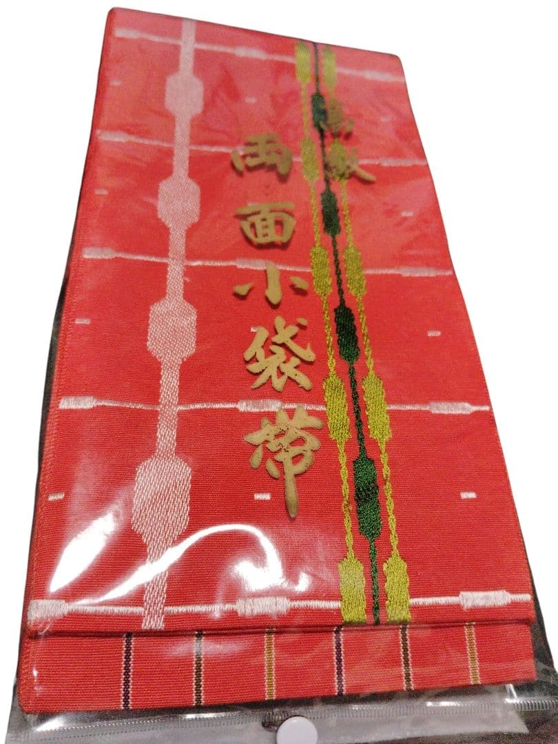未使用 高級 両面小袋帯 リバーシブル 朱赤 金糸 正絹風 和装小物帯