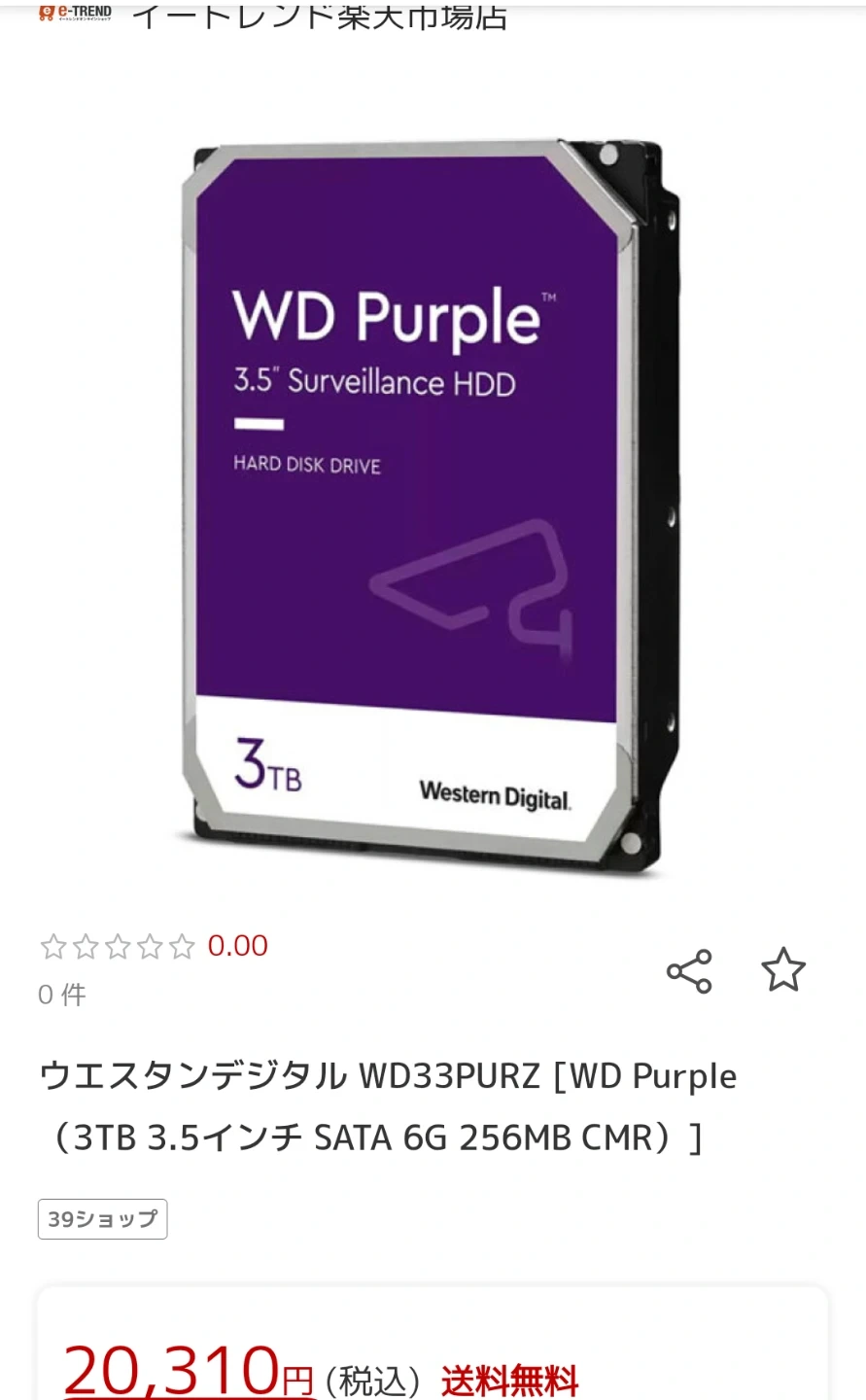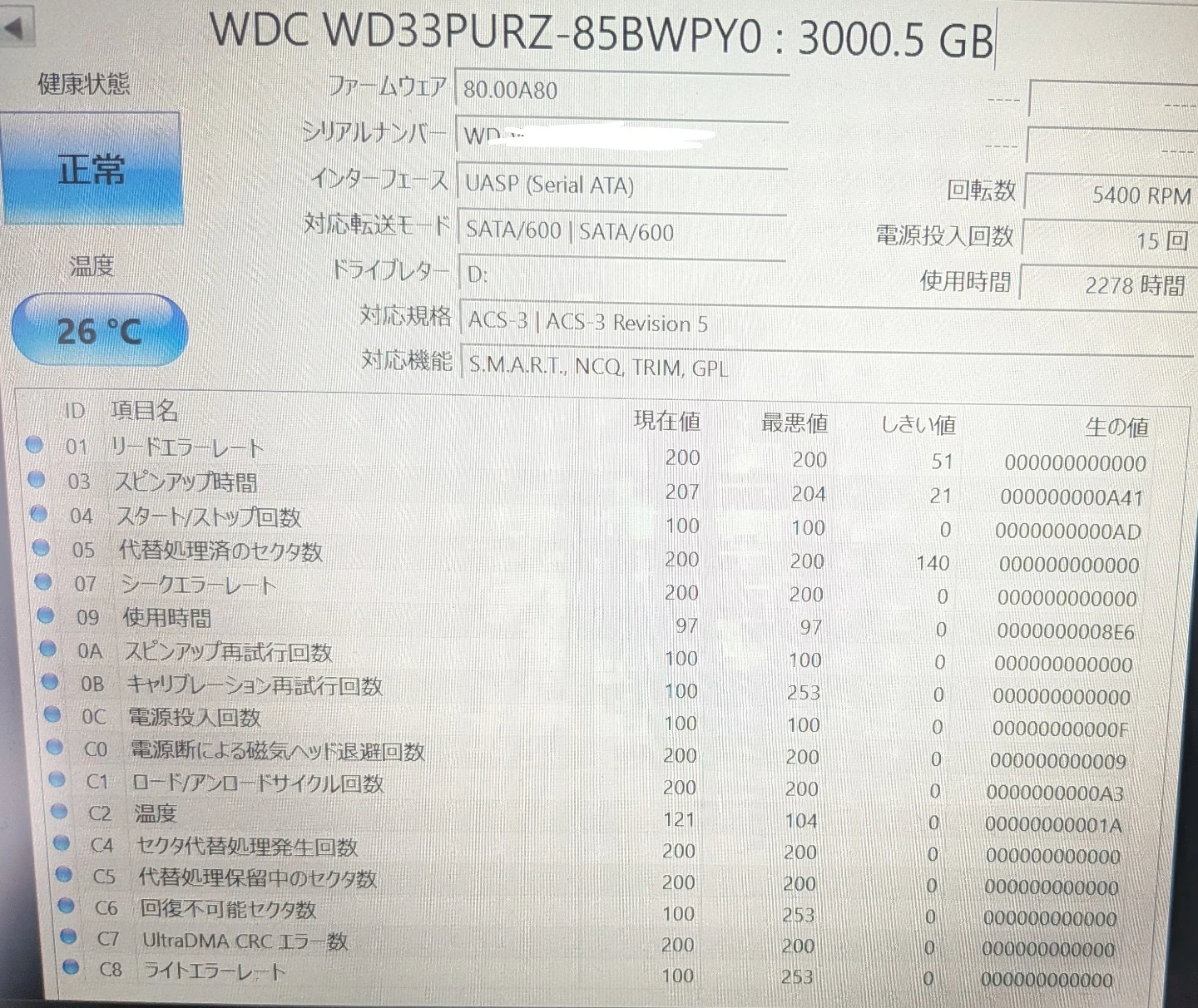 予備用だったのであまり使わずに保管しておりました。 ディスク情報もご参考までに載せました。 年末整理のため、お探しの方ぜひ! 2-3万円程で流通しているモデルです。 PCはもちろん、TV録画用途などでも定評のある人気メーカーです。 WD33PURZ [WD Purple 3TB] ブランド:Western Digital WD Purple HDD容量:3000.0 GB インターフェイス:Serial ATA HDDフォームファクター:3.5インチ