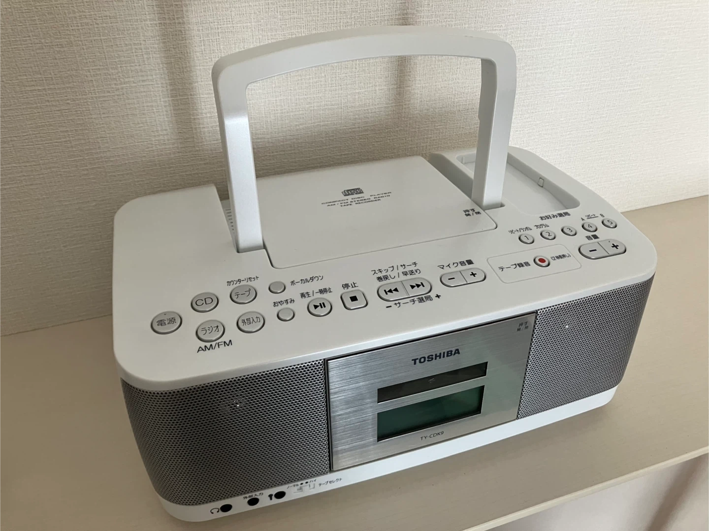 東芝のCD/AM FMラジオ/カセットテープレコーダーです。 リモコンでも操作出来ます。 電源はAC100Vまたは単二電池6本です。 少し使用感はありますが、目立つキズはなく、全て正常に作動します。 サイズ:横幅31、奥行22、高さ13(cm) 色:白 アンテナ全長:61cm ACケーブル:140cm リモコン電池:CR2025(新品) 型式:TY-CDK9 製造年:2019年 箱、説明書、単二電池はありません。 説明書はネットからダウンロード可能です。