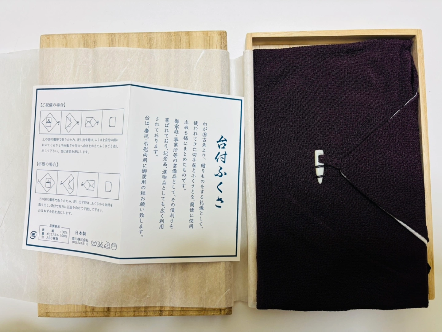 あたたかさ正絹仕立ての高級台付ふくさ 桐箱入りなので贈答品としてもお使い頂けます 【素材】 表地:絹100% 裏地:ポリエステル100% 盆:ABS樹脂 盆の表面は朱色慶事用、裏面緑系弔事用のリバーシブル 【サイズ】約34cm×約34cm 盆のサイズ:約12cm×約19cm 【製造】日本製 国産 Made in Japan