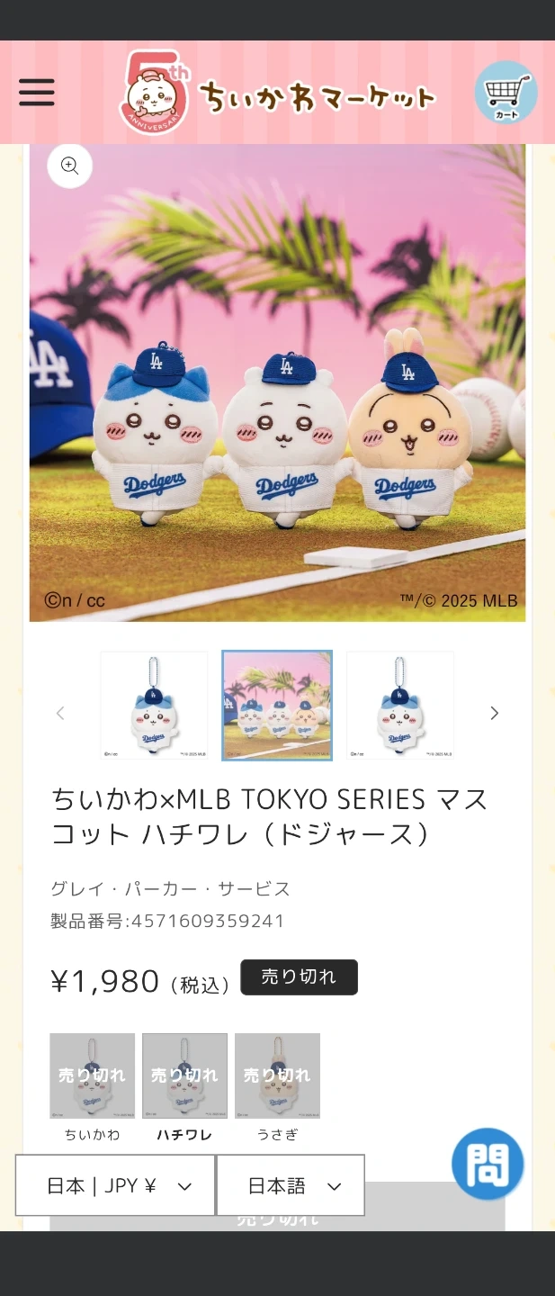 ・ちいかわ ・MLB ・ドジャース ・マスコット 大谷さんのドジャースMLB公認品 先日渡航先で、購入した内の1個だけ、ファンの方にお譲りします。 某サイトでかなり高値で、取り引きされていますが、とっても可愛いので、 ちいかわファンに。 別途