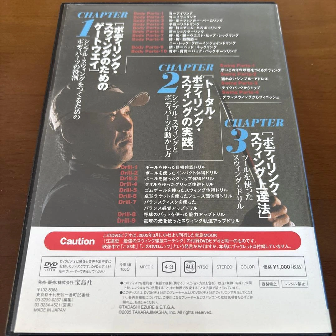 ゴルフスイングの基本を学べるDVDです。 - タイトル: 江連忠のパーフェクトスイングの徹底コーチング - 著者: TADASHI EZURE - 内容: ゴルフスイングの基本とドリル - 章立て: 全3章 - DVD内容: ゴルフスイングの実践と理論 - 価格: 1,000円 ご覧いただきありがとうございます。 ご希望の方はお気軽にご連絡ください。
