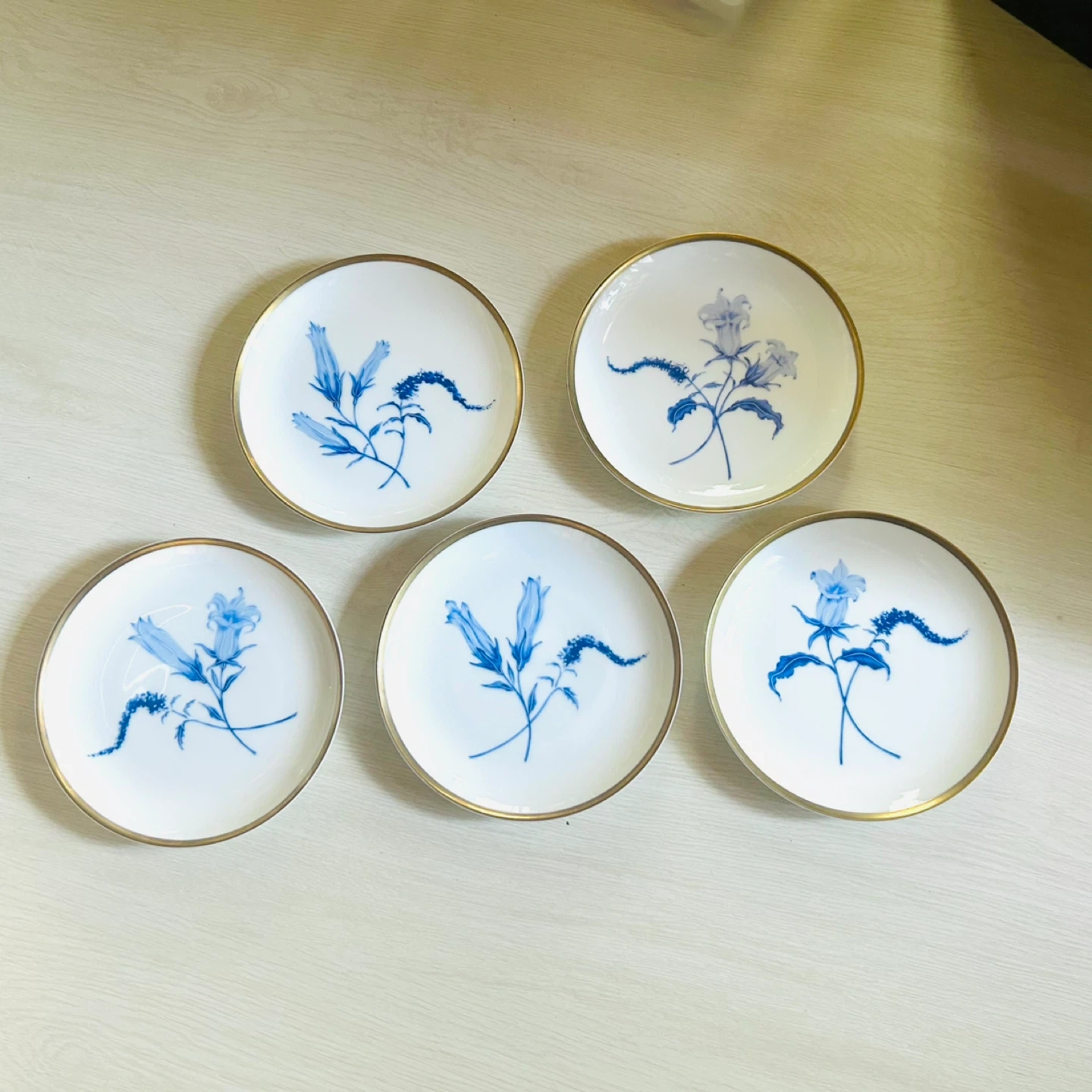 深川磁器 ロイヤルブルー 5枚違う絵柄のプレートセットです。 裏側にキミジマのサインが入っています。 長期保管しており、写真にはうまく映りませんでしたが細かいスレが見えるものもあります。 ほとんど使っていないはずですが、未使用ではありませんのでご理解くださる方、よろしくお願いいたします。 約16cmほどです。 青の色合いがとても綺麗です。