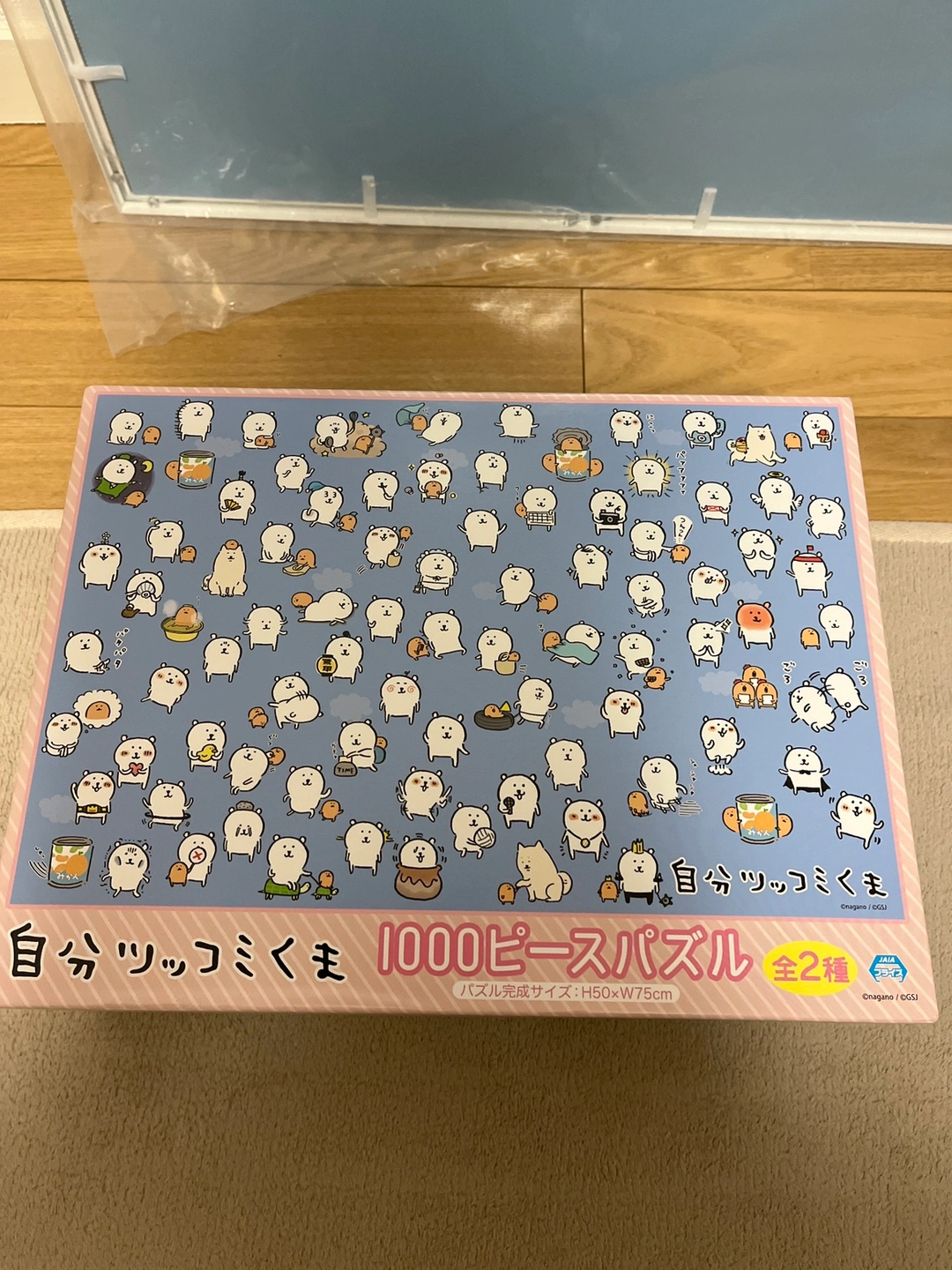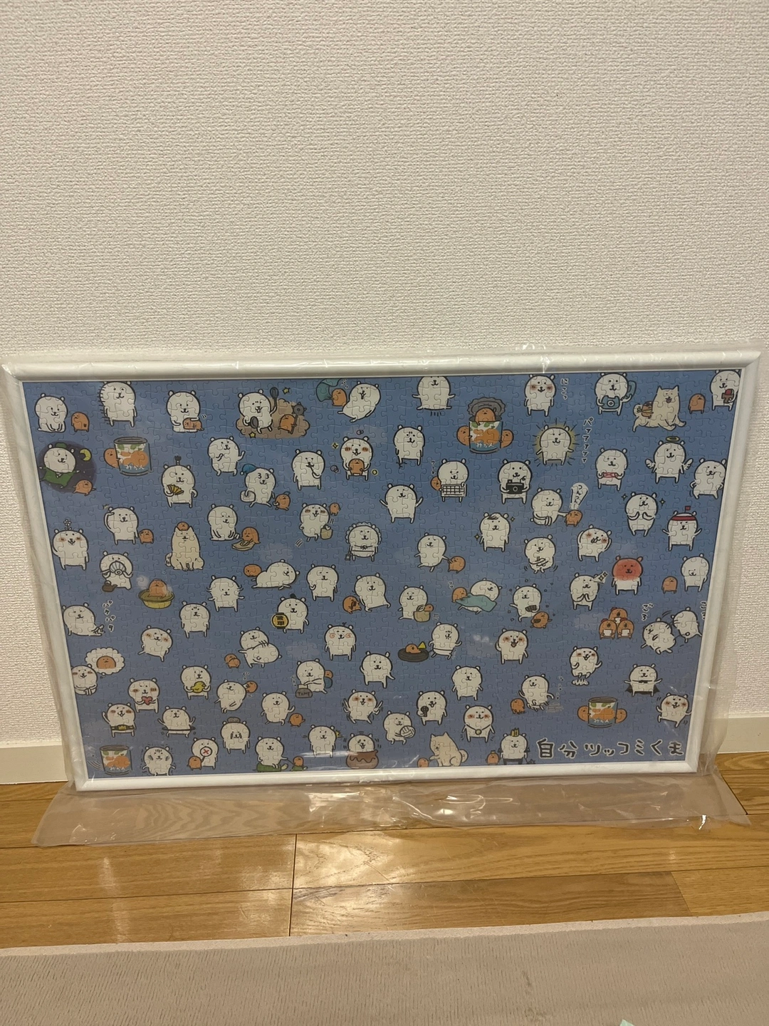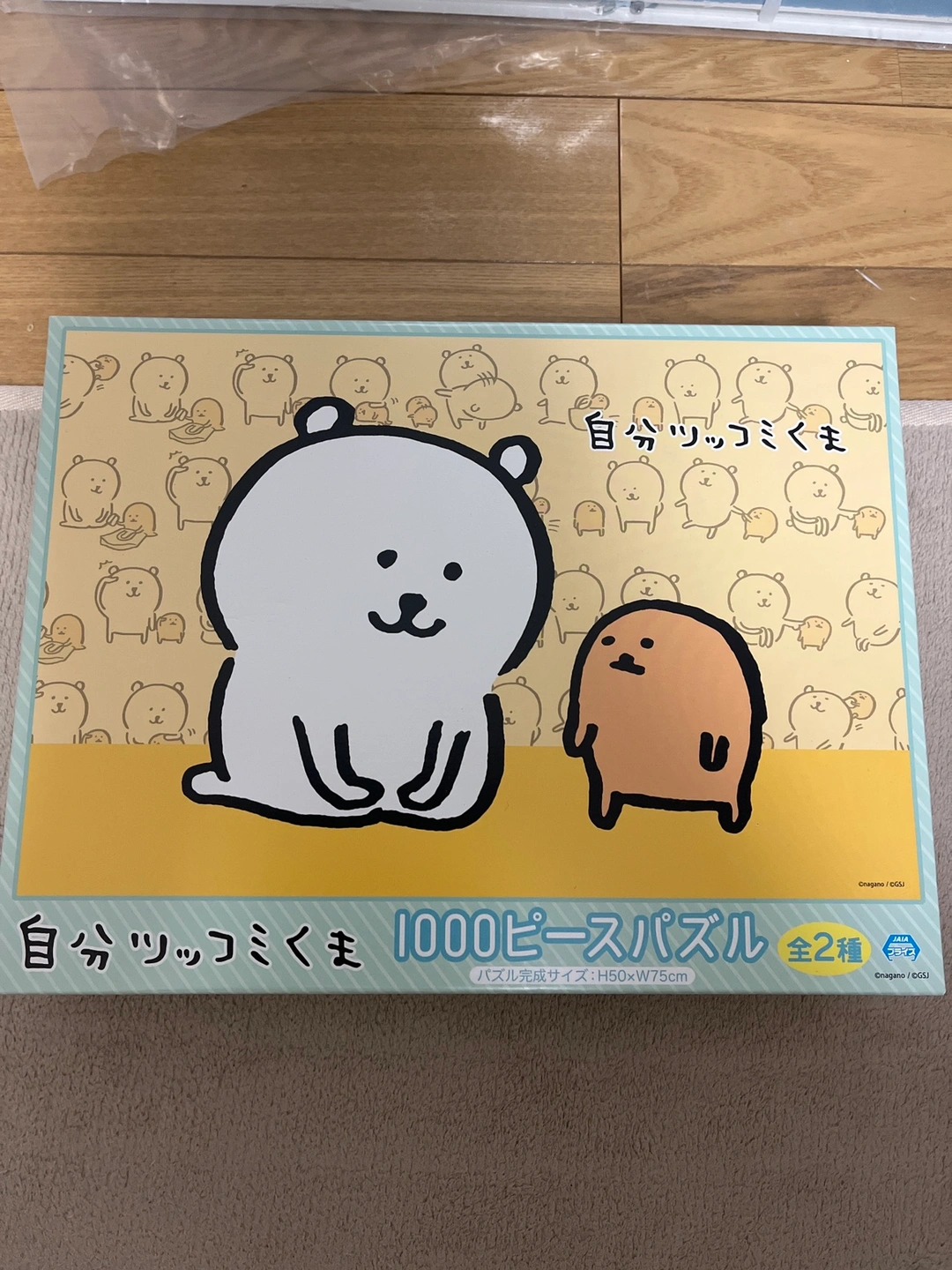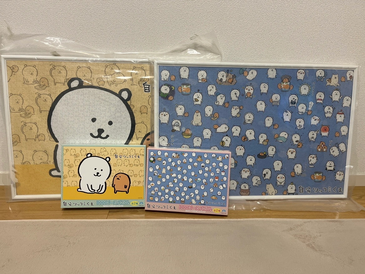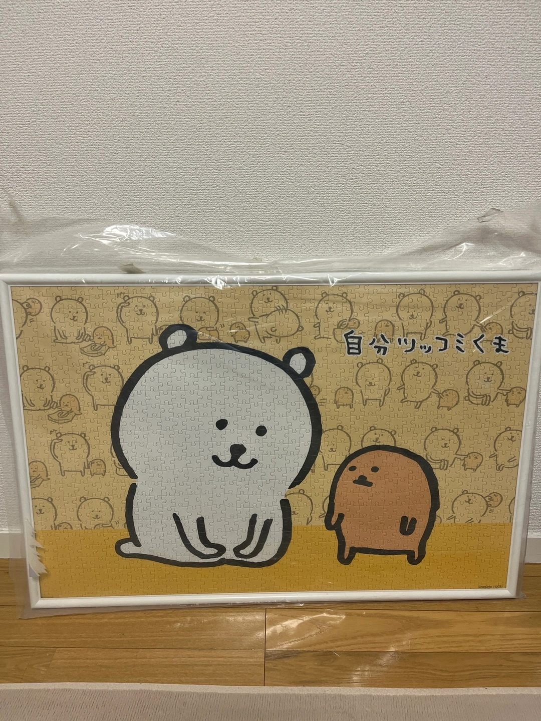 ちいかわで超有 名になった ナガノ の自分ツッコミくま 1000ピースパズル 全2種類セット ホワイトの額もセットでお譲りします。 サイズは各縦50cm×横75cm 完成品です。 糊付けはしていないので、再度組み立ても可能です。 箱も付いています。 作成後は、クローゼット内で保管していたので、陽にはあたっていません。 これからの梅雨の時期にお家で過ごす際におすすめです。 大切にしてくださる方にお譲りできると嬉しいです。