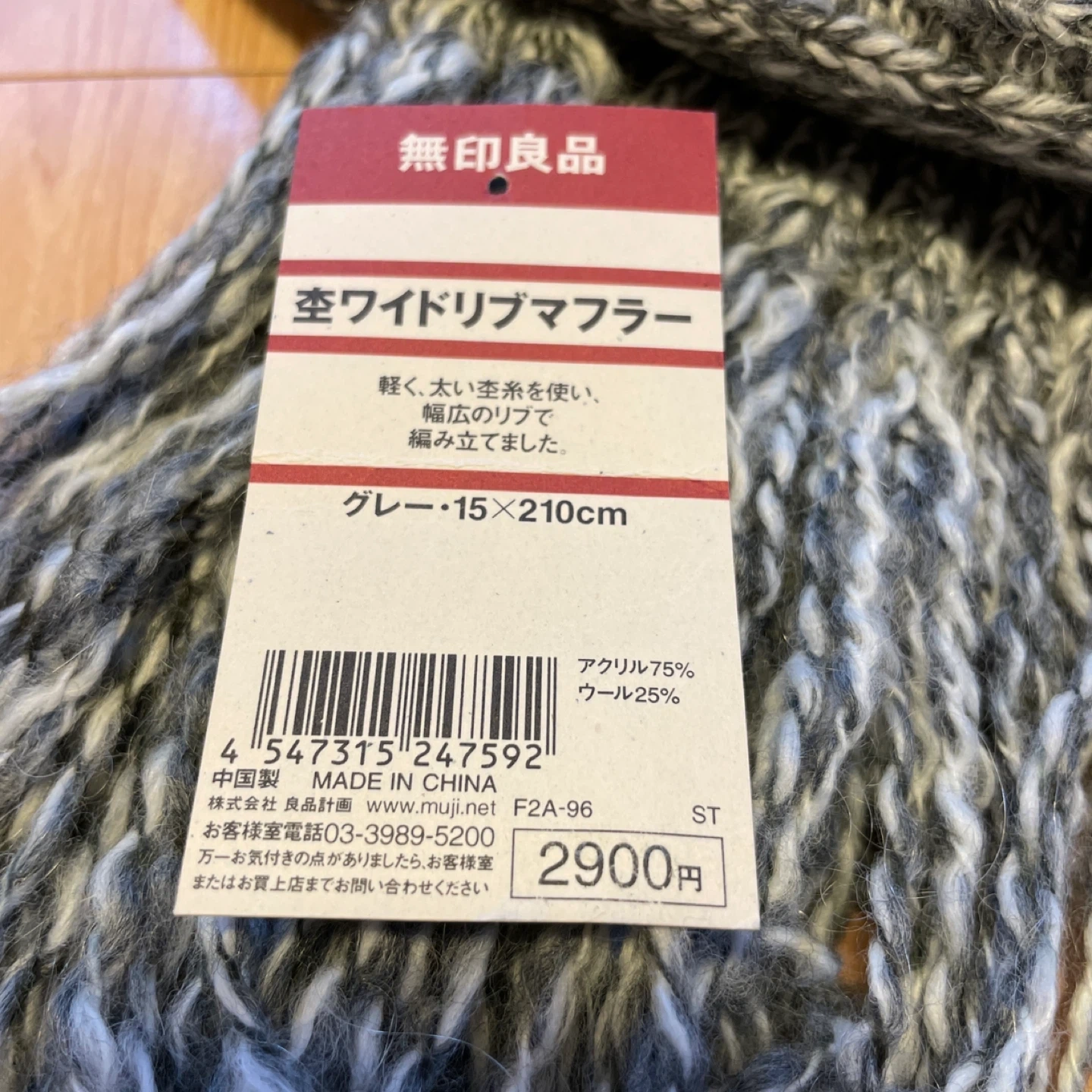 実家のクローゼットに保管してあった無印良品のタグ付き新品未使用のマフラーです。 この先も使う予定がないとのことで、欲しい方にお譲りします。 無印良品 杢ワイドリブマフラー カラー グレー サイズ 15×210㌢ アクリル×ウール混でボリュームもあり、暖かそうで、まだまだこれからの季節に最適だと思います。 タグ付き新品未使用品ですが、実家のクローゼット保管にご理解ある方のみ購入をご検討ください。 我が家にも実家にもペット、喫煙者はおりません。 プロフィールご参照ください。 無印良品のマフラーです ・カラー:グレー ・サイズ:15×210cm ・素材:アクリル75%、ウール25% ・定価は2,900円でした 中古品であることご了承ください