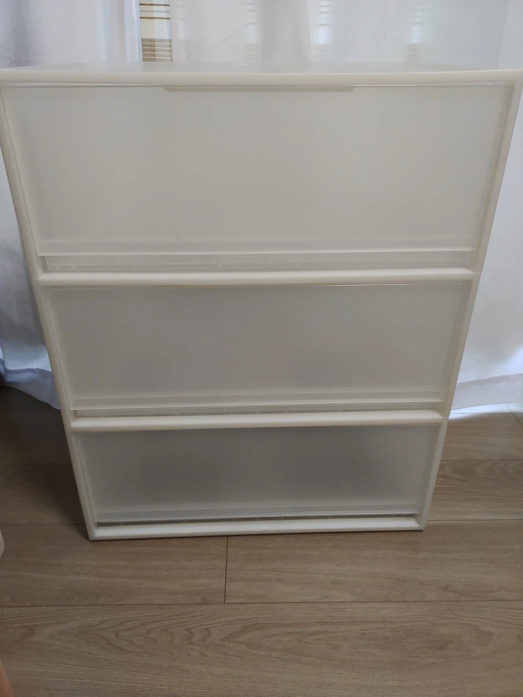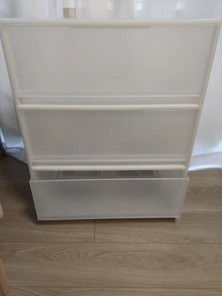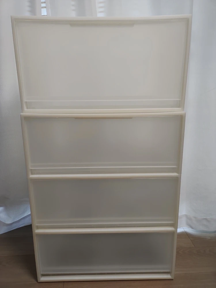 無印良品 ポリプロピレン収納ケース・横ワイド(約幅55×奥行44.5cm) 下3段は縦 約23cm(キャスター付き) 上1段は縦 約29cm おそらく6年くらいは使用 細かな傷はあると思います。 上に物を乗せて使っていたのでたわんでいる箇所がいくつかありますが引き出すのも割とスムーズに問題なく使えます。 タバコなどは吸いませんので ヤニなどの汚れはありません ※もうひとつ下記と同じものがあります。 (1段は縦 約29cm) ご希望の方はお伝えください。