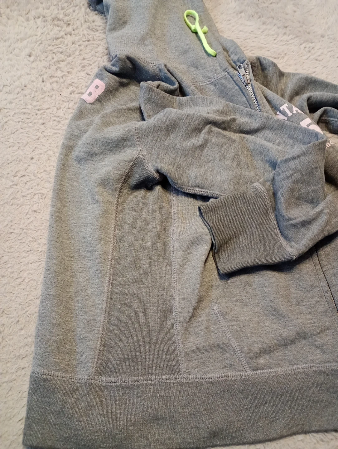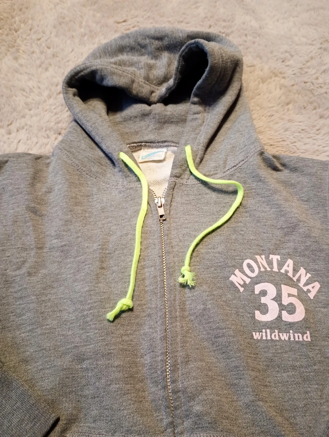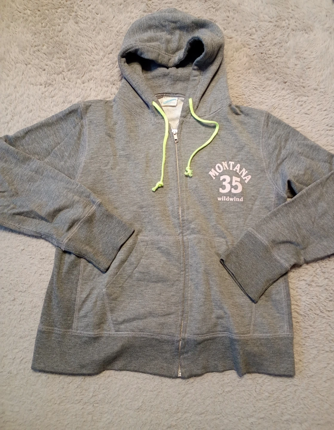 レディース グレーのパーカーです サイズは、Smallサイズ サイドには、生地が伸縮性のある切り替えになっています。 お子さんにも活用可能です。 ・色:グレー ・素材:綿64%、ポリエステル36% ・前面に「Montana 35 wildwind」の文字 ・背面に「Jonson,B 30」の文字 ・使用感は少し。(汚れなく、使用感はあまりないと思う) 着丈56センチ、身幅46センチ、肩幅40センチ 中古品であることご了承ください。