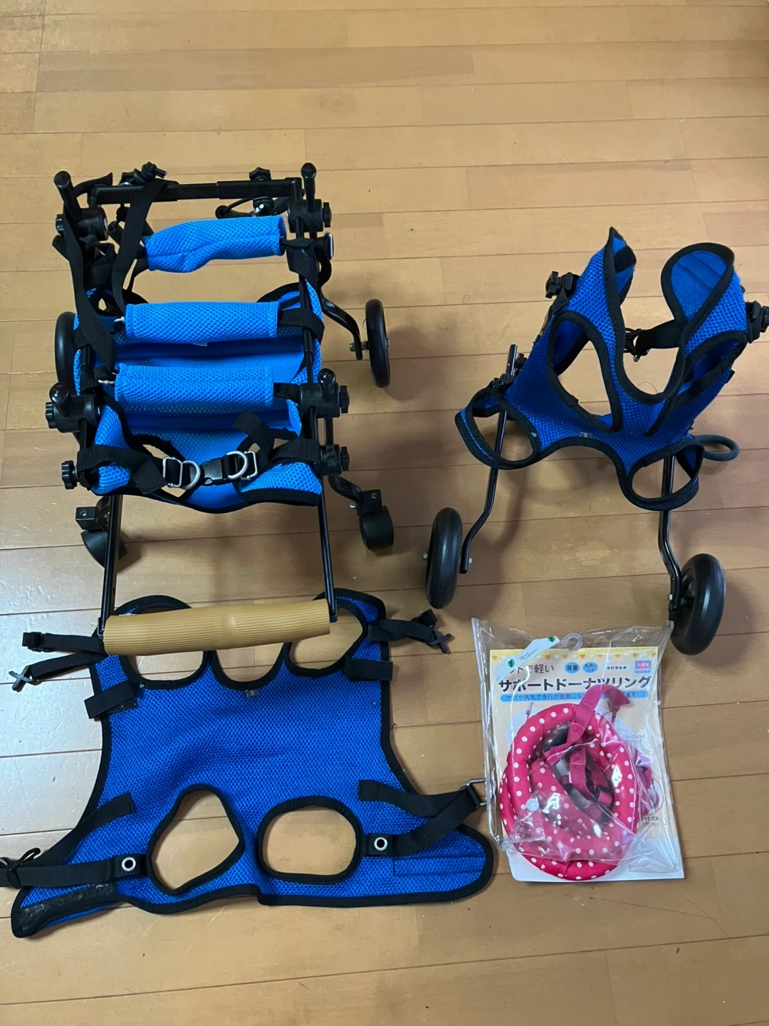犬用の歩行器です ・色:青 ・付属品:サポートドーナツリング(ピンクの水玉模様) ・使用感はありますが、使用には問題ありません ・サイズ: 小型犬用 中古品であることご了承ください