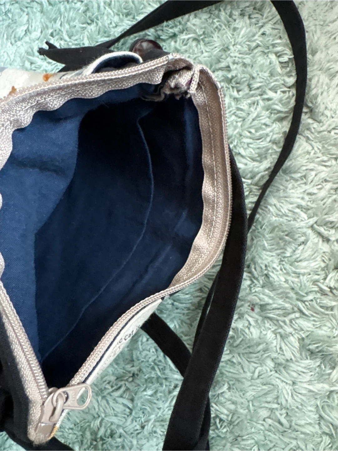 品川プリンス内のショップで購入しました。 本体はファスナー付き。外ポケット、中にもポケットがあります。 ほとんど使ってませんが、いつついたのか上側の縁にピンクの汚れがあります。 上側に折れ癖がついてます。 縦 25 横17