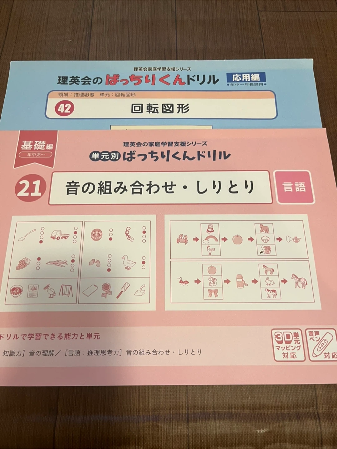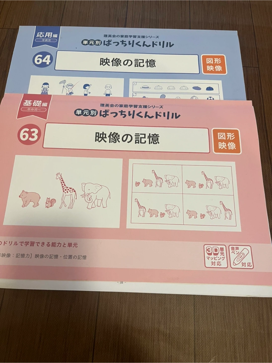理英会の幼児教材ドリルです。 ・ばっちりくんドリル 応用編 回転図形(42) ・ばっちりくんドリル 基礎編 音の組み合わせ・しりとり(21) ・ばっちりくんドリル 応用編 映像の記憶(64) ・ばっちりくんドリル 基礎編 映像の記憶(63) コピーして使用していましたので比較的綺麗ですが、回転図形のドリルのみ数カ所書き込みがあります。 中古品であることをご了承ください。