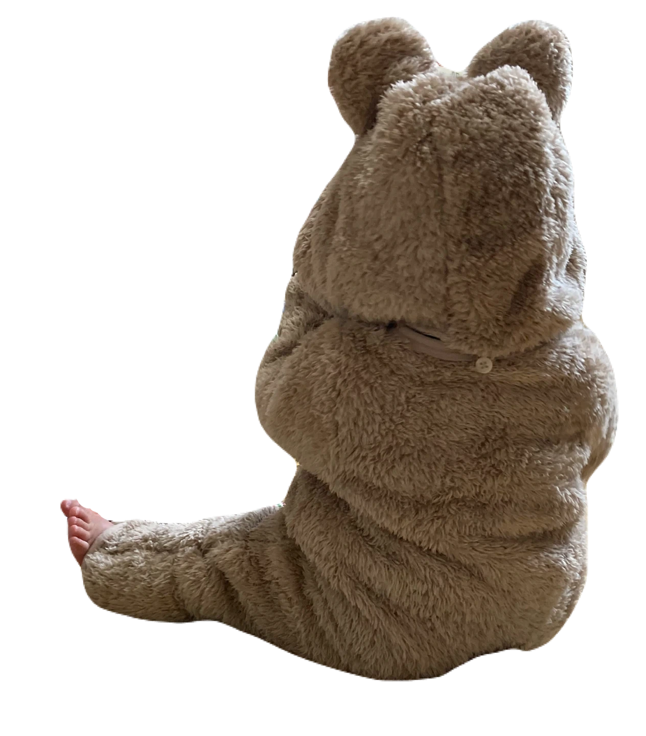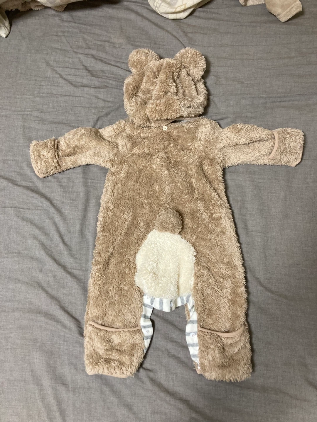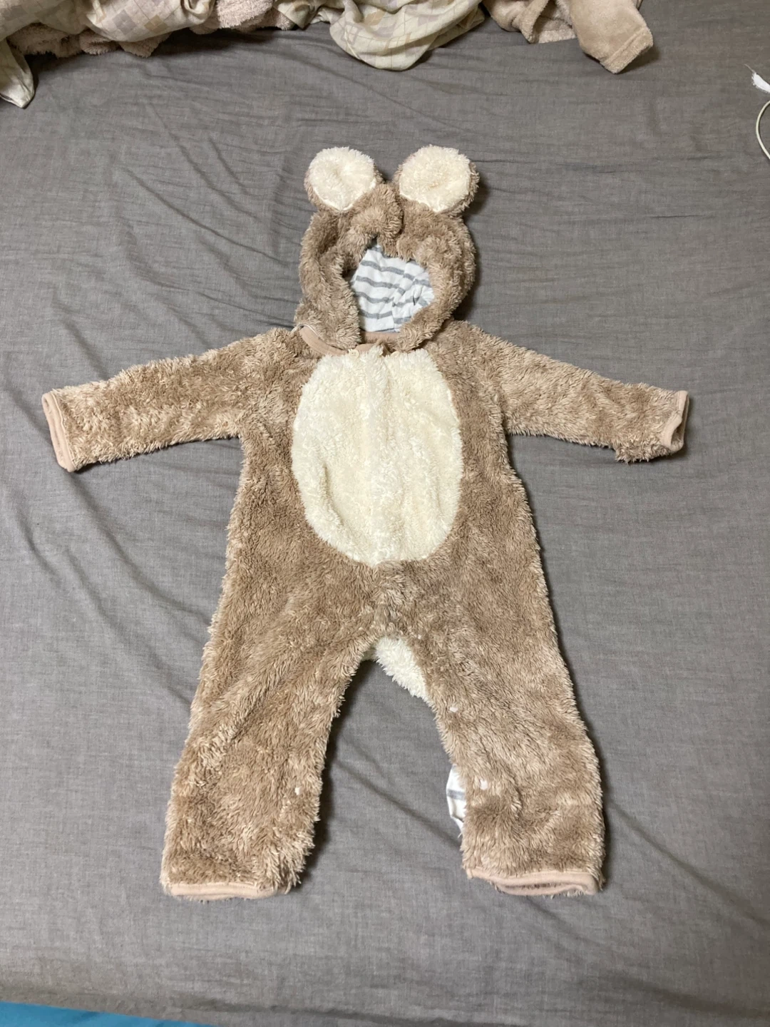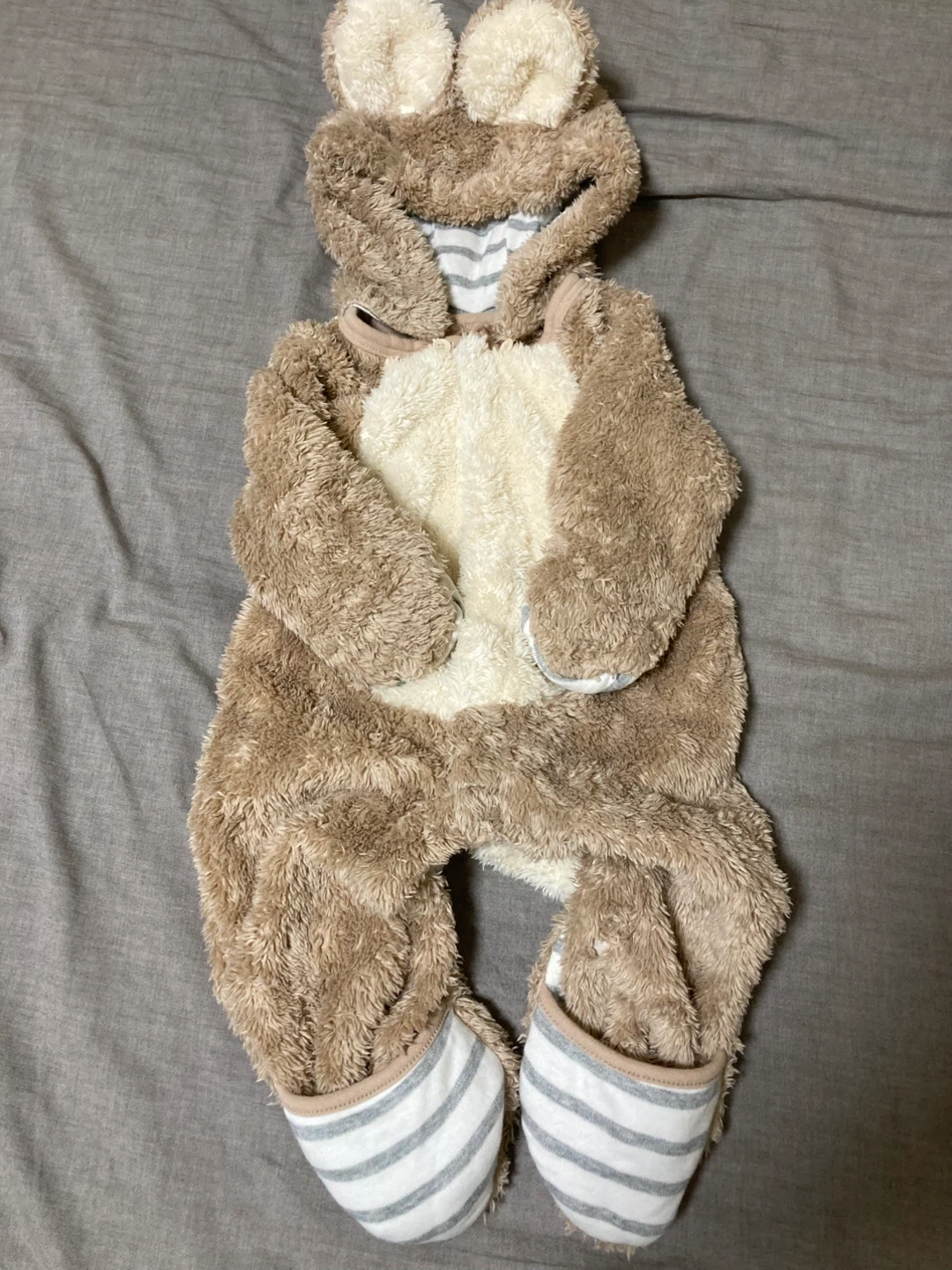 着ぐるみカバーオールです。  ベルメゾンで購入したもので、商品サイトでは“ねずみ”とありましたが、我が家ではクマという認識でした(笑) 帽子の取り外し可能。 手足の先はくるっと返すと、完全にカバーできるのでベビーカーや抱っこの時の防寒にバッチリです✨(写真3枚目) 股下までスナップボタンなので着せるのは大変ですが、着た瞬間からかわいい子グマが爆誕します☺️ 目立った汚れはありませんが、 中古品であることをご了承ください。