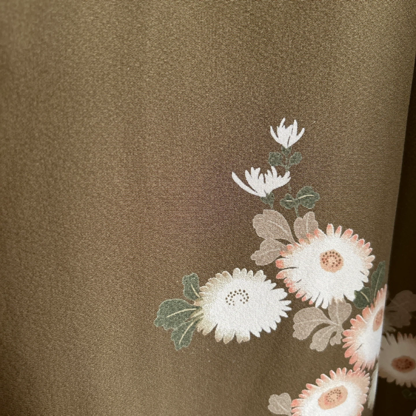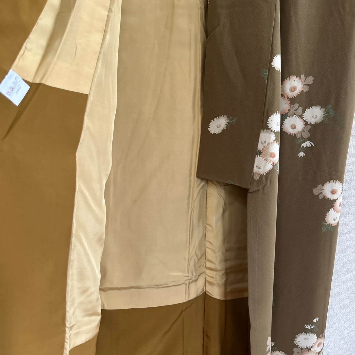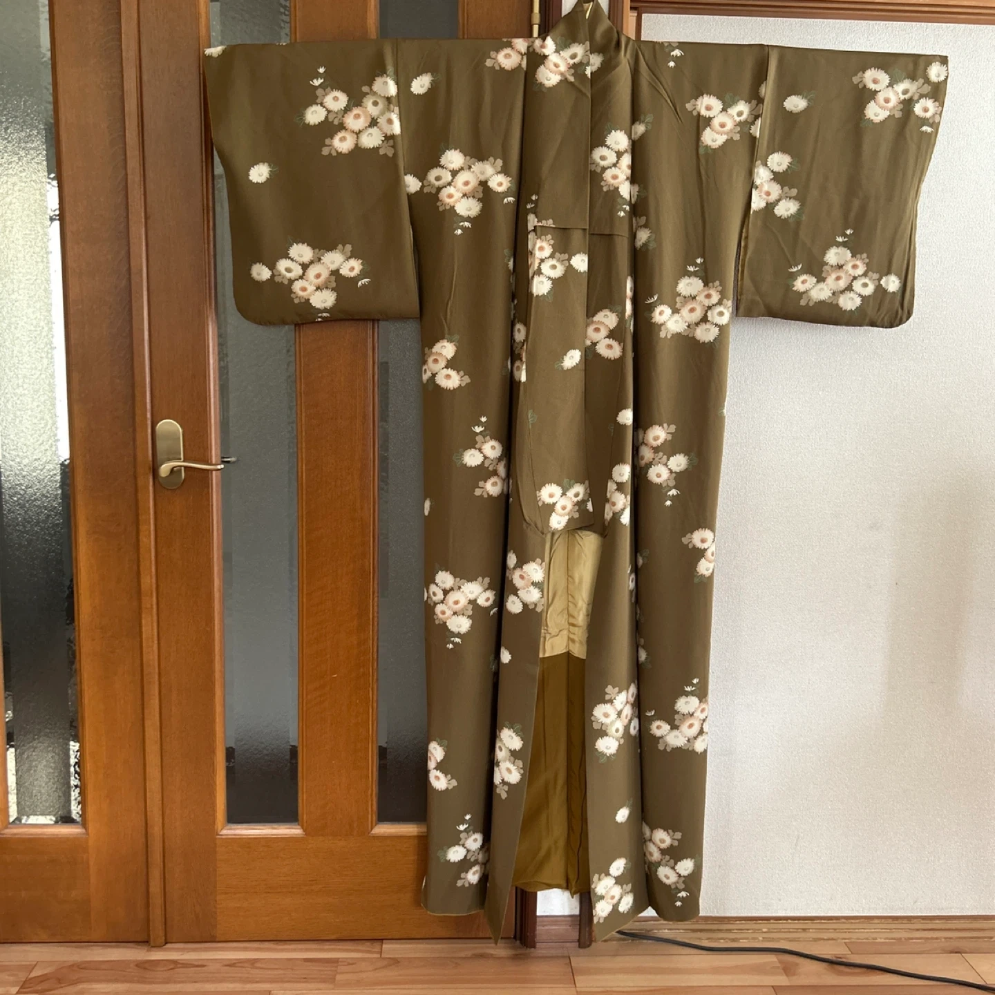 購入以来一度も着用の機会がなく、箪笥に眠っていました。 - 色: オリーブグリーン - デザイン: 菊柄 - 素材: 絹100% サイズ詳細は写真10枚目でご確認ください。 タグを挟んだまま保管していたので裏地に跡があります(写真9枚目)が、クリーニングで落ちる可能性もあると思います。表には全く響いていません。 自宅保管の品である旨ご了承いただき ご検討よろしくお願いします。 #和物語 #着物 #袷 #和服 #秋 #菊