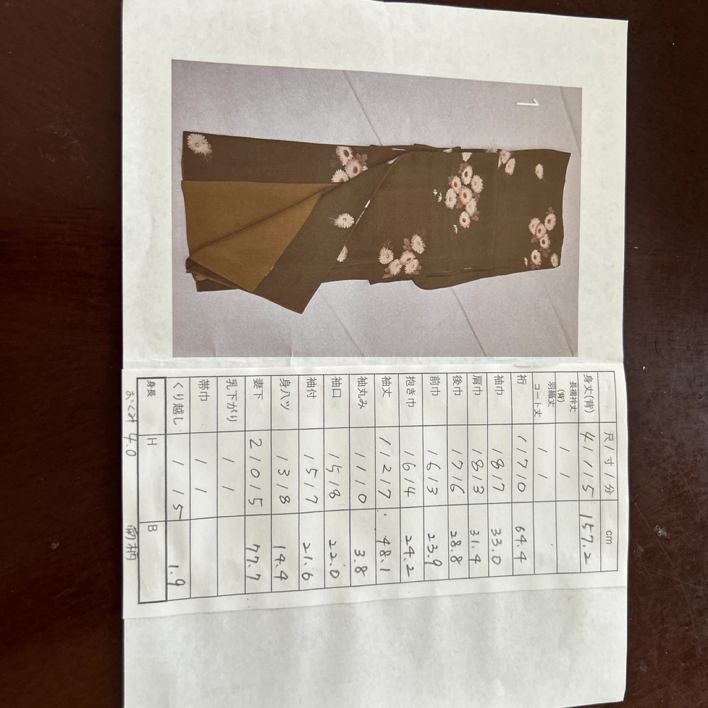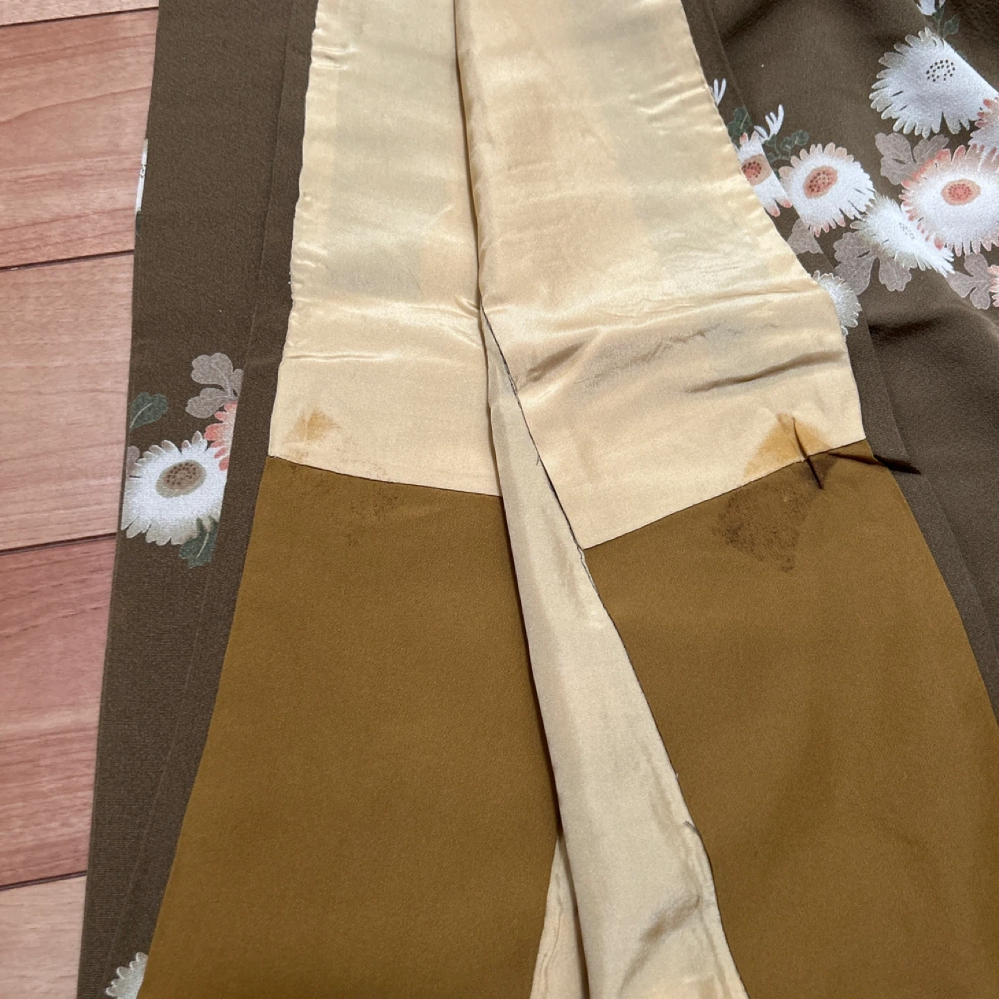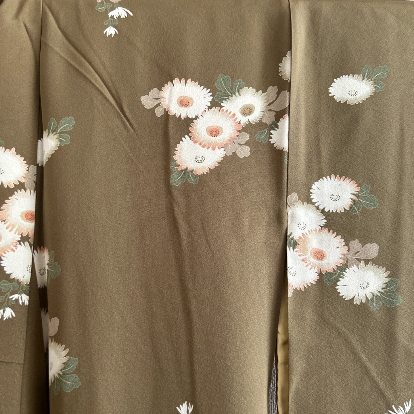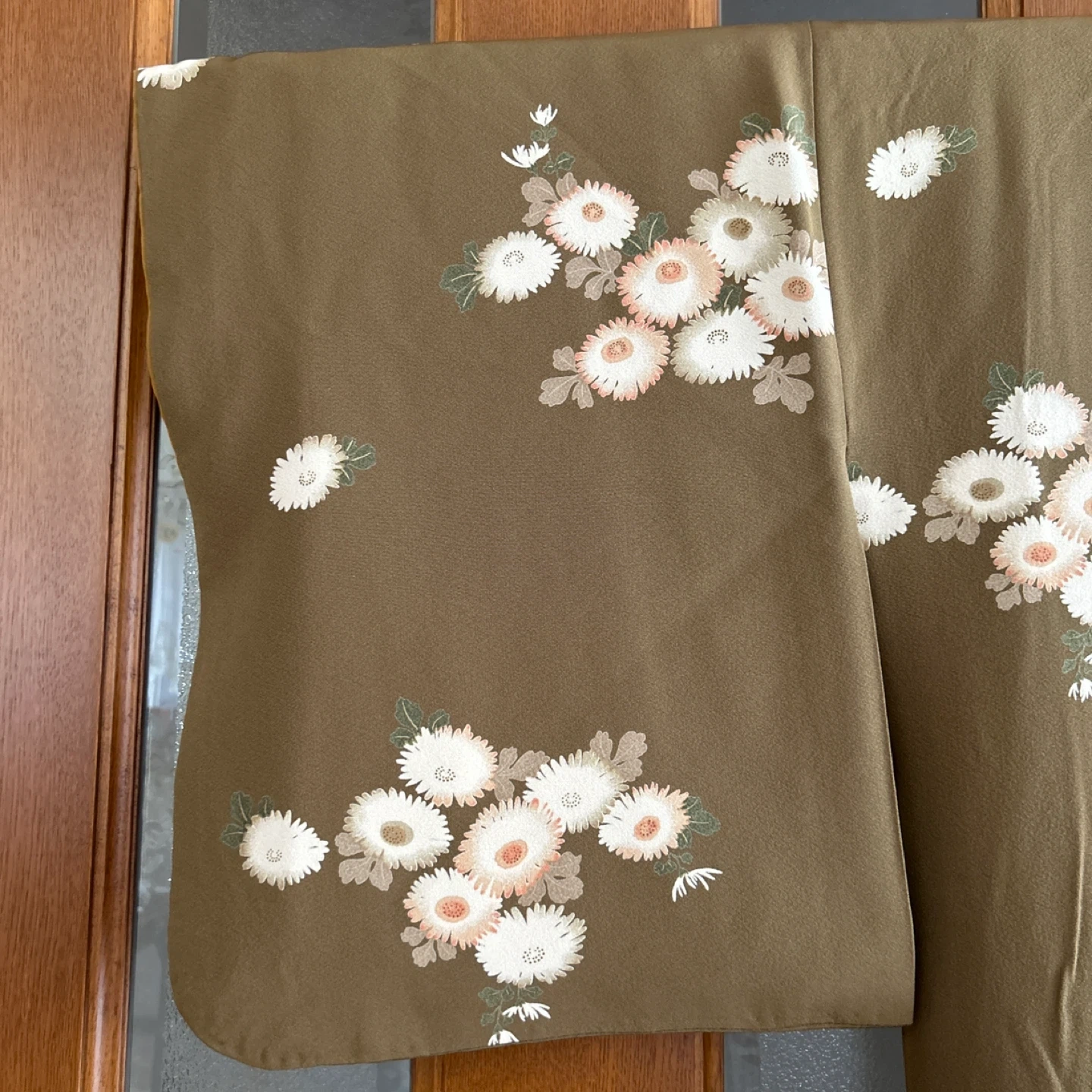 購入以来一度も着用の機会がなく、箪笥に眠っていました。 - 色: オリーブグリーン - デザイン: 菊柄 - 素材: 絹100% サイズ詳細は写真10枚目でご確認ください。 タグを挟んだまま保管していたので裏地に跡があります(写真9枚目)が、クリーニングで落ちる可能性もあると思います。表には全く響いていません。 自宅保管の品である旨ご了承いただき ご検討よろしくお願いします。 #和物語 #着物 #袷 #和服 #秋 #菊