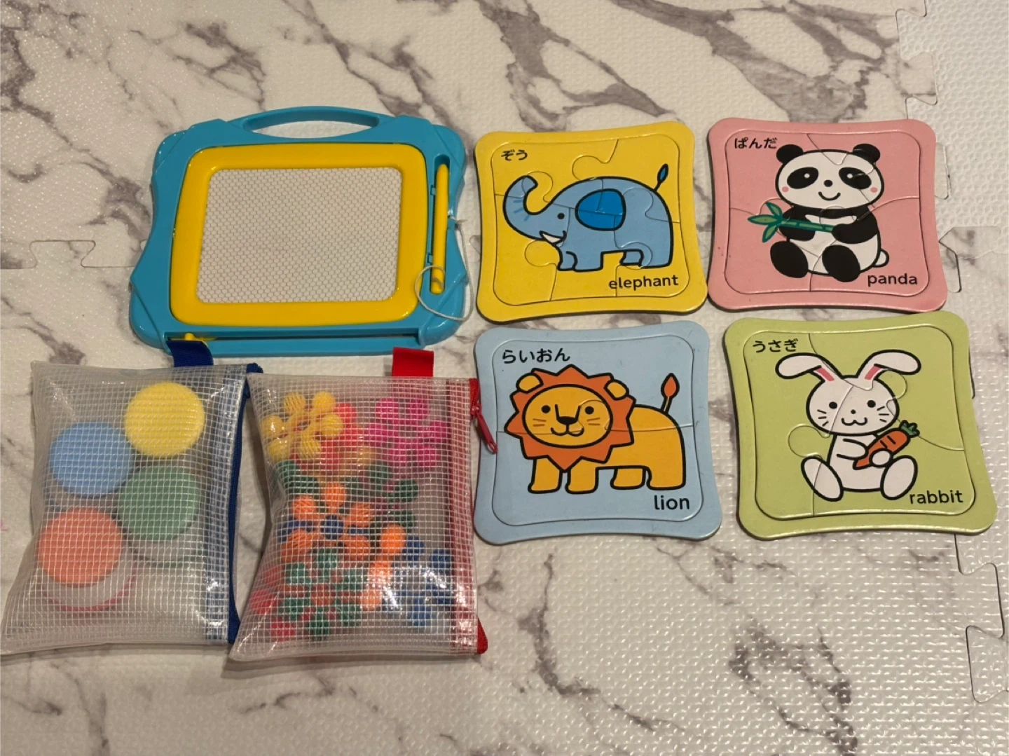 知育玩具のセットです ・お絵かきボード ・動物パズル(ぞう、パンダ、らいおん、うさぎ) ・おもちゃの容器 4個 ・フラワーブロック 1歳頃コペルに通っていた時に実際教室で使ったような教材を集めました おもちゃの容器は蓋を外して色のマッチングができます 中古品であることご了承ください