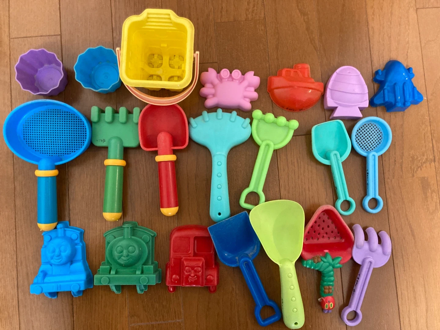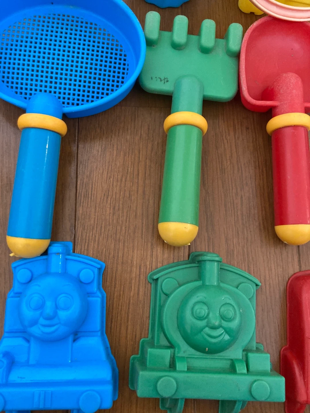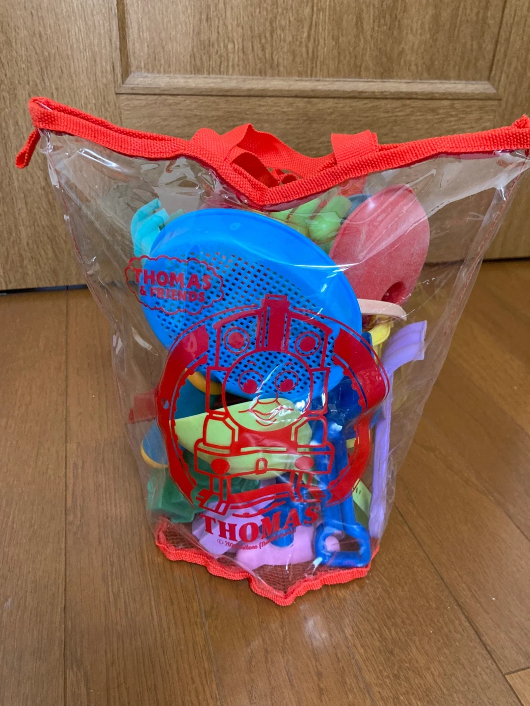 砂場遊びセットです。 これからの時期は、雪遊びでも重宝します。 主に型抜き、シャベル、熊手、フルイです。小さいバケツもあります。 使用感あり、洗っても汚れ・スレ・傷等あります。 名前有りです。ご了承ください。そのまま使っていただいても構いません。 未使用のトーマスの透明バッグもありますので、それに入れてお渡しします。