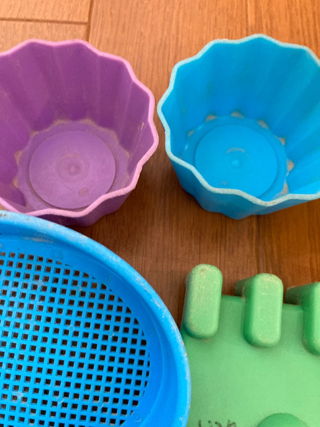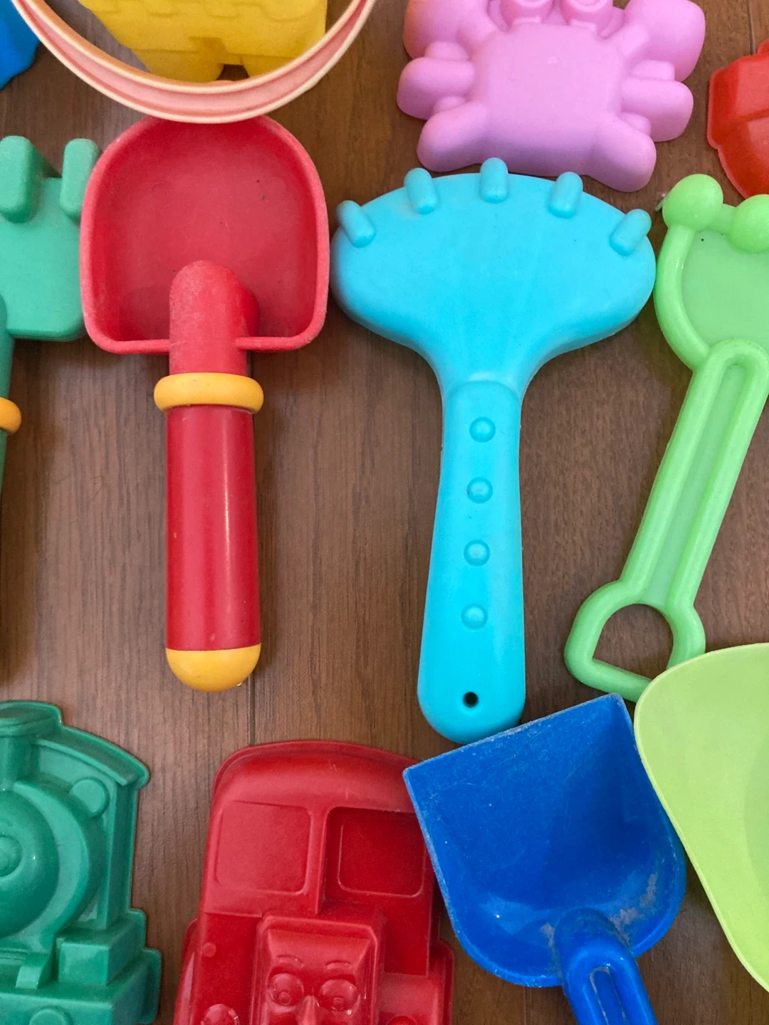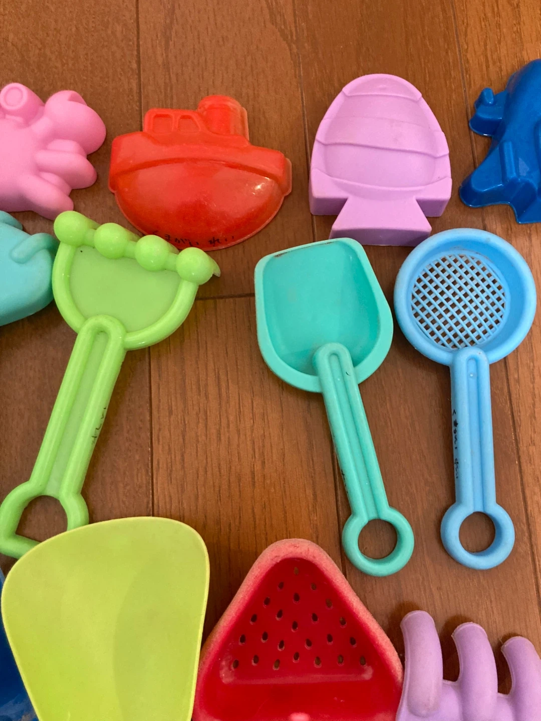 砂場遊びセットです。 これからの時期は、雪遊びでも重宝します。 主に型抜き、シャベル、熊手、フルイです。小さいバケツもあります。 使用感あり、洗っても汚れ・スレ・傷等あります。 名前有りです。ご了承ください。そのまま使っていただいても構いません。 未使用のトーマスの透明バッグもありますので、それに入れてお渡しします。