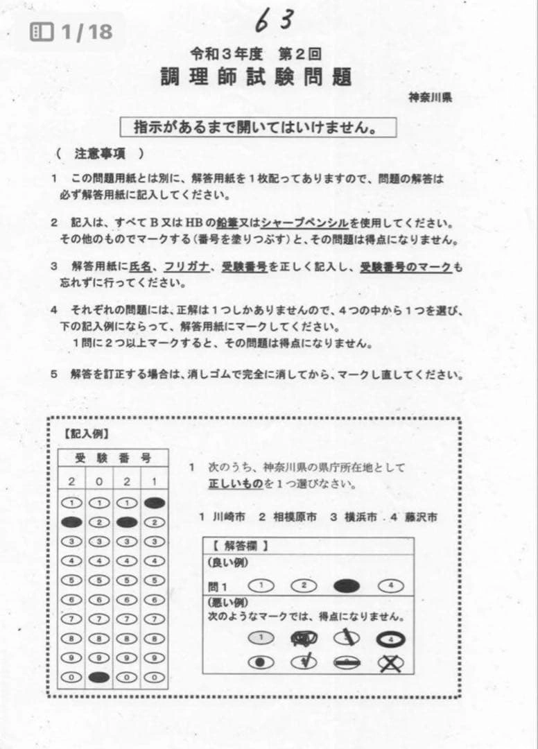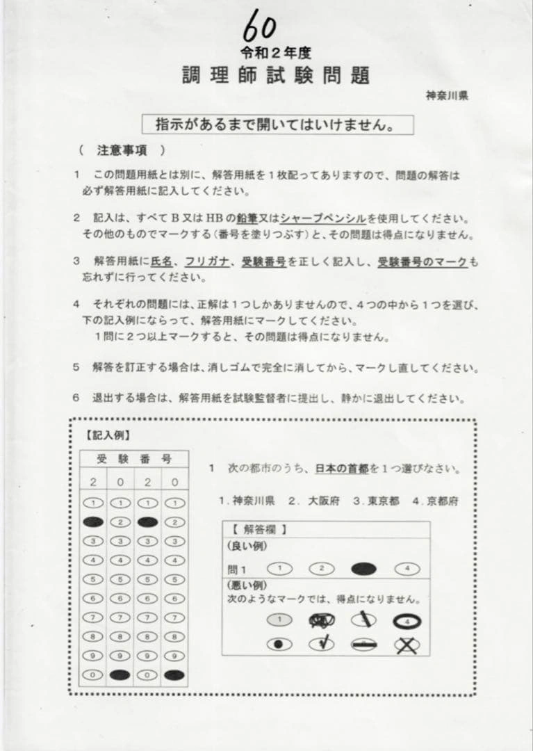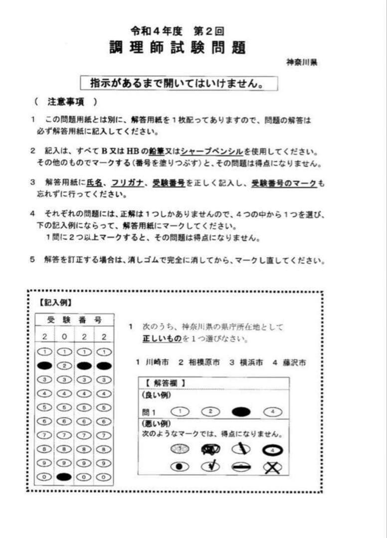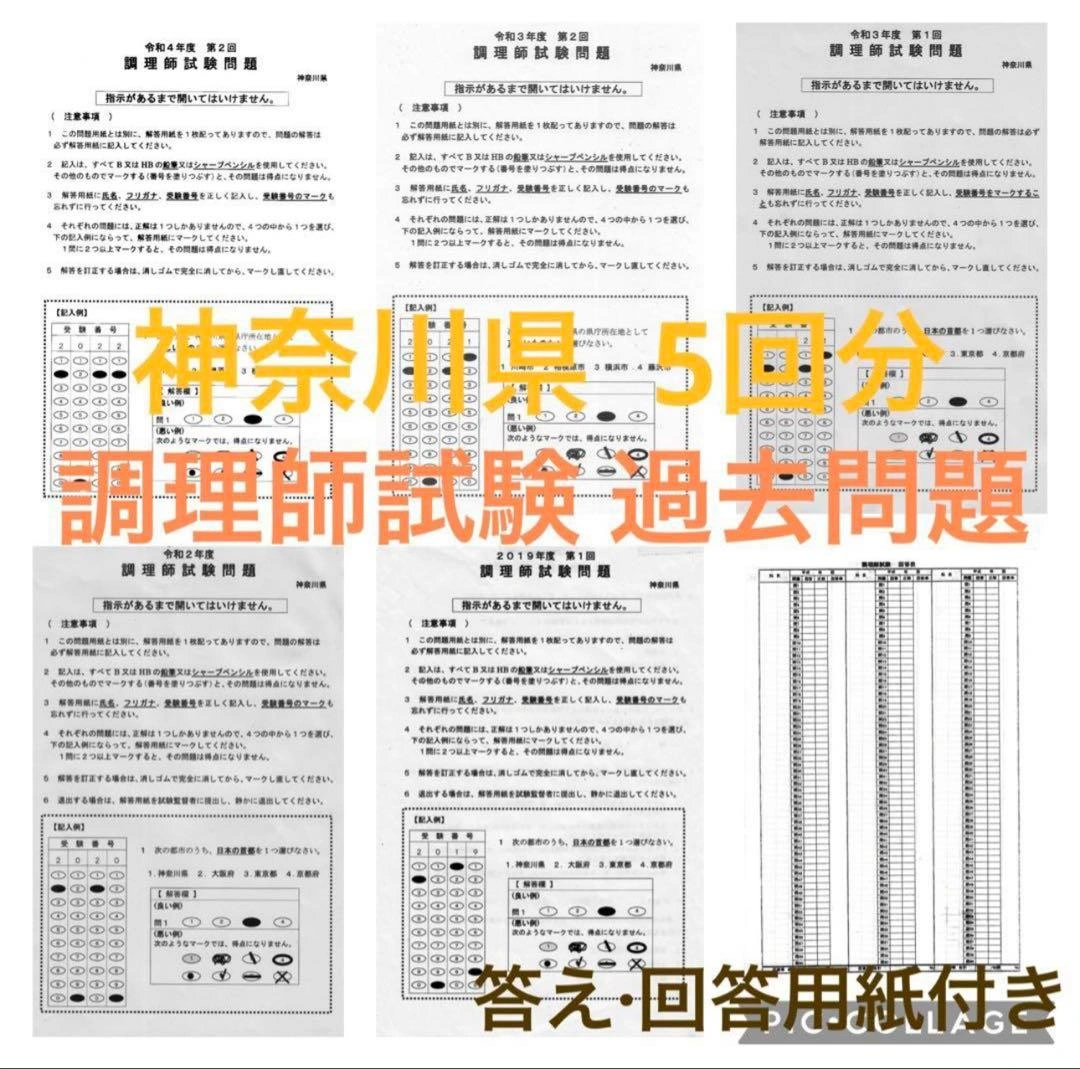 あたたかさ令和4年、令和3年2回分、令和2年、令和元年の神奈川県の調理師試験問題、実際の試験の過去問題5回分と解答、独自の答案用紙を印刷したものになります。 問題文に印がある箇所があります。写真でご確認をお願いいたします。 神奈川県の試験問題は独特なため、過去問をやり込むと試験の特徴が学 べます。 公益社団法人調理技術技能センターの過去問題もありますので、ご希望の方はお声かけください。 ペットや喫煙環境とは無関係です。 商品の梱包にリサイクル品を使用する場合があります。ご了承ください。 他のサイトでも出品しておりますので、急に削除する場合があります。 ご質問等ございましたら、お気軽にお問い合わせください。