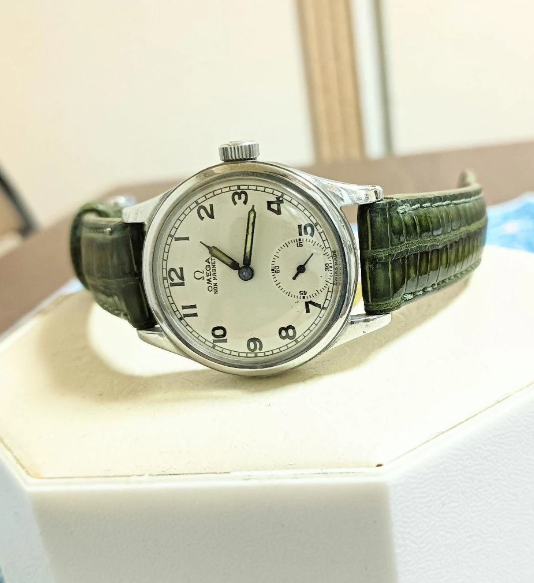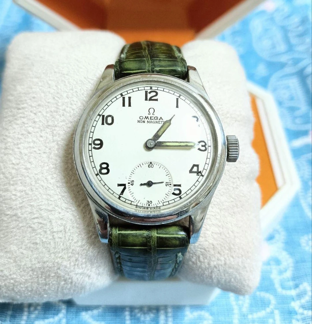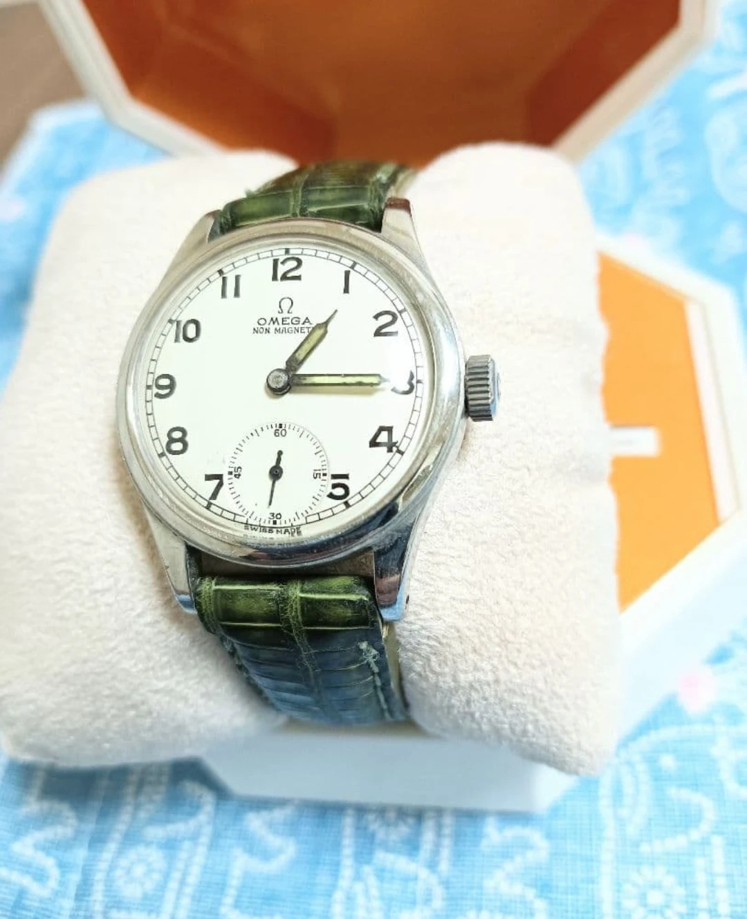 ★★ こちらのOMEGAも稀 少品。 OMEGA オメガ NON MAGNETIC スモールセコンド 手巻き式 腕時計。 正確作動 日差±約10秒 ★★ こちらも音叉時計同様に稀少な、 OMEGAの名機!磁気帯びをバリア。 ノンマグネティック腕時計。 ★★ 写真の通りヴィンテージとしては全体的にも非常に良い状態ですが、使用に伴う微かなスレはご容赦。 裏蓋に当時所有してた海外の方の記念の刻印が有るのでご容赦願います。 ★★ 腕周り フリー 社外ベルト color シルバー&ホワ こちらは現物のみとなります。 ★★ 手巻き式のOMEGA腕時計、稀少なノンマグネティックが特徴。 - ブランド: OMEGA - カラー: ホワイト・シルバー - バンド素材: レザー(グリーン) - 特徴: 手巻き式 ノンマグネティック - ダイヤルタイプ: アナログ