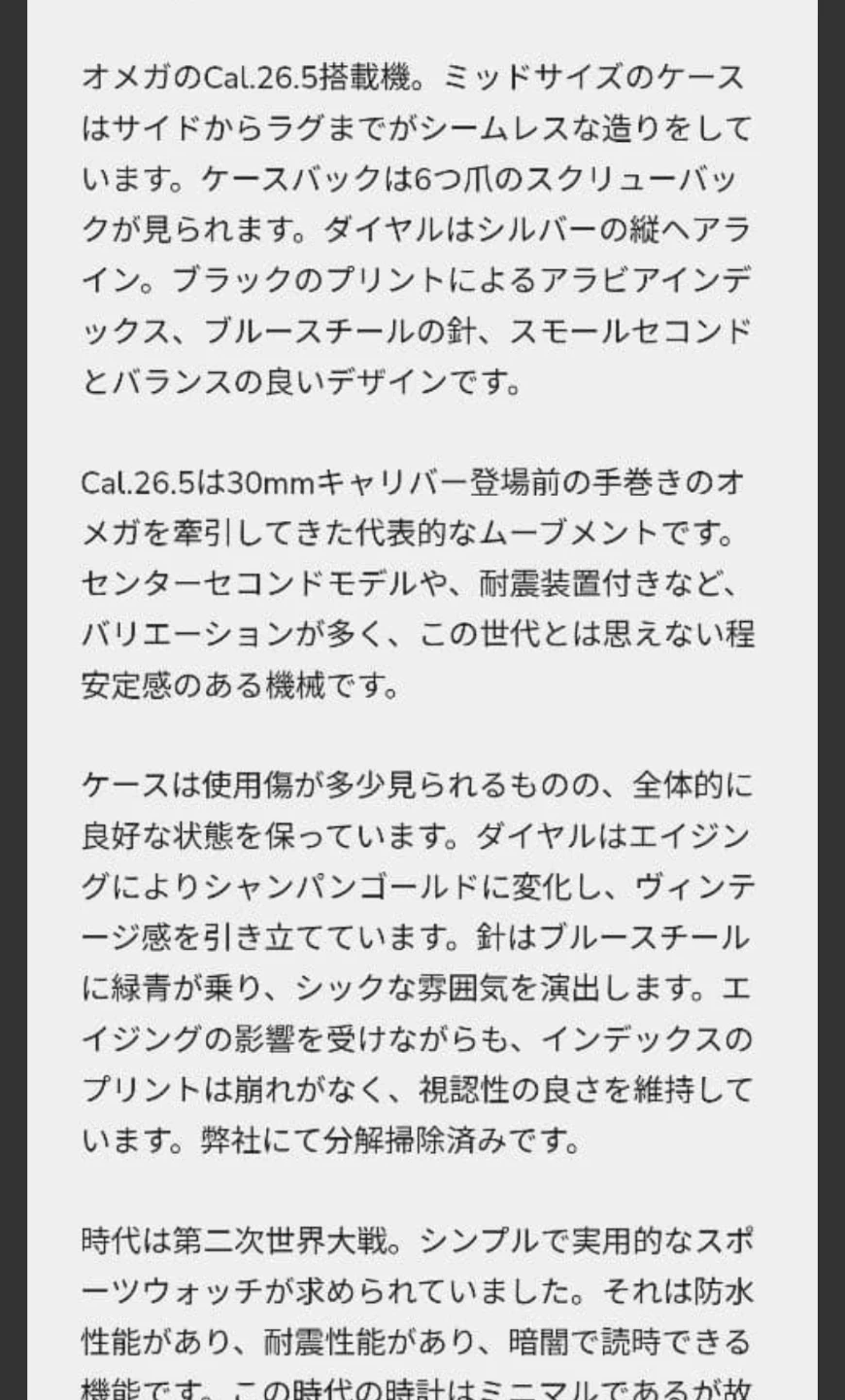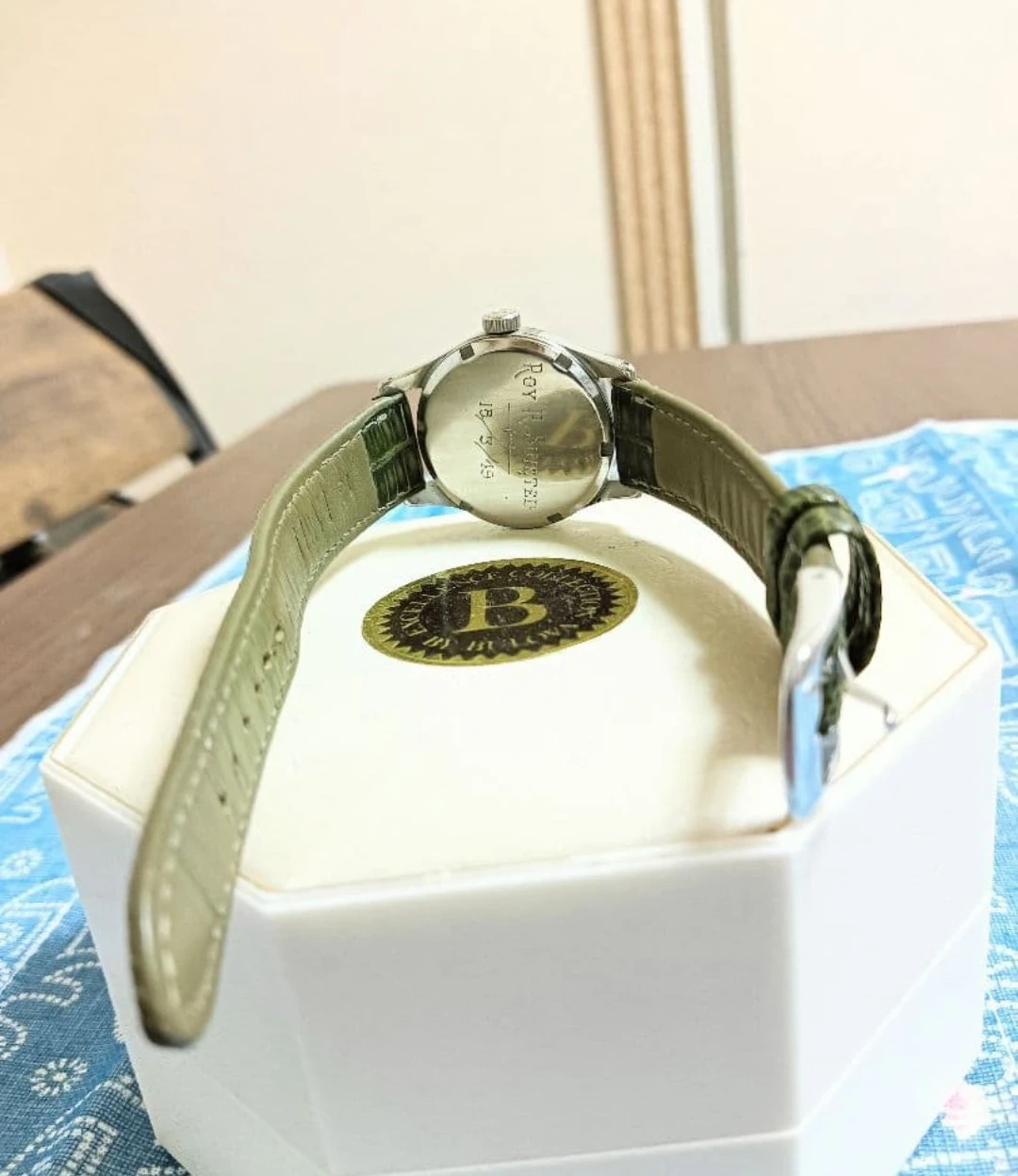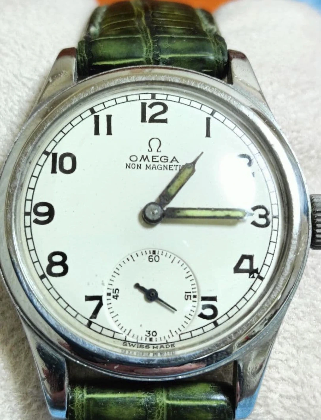 ★★ こちらのOMEGAも稀 少品。 OMEGA オメガ NON MAGNETIC スモールセコンド 手巻き式 腕時計。 正確作動 日差±約10秒 ★★ こちらも音叉時計同様に稀少な、 OMEGAの名機!磁気帯びをバリア。 ノンマグネティック腕時計。 ★★ 写真の通りヴィンテージとしては全体的にも非常に良い状態ですが、使用に伴う微かなスレはご容赦。 裏蓋に当時所有してた海外の方の記念の刻印が有るのでご容赦願います。 ★★ 腕周り フリー 社外ベルト color シルバー&ホワ こちらは現物のみとなります。 ★★ 手巻き式のOMEGA腕時計、稀少なノンマグネティックが特徴。 - ブランド: OMEGA - カラー: ホワイト・シルバー - バンド素材: レザー(グリーン) - 特徴: 手巻き式 ノンマグネティック - ダイヤルタイプ: アナログ