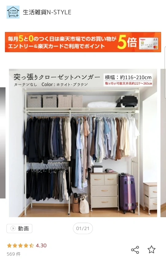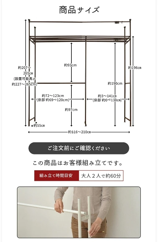 ・横幅:約116〜210cm ・取り付け可能天井高:約227〜265cm ・色:ホワイト、ブラウン 【期間限定プレゼント付】突っ張りクローゼットハンガーラック カーテンなし 送料無… [楽天] https://item.rakuten.co.jp/ndseikatu/n-s-0018/?scid=wi_ich_androidapp_item_share 詳細は写真とリンクをご参考ください。 現在は分解して保管しております。組み立ても女性一人で約1時間半~2時間でできます。(ただし、結構重いので運ぶには2人の方が楽かと思います) BOXや説明書はありません。 カーテンも付いていなくてダイソーで購入しましたが、必要でしたら無料で一緒にお譲りします。 錆と汚れもない綺麗な状態です。 (近くのお住まいの女性でしたら日程が合う日に組み立てのお手伝い可能です!) ご不明点があればお気軽にご連絡ください。