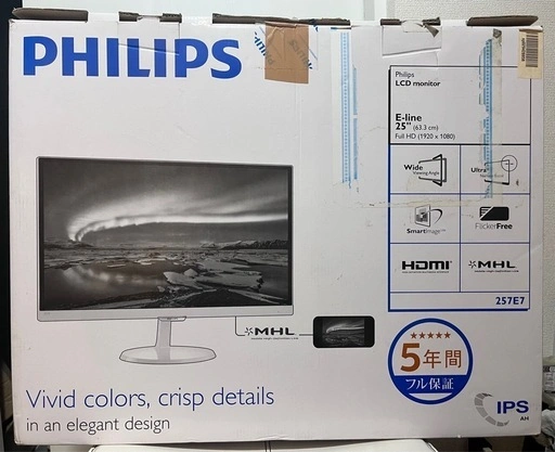 ご覧いただきありがとうございます。 Philipsの25インチ液晶モニターです。 ■ 商品名 ブランド:Philips フィリップス 型番:257E7 サイズ:25インチ ■ 状態 ・動作確認済 ・ドット抜け、黄ばみ等なし ・箱付き ・5枚目の写真の通り、3ピンタイプのプラグになります ■ 付属品 ・電源ケーブル ・スタンド ・VGAケーブル ・説明書 ※HDMIケーブルはご自身でご用意下さい。 ■ お渡し方法 ・直接引き取り希望(JR阿佐ヶ谷駅近辺) ■ 注意事項 ・非喫煙者 ・猫を飼っておりますので、猫アレルギーの方はお控え下さい ・基本的に3N ・あくまでも中古品であることご了承下さい ご興味のある方はお気軽にご連絡ください。