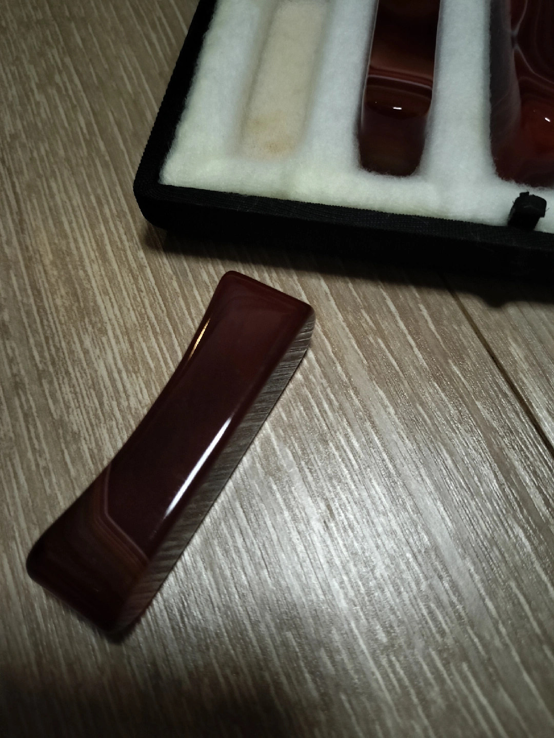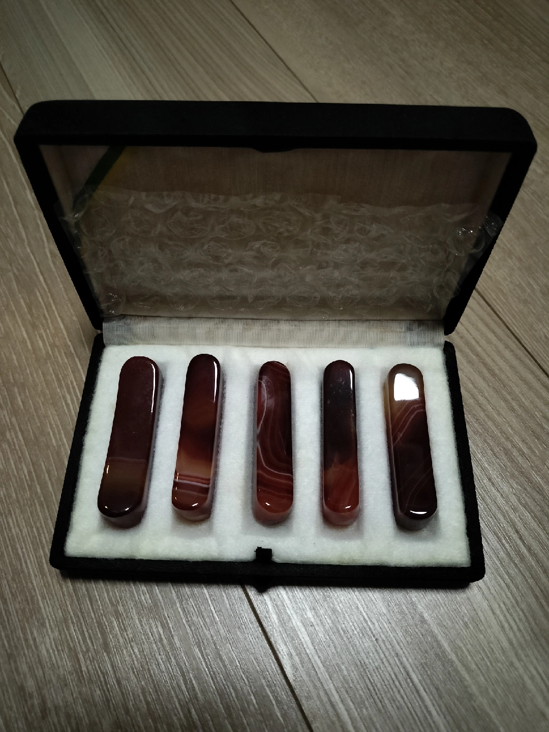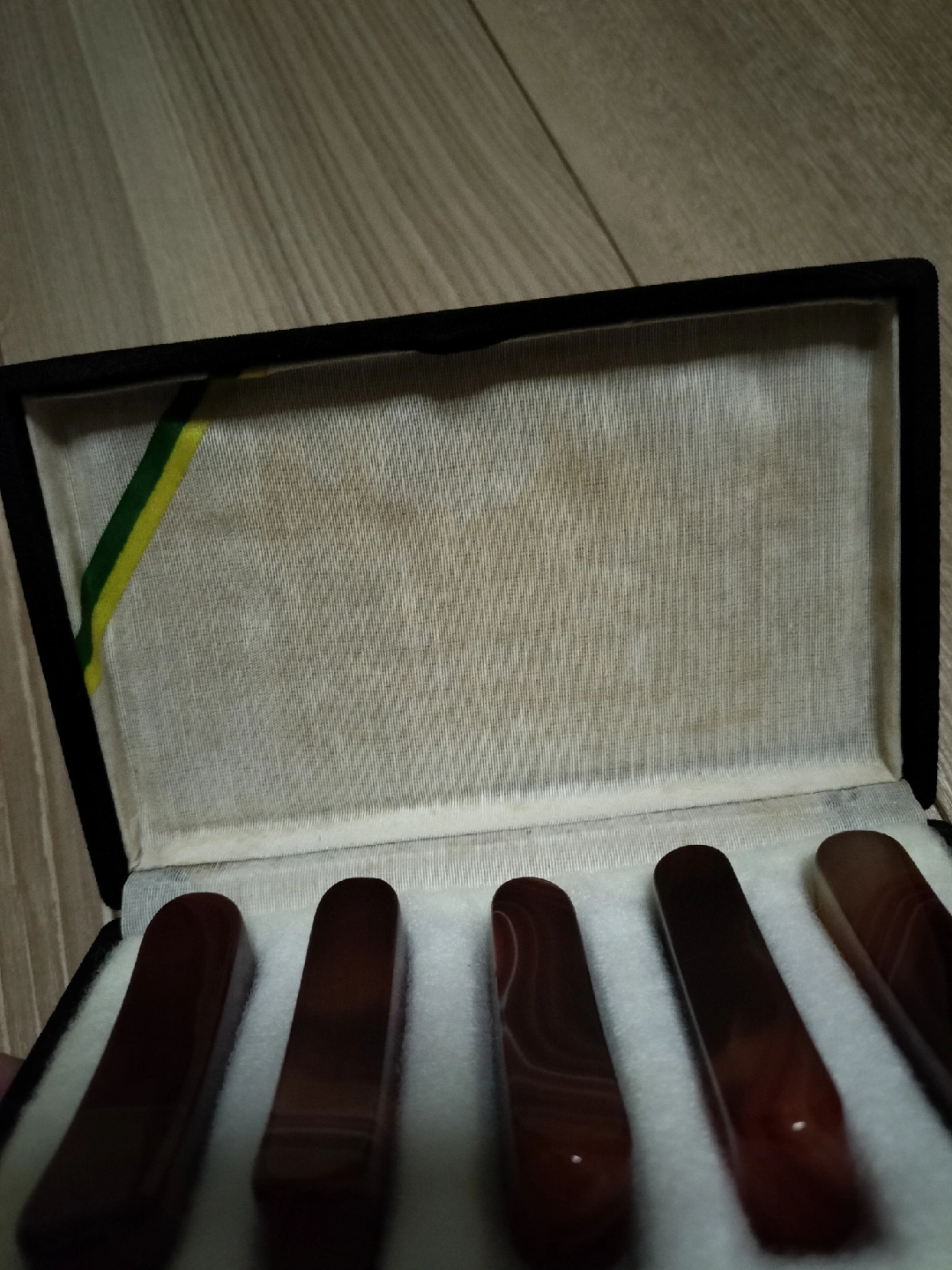 メーカー不明の箸置きです。 使用済みと思われますが、定かではありません。 大きなキズはありませんが、古い品で、箱が汚れている感じがあります。 内容は以下となります。 ・箸置き✕5:高さ2cm程度、幅1cm程度、長さ6cm程度 ・ケース:高さ3cm程度、横14cm程度、縦9cm程度