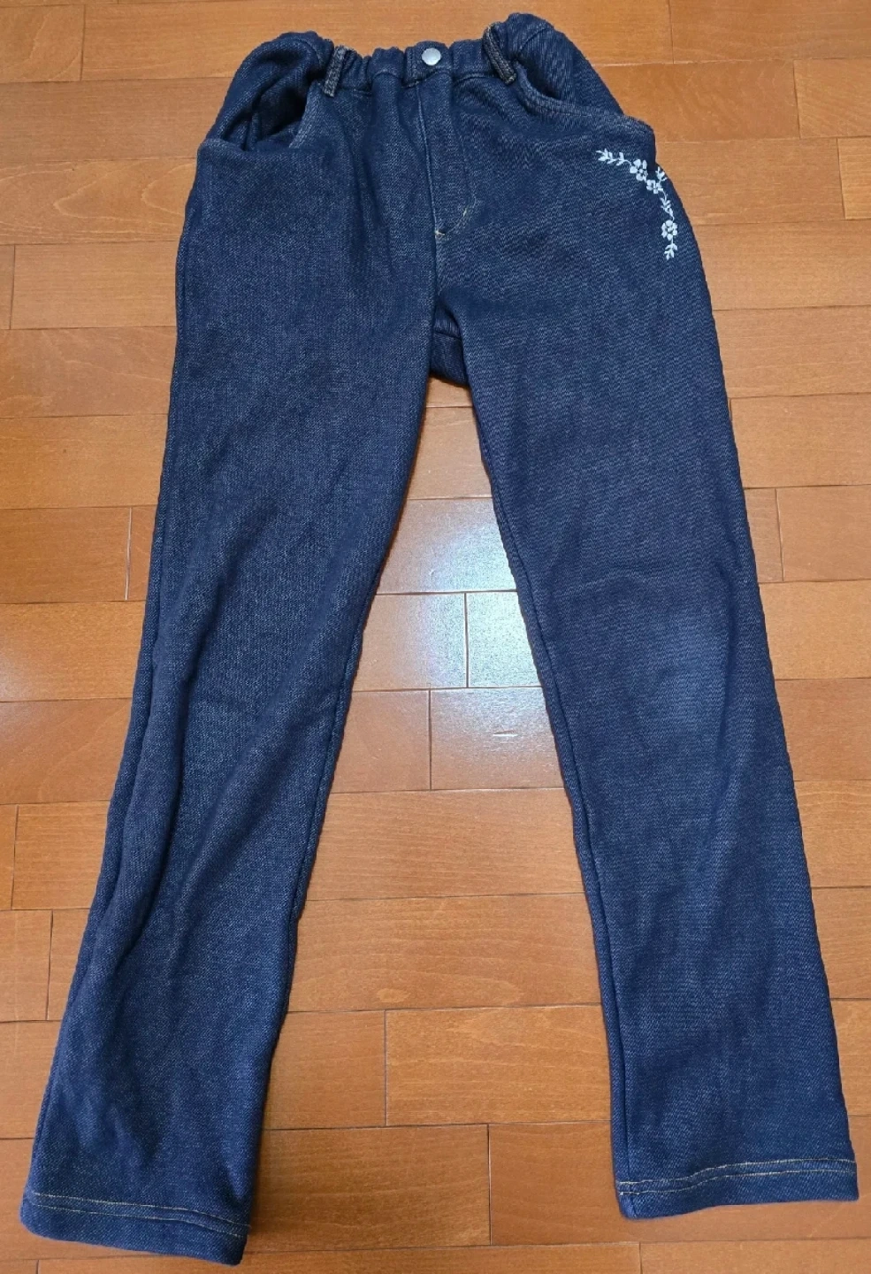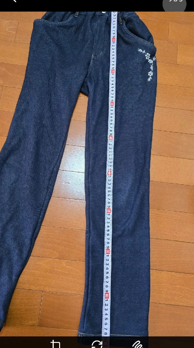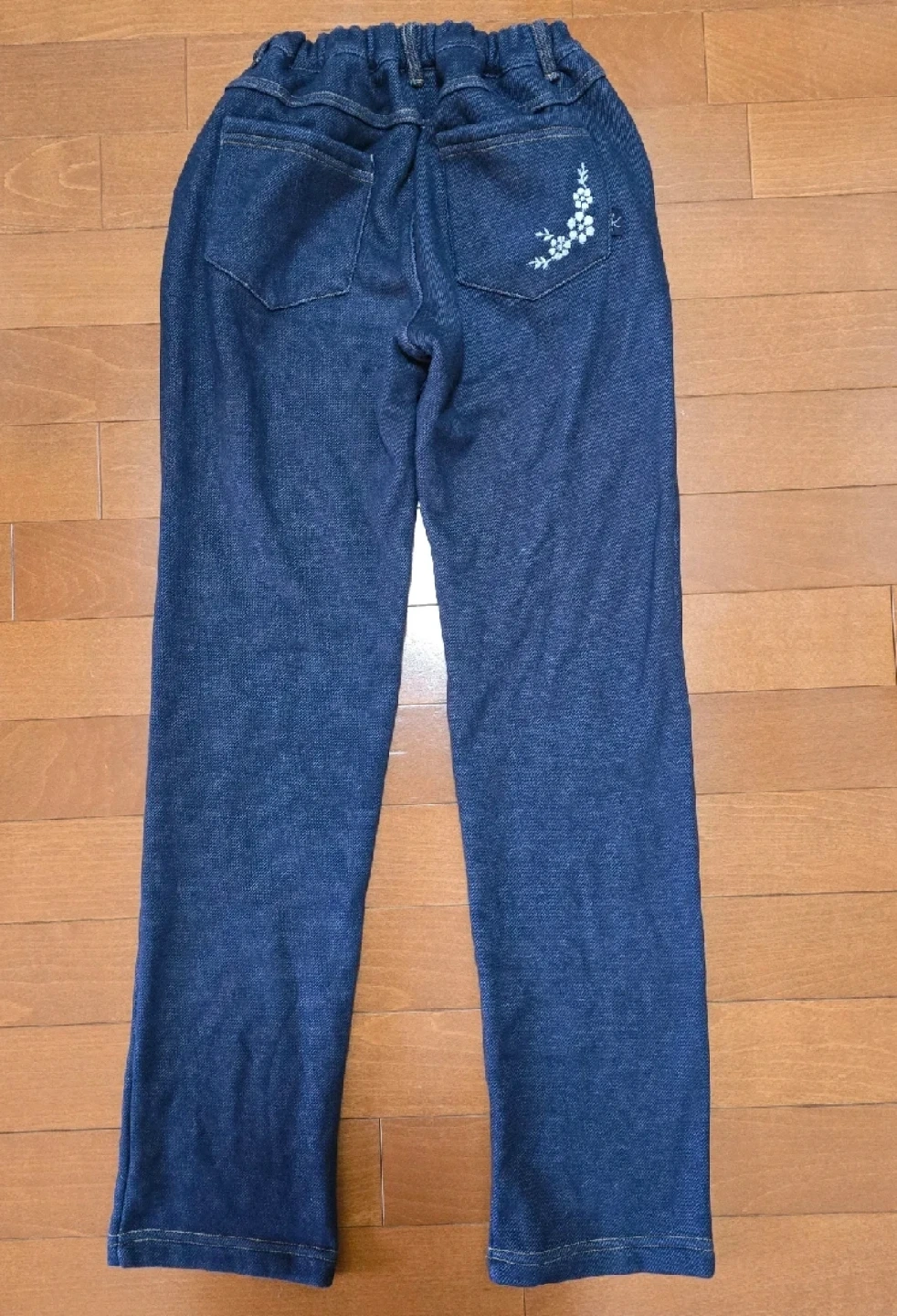 KUMIKYOKU ジュニアパンツ ・サイズ:160(150~160cm) ・股下:約79cm ・色:デニム風 紺色 ・裏起毛 ・花柄の刺繍あり ポケット両側前、後ろ1つあり ・品質表示:ポリエステル70%、綿28%、ポリウレタン2% ・使用感はありますが、まだ着用できます ウエストゴム 緩くて最後の画像のように付属のゴムを結んで使っていました。 通常体型の方ならそのままがよいかと思いそのままにしています。そのため傷ありにしています。 中古品であることご了承ください
