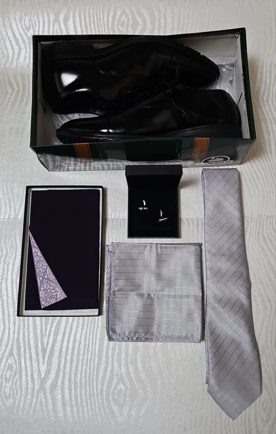 結婚式にて全て1度だけ使用致しました。 ・イヴ・サンローラン カフスボタン ・ストレートチップ内羽根式サイズ25.5cm(26cmの方でも履けそうです) ヒール3cm インソール1.5cm 4.5cmアップ 脚長効果 ・シルバーのネクタイとチーフセット ・袱紗 日本製 紫×鳳凰 どれも今月買ったばかりです。 カフスは差して折るだけなので取り付けやすいです! 靴は箱が損傷してしまったのでご理解頂けると幸いです。 プラス500円でクリーニング済黒い靴下もお付け致します。