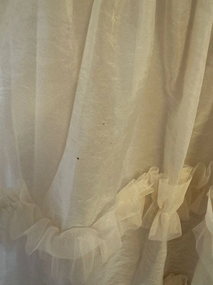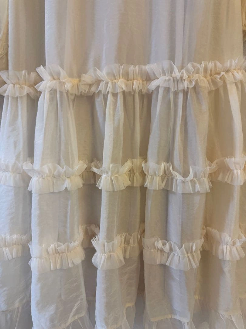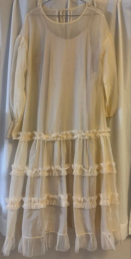 写真4枚目のような汚れが一箇所あります。 5枚目がその部分を引きで見た時です。あまり目立たないと思います。 軽やかな透け感のあるクリーム色のティアードワンピース。 - カラー: クリーム - デザイン: ティアード、フリル付き - 袖のスタイル: バルーンスリーブ - 素材: 軽量、透け感のある生地 - サイズ: フリーサイズ ご覧いただきありがとうございます。