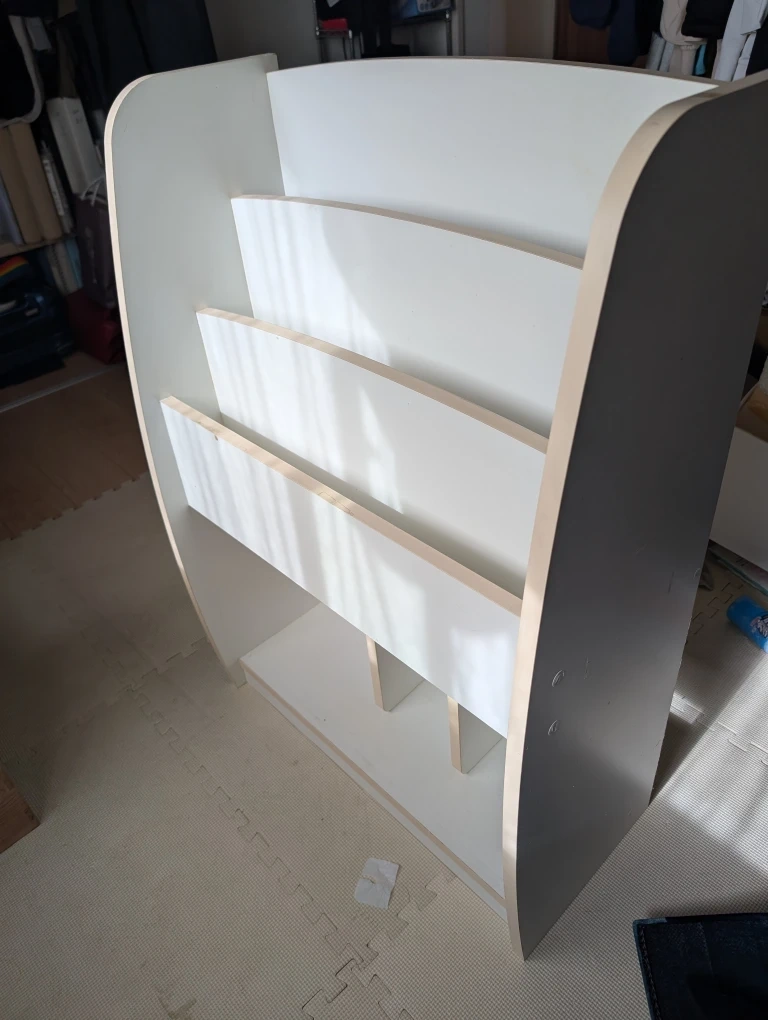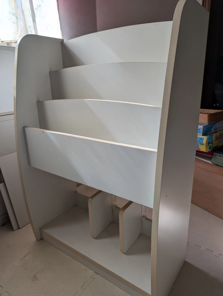 木製の絵本ラックです。 色はホワイトです。 現在もインターネットで2万円程で販売している商品です。 子供が大きくなり使用しなくなりましたが、まだまだ使えるのでどなたかご入用の方がいらっしゃったらお譲りしたいと思います。 ・木製 ・子供用 ・本棚 ・サイズ:高さ約90cm、幅約63cm、奥行約28cm(寸法画像参照) 一部、塗装のはがれ、シール跡などあります。 中古品であることをご了承くだる方の入札をお待ちしております。