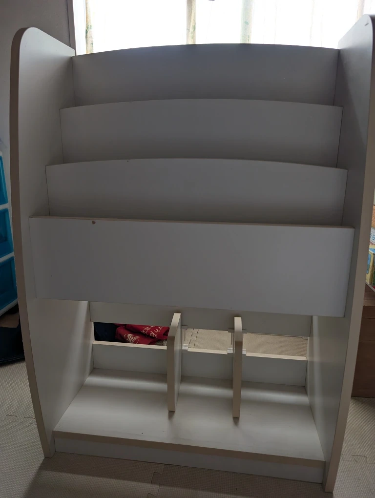 木製の絵本ラックです。 色はホワイトです。 現在もインターネットで2万円程で販売している商品です。 子供が大きくなり使用しなくなりましたが、まだまだ使えるのでどなたかご入用の方がいらっしゃったらお譲りしたいと思います。 ・木製 ・子供用 ・本棚 ・サイズ:高さ約90cm、幅約63cm、奥行約28cm(寸法画像参照) 一部、塗装のはがれ、シール跡などあります。 中古品であることをご了承くだる方の入札をお待ちしております。