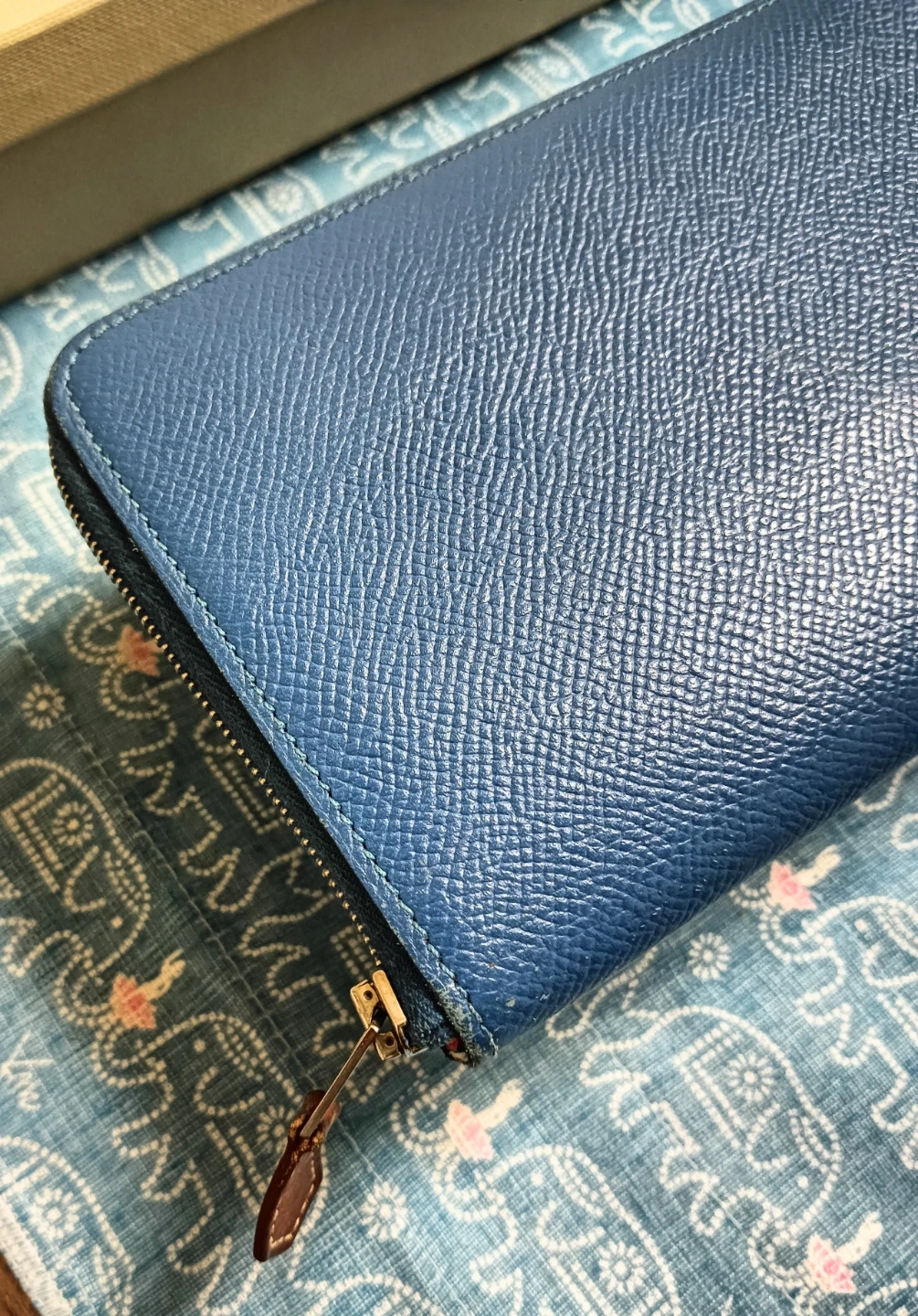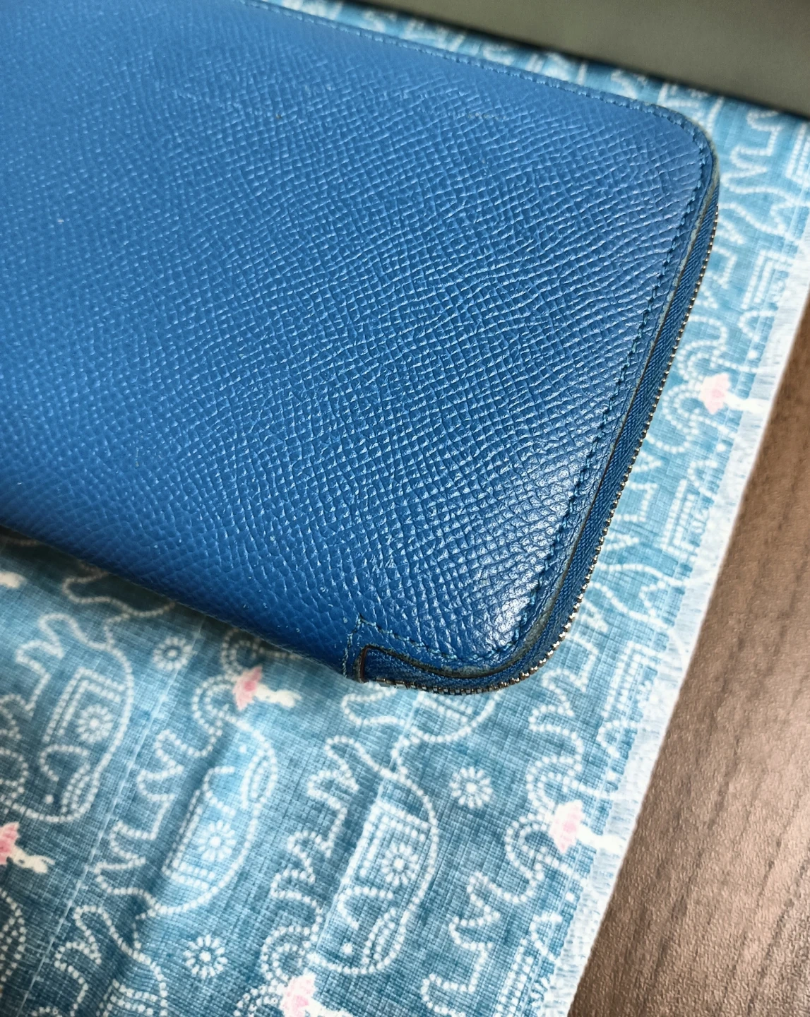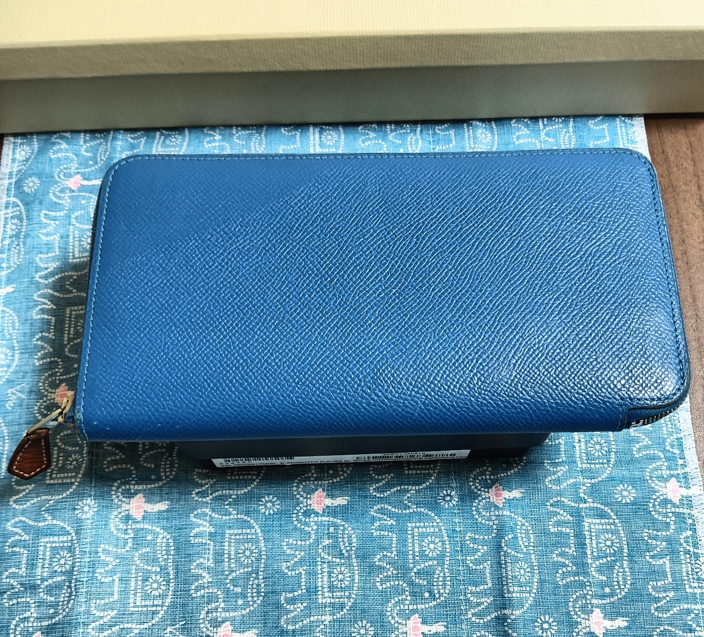 ★★ HERMES エルメスの人気シルクイン アザップ ラウンドジップ ヴォーエプソンレザー ブルー 長財布。 2016年製 刻印 X 工房刻印 AU 販売価格 約18万以上 ★★ ラウンドファスナーを開けるとHERMES定番カレシルクスカーフ生地が 鮮やかに広がる大人気なお財布ですね。 シルバー金具のブルーcolorです ★★ 写真の通り角スレ汚れ等もなく全体的にも比較的に綺麗な状態と思いますが、 使用品ですのでコイン入れに少しの汚れは感じます。 ★★ size 約20x11㎝ color ブルー こちらは現物のみとなります。