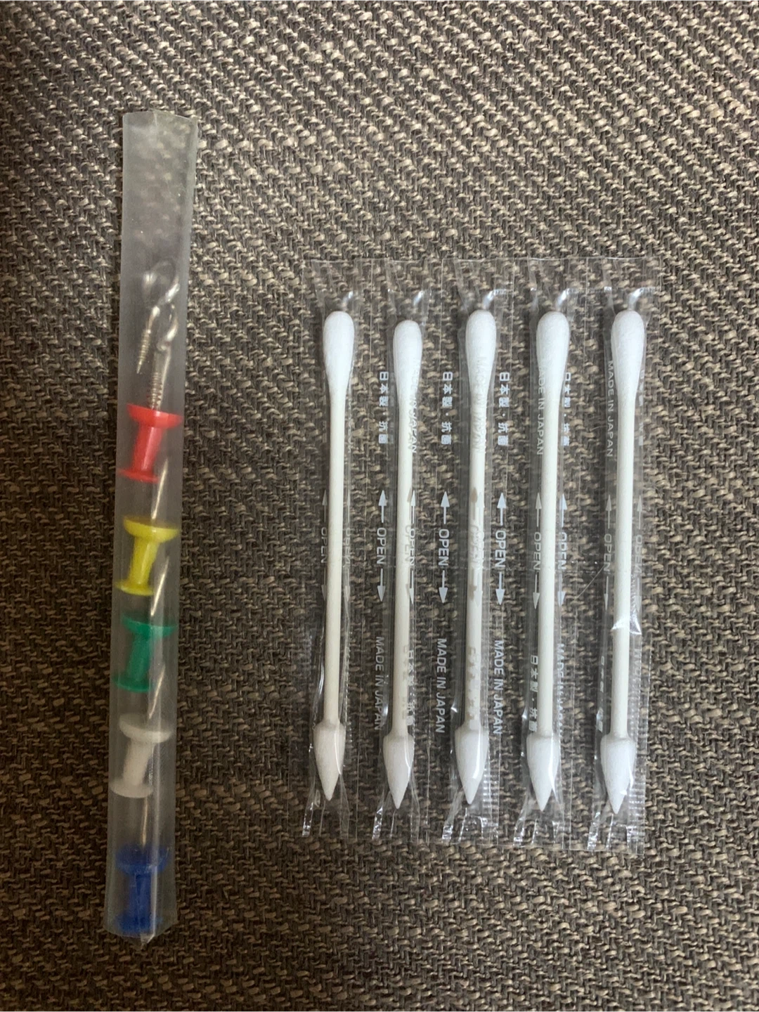 綿棒と画鋲です。 ・綿棒:個包装5本 ・画鋲:複数個、色付き 中古品であることをご了承ください。