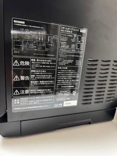 アイリスオーヤマのスチームオーブンレンジ MO-F1808-B(ブラック)です。 2021年製の中古美品。 スチーム用カップ(¥1,100)が欠品しています。 庫内は段差のないフラットタイプで、大きなお弁当も入れやすいです。 「時短ブースト」機能を搭載し、温め時間を短縮できます。 20種類の自動メニューがあり、おかず作りや菓子作りも簡単に行えます。 スチーム機能により、食材の水分を保ちながらヘルシーに調理できます。 外形寸法は幅約45.5cm×奥行約37.5cm×高さ約33cmです。 操作パネルを扉の下に設置することで横幅が広くなり使いやすいスチームオーブンレンジです。 黒を基調としたスタイリッシュなデザインでキッチンにも馴染みます。 庫内がフラットタイプなので大きなコンビニ弁当も温められ、お手入れも簡単です。 20種類の自動メニューで食品の温めのみでなく、ゆで野菜や唐揚げなどのおかずづくり、ケーキなどのお菓子作りもボタン一つで簡単調理できます。 角皿を使ってスチーム調理ができるので蒸し料理もでき調理の幅が広がります。 ご希望の方はお気軽にご連絡ください。