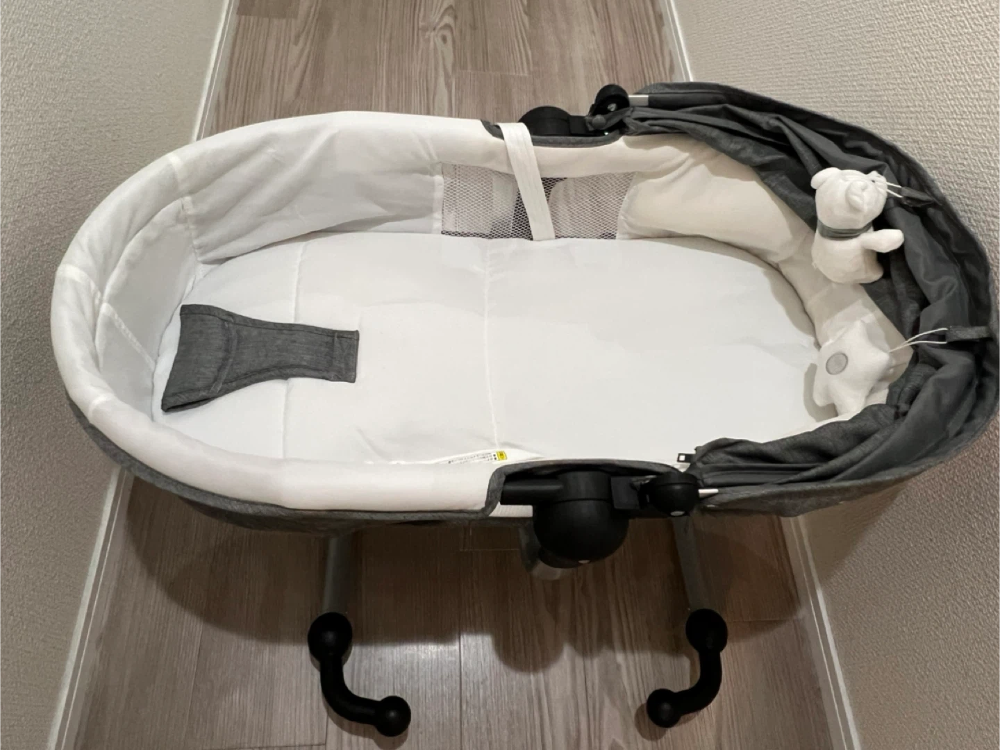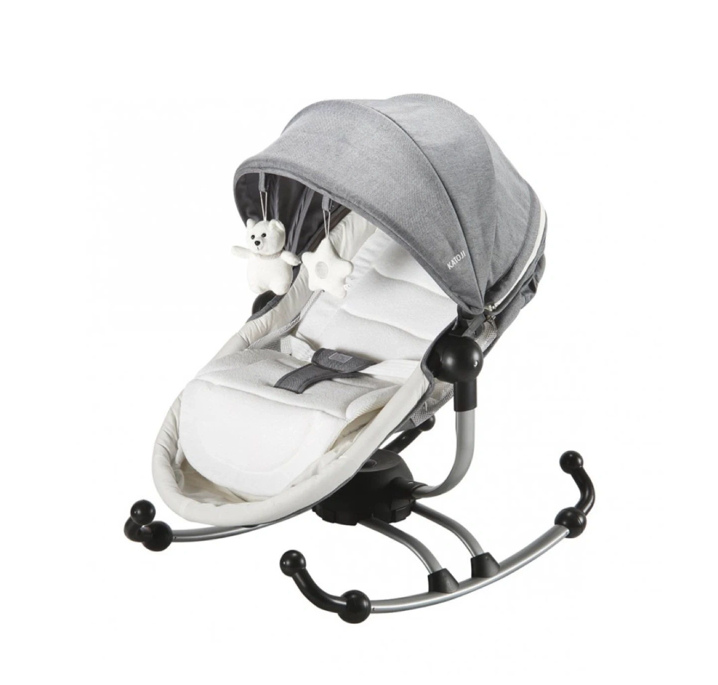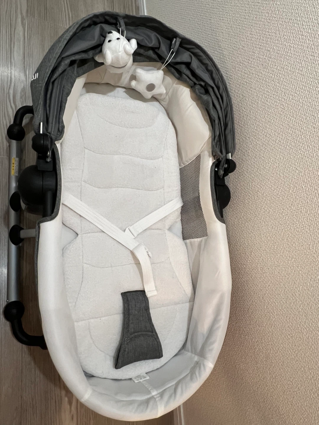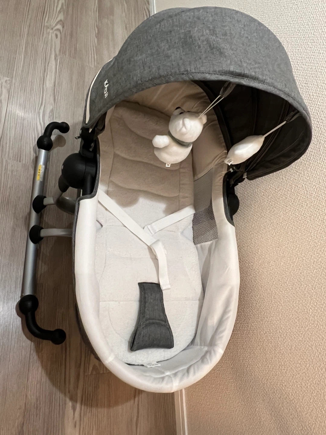 バウンサー ターン360°(グレー) こちらは既に廃盤になっている商品ですので、新品購入が出来ないものです。 2023年10月に新品で購入しました。 外箱は処分済みのため、ございません。ご了承ください。 組み立て済のため、そのままお持ち帰り可能な方でお願いします。 【メーカー希望小売価格】 16,280円 【本体サイズ】 ・【脚部とシートを平行にホロを広げた状態】 最大W48×D73×H74cm(背もたれを起こした時) 最大W48×D81×H72cm(背もたれを倒した時) ・シート高:バウンサー時27cm/チェア時31~28cm 【本体重量】 4.9Kg 【機能】 ・リクライニング角度145°/160°/175°(3段階調節) ・脚部とシートは45°ずつ回転できます(ロックできない) ・脚部先端4か所の切り替えてロッキングのストッパーになります シートが回転するので横揺れ、縦揺れでご使用いただけます。 また、角度を調整してローチェアとしてもご使用いただけます。 着脱できるトイもついてます。 7枚目写真に掲載していますが、横の部品が一部外れてしまっているのですが、普段使用には問題ないです。(通常は8枚目の様にストッパーが飛び出ています) 持ち上げるときは安全のために下の土台ごとお持ちいただければと思います。 比較的綺麗な状態です。 ホームクリーニング済ですが、使用感はございますので、ご理解いただける方のみご購入をお願いいたします。 ※ペット、喫煙者なし マタニティの方、赤ちゃんが産まれたばかりの方ぜひおすすめです!!! 以下、カトージの公式HPです。 https://www.katoji.co.jp/products-detail_2851.htm