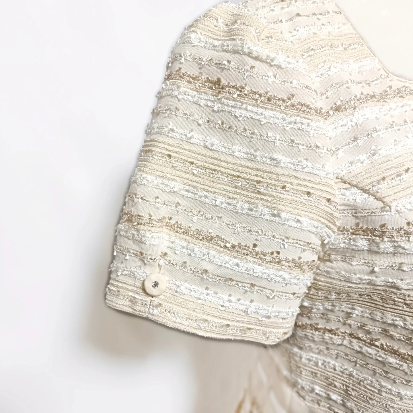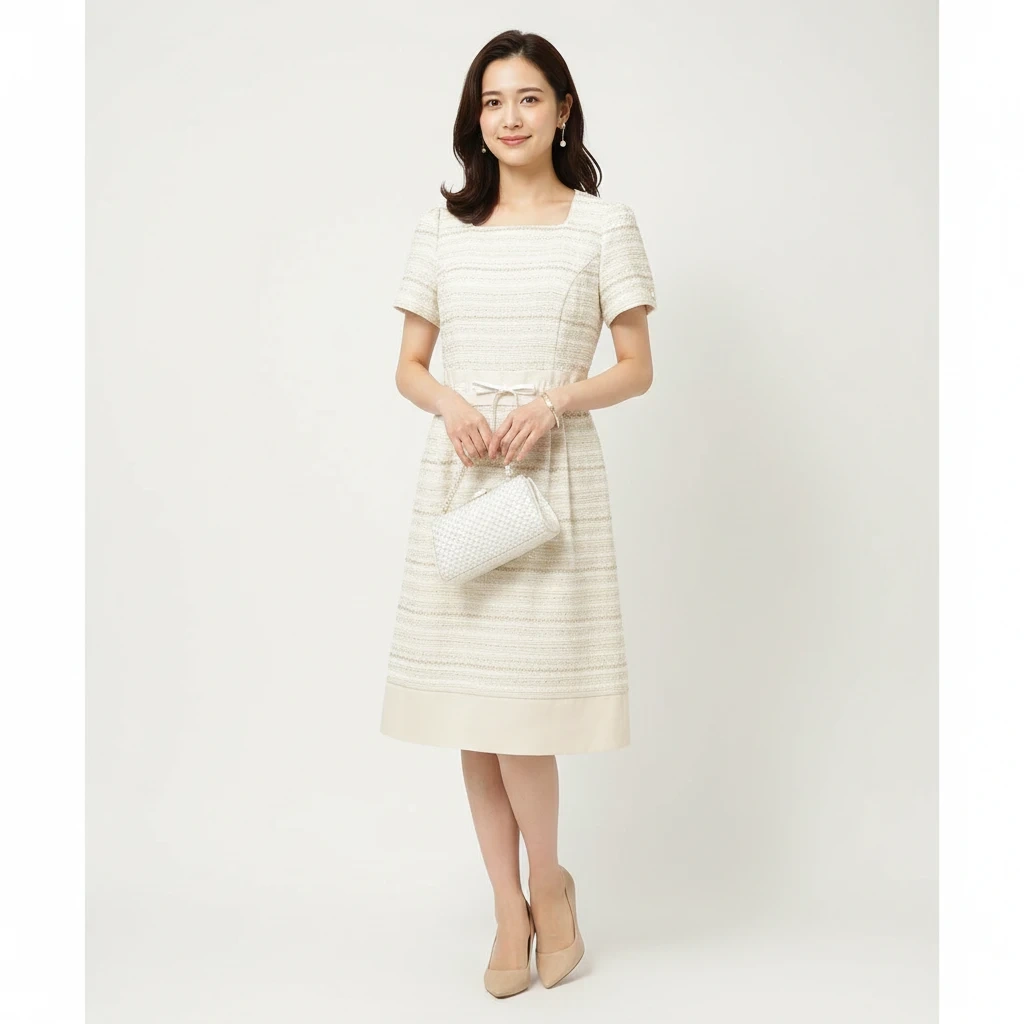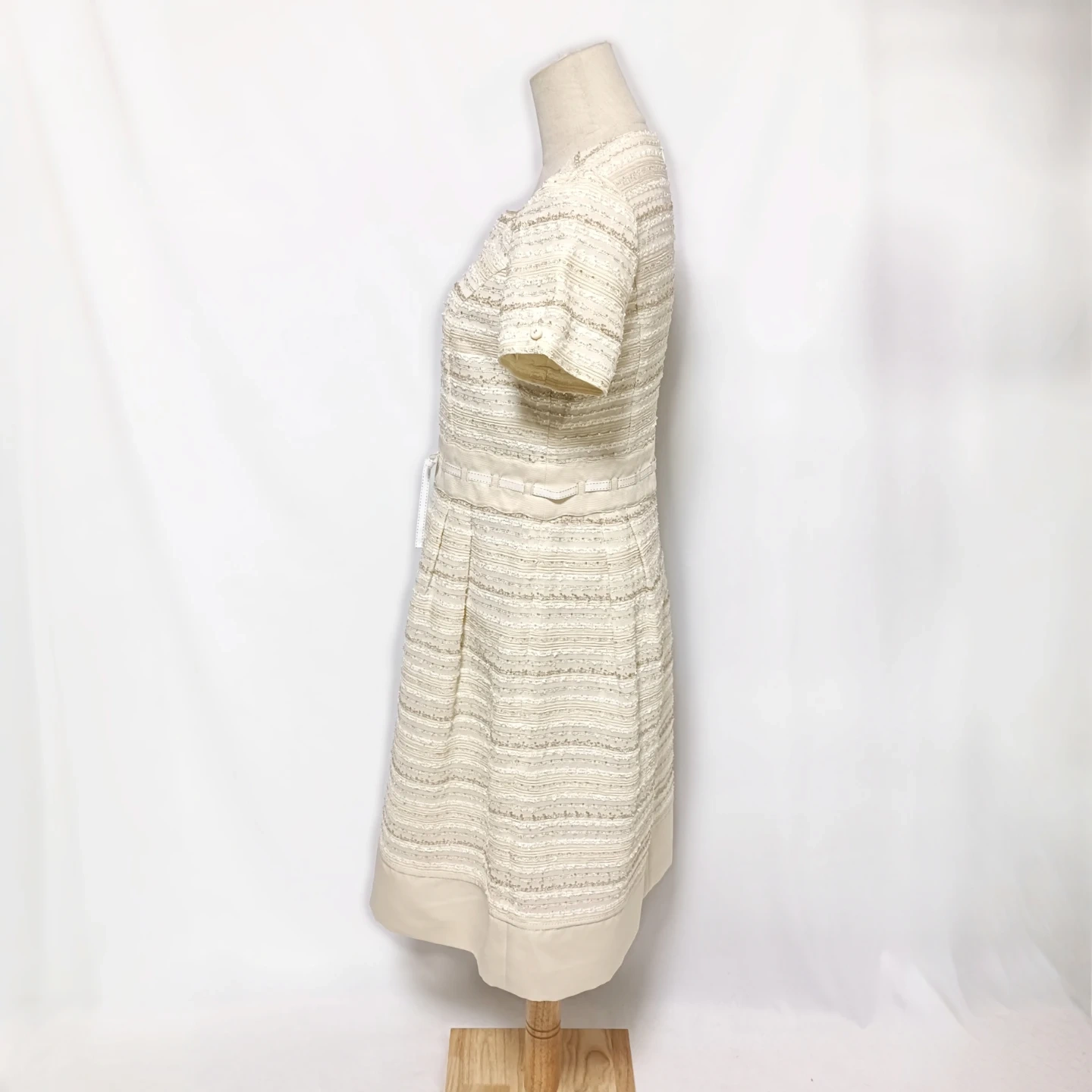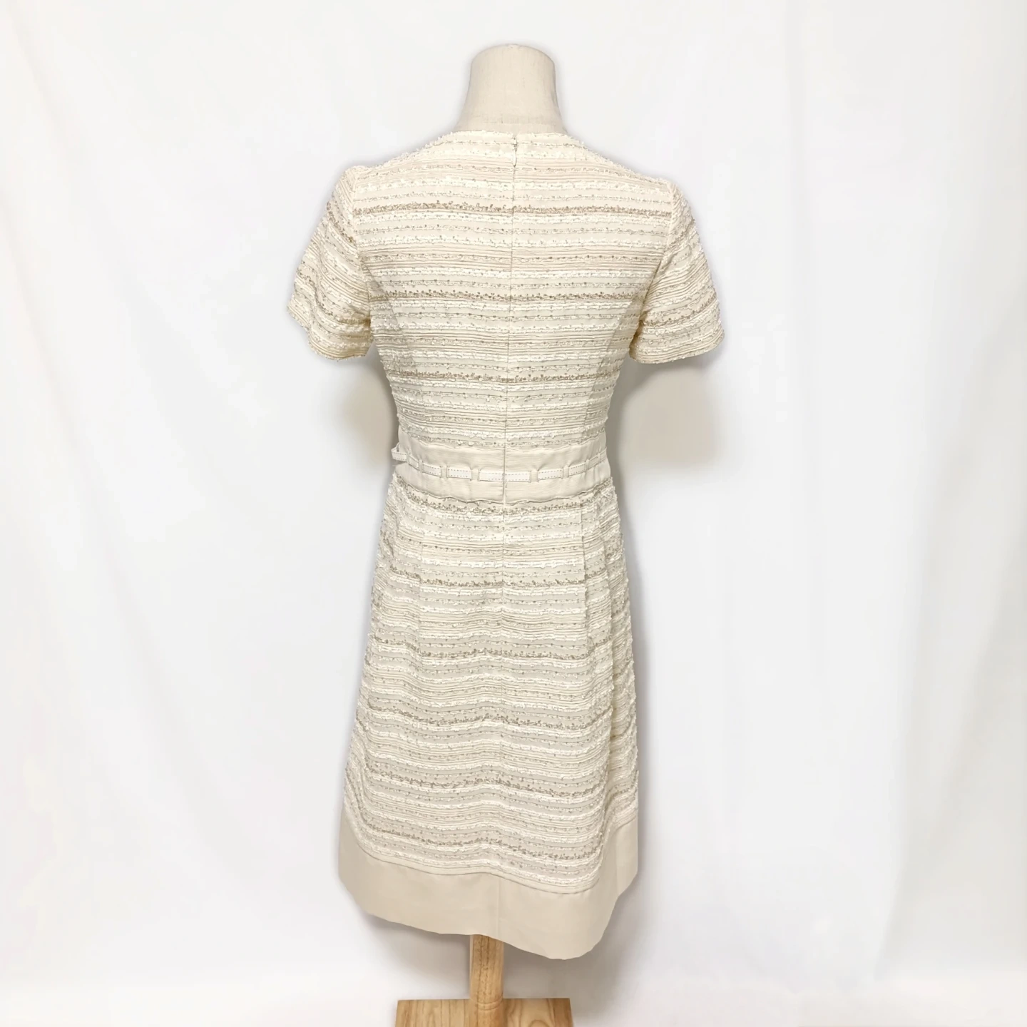 ご覧いただきありがとうございます! クレージュの上品でエレガントなツイード風ワンピースです。 ウエストの切り替え部分には、グログラン素材のリボンベルトが付いており、スタイルアップ効果があります。 入学式、卒業式、七五三、結婚式、二次会、お食事会など、ハレの日やフォーマルなシーンに最適です。 □商品名□ 美品 クレージュ ツイ ード 半袖ワンピース 38 M スクエアネック 上品 □ブランド□ Courreges クレージュ □表記サイズ□ 38 (Mサイズ相当) □実寸サイズ(cm) □ 着丈:97 肩幅:38 身幅:40 袖丈:20 ※実寸につきまして多少の誤差はご了承ください。 ※表記サイズだけではなく実寸のサイズをご確認ください。 □カラー□ アイボリー、ベージュ系 □素材□ 表地(本体部分): ナイロン 49% ポリエステル 27% コットン 24% 裏地: キュプラ □コンディション□ 目立った汚れやダメージなど特にございません。 ※汚れはできる限り写真にて掲載しております。まずは画像をご確認ください。 どうぞよろしくお願い致します。 □商品管理番号□ FF2-W-5630
