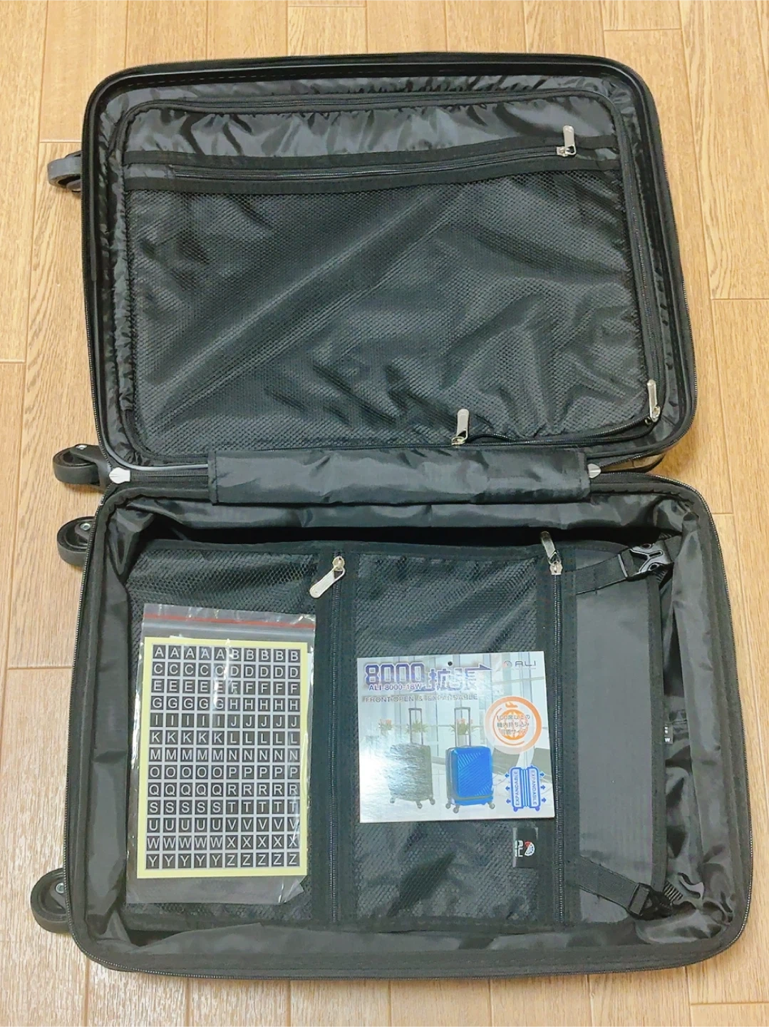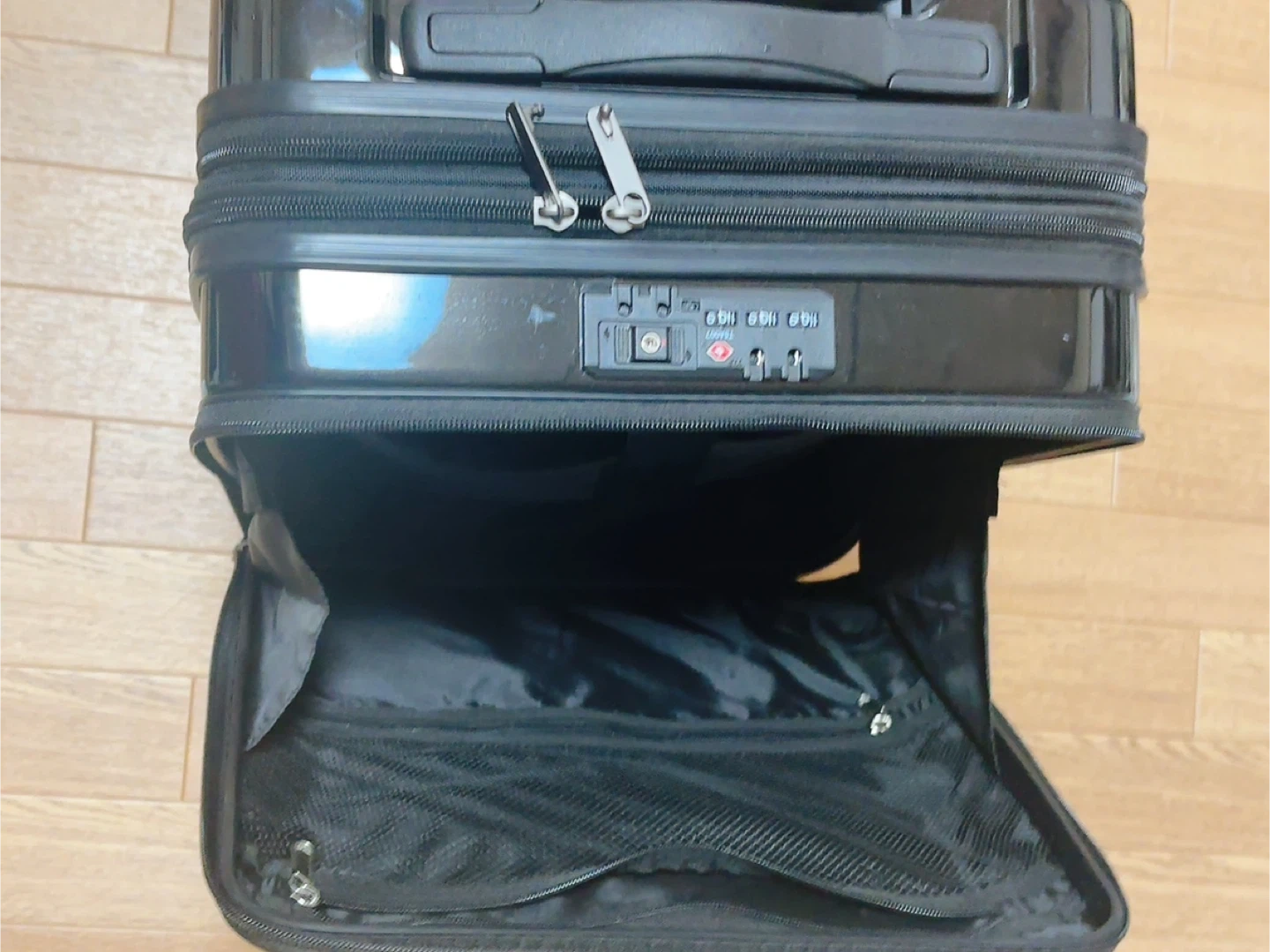 3回くらい使用しました。 ビックカメラで2万円弱で購入したと思います。 細かいところにも配慮があり、ストレスが少ないです。 形はとても気に入っているのですが、この大きさなら担いで階段を上がった方が良いので、リュックにもなるタイプの鞄を買いました。 こちら使わなくなったので、出品します。 ーー ◾️おすすめポイント ①便利なフロントオープン機能 ノートPCやタブレット、書類、飲み物などを立てたままサッと取り出せるフロントポケットが非常に便利です。空港の手荷物検査や新幹線での移動中も、本体を全開にする必要がありません。(クッション付きのPC収納スリーブも内蔵されています) ②容量が増える「拡張機能」 旅先でお土産などで荷物が増えても安心!サイドのファスナーを開くだけで、マチが約4cm広がり、容量が37Lから42Lにアップします。 ③機内持ち込み可能サイズ 100席以上の航空機に対応した機内持ち込みサイズです。 (※拡張機能を使用した場合は、機内持ち込み規定を超える場合がありますのでご注意ください) ④丈夫で軽い素材 素材は軽量で耐久性の高いポリカーボネイト100%です。重さも約3.1kgと軽量で、持ち運びもスムーズです。 内装も仕切りやメッシュポケットが豊富で、荷物を整理しやすい設計になっています。 出張が多い方や、1〜3泊程度の旅行によく行かれる方にぴったりのスーツケースです。 📋 商品スペック(コピペ用) • ブランド: A.L.I (アジア・ラゲージ) • 品番: ALI-8000-18W • カラー: ブラック • 容量: 約 37 L (拡張時 約 42 L) • 重さ: 約 3.1 kg • サイズ (外寸): 約 H54.0 × W37.0 × D24.0 cm (拡張時 D28.0 cm) • 3辺合計: 115.0 cm (拡張時 119.0 cm) • 素材: ポリカーボネイト100% ーー 私はもう少し大きいもので、同じものを買おうと思っています。 使用回数は少ないですが、飛行機に預けているので、表面に細かい傷はあります。 個人的にはきれいな方だと思いますが、感覚的なものは個人差ありますので、気になる方はお控えください。 新宿駅、もしくはお車で来る方は丸の内線中野富士見町と中野新橋駅の間の駐車場のあるコンビニで待ち合わせにしたいと思います。
