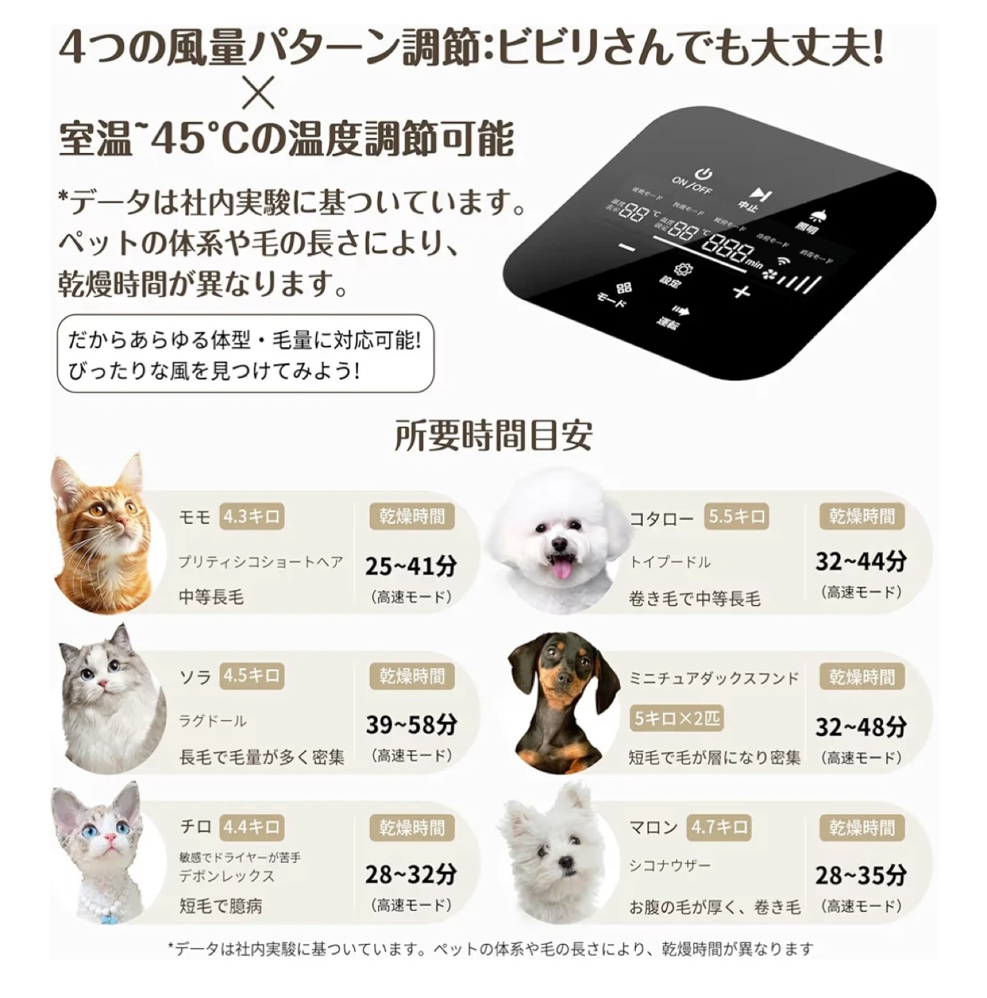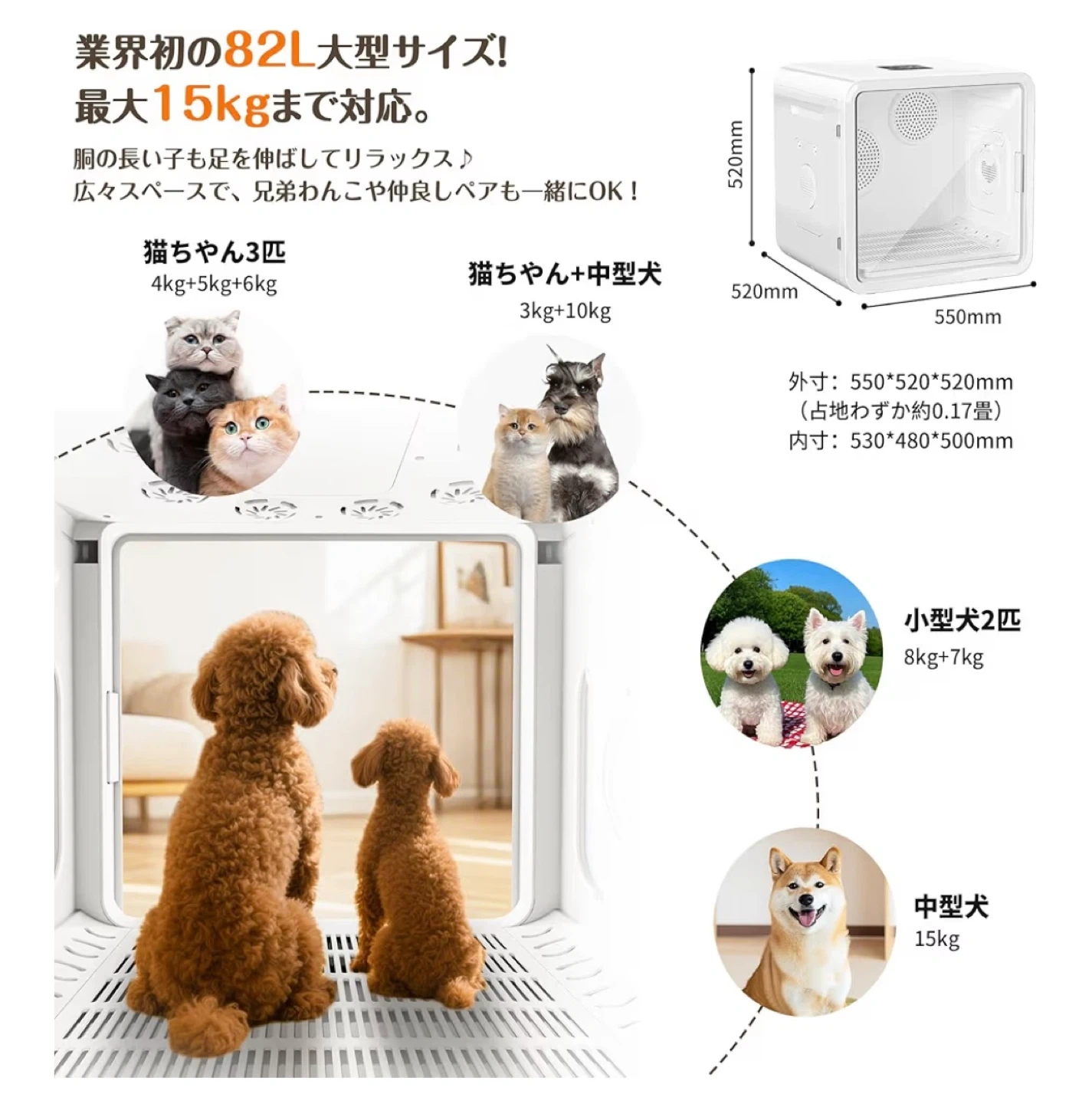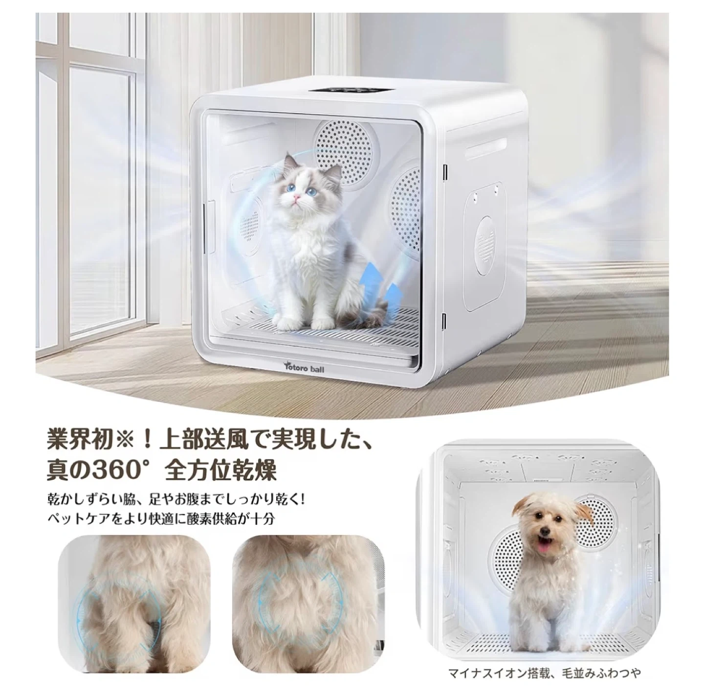 【即ご購入可能です】 1度のみ使用なので美品です。 Amazonで、39,800円で購入しました。 界初82L大容量]Totoro ball ペットドライルーム ペットドライヤーボックス 小型犬 猫用 ドライルーム 乾燥機 ボックス ドライヤーハウス 360°全方位送風 多頭用 過熱保護 温度/風量デジタル調節 花粉 犬 猫 エアシャワー対応 お風呂後 自動速乾 33dB静音性 【犬猫兼用・業界初の大容量】Totoro ball今まで82Lの大容量ペットドライルームで、ペットのストレスを最小限に抑えられます。犬/猫に広々としたスペースを提供します。 2匹のペットを同時に乾かすことができ、混雑を感じることはありません。2匹同時に入れても窮屈にならず、ペットは寝返りを打ったりと自由に動くことができます。 製品サイズ:55×52×52cmです。内寸:53×48×50cmです。耐衝撃性に優れた強化ガラスが使用されており、高い透明度を保ちながらも、ペットによる引っかき傷に強く耐えます。 【360°全方位送風ドライヤーハウス】ドライヤーをより効率的に、健康的に、快適にすることを目的に進化されて、床からの温風がペットの体全体を優しく包み込み、360°全方位送風乾きにくいお腹や足、全身しっかり乾燥できるペット用ドライハウスです。ペットにより快適に、上部と下部が同時に送風し、跳ね返って360°送風を実現。大幅な時間短縮を見込め、より早く乾燥させます、愛犬・愛猫の負担軽減にも役立ちます。天候の変化やペットのニーズに応じて、温度(22℃〜45℃)とタイマー(1〜120分)、風量を自由に調節できる仕様となっております。(※遠赤外線)内蔵のPTCセラミックヒーターにより、寒い冬でも設定温度に到達するまでわずか5秒で迅速に暖まります。ボックス内の新鮮な空気、デュアルチャネルの吸気設計、循環空気の70%が乾燥ボックスの温度をより安定させ、新鮮な空気の30%がボックスに導入されて維持されます。ボックスの外側の自然換気により、ペットの呼吸がより快適になります。 360°全方位でペットを優しく乾燥させるペット用ドライヤー。