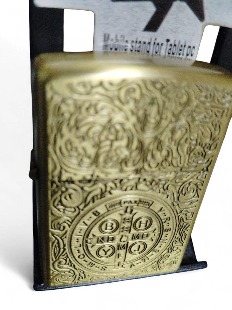 聖ベネディクトZIPPO型 十字架オイルライターです! 刻印なので消えることなし 映画「コンスタンティン」に登場するデザインが特徴。 細かなエングレービングが施された重厚なデザインで、コレクション用にも実用としてもおすすめです。 Zippo製品ではありません。 ✔ 着火確認済み(オイル切れ状態での確認)購入者様で補充していただければと思います。 ✔ 手に馴染むしっかりとした重量感 ✔ コレクター人気が高いデザインライター 【状態】 多少の使用感はありますが、大きなキズや凹みはなく全体的に良好です。 ※オイルは抜いて発送します。 ✅ 商品サイズ 高さ:約 55mm 横幅:約 38mm 厚み:約 12mm ※計測誤差あり コンスタンティン オイルライター 真鍮 デザインライター コレクション アンティーク風 メンズ小物