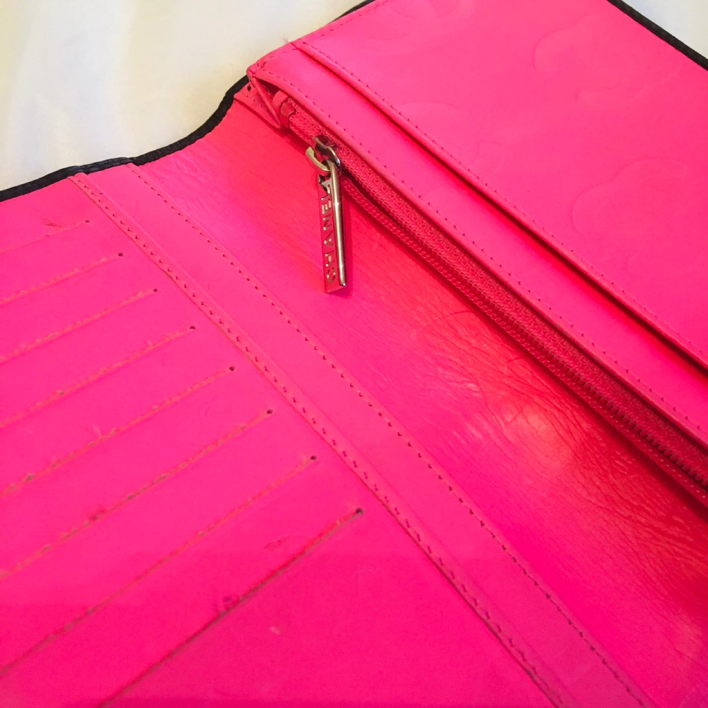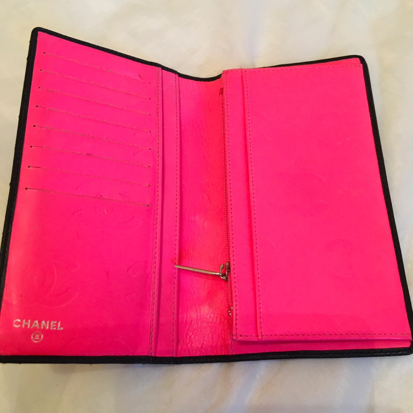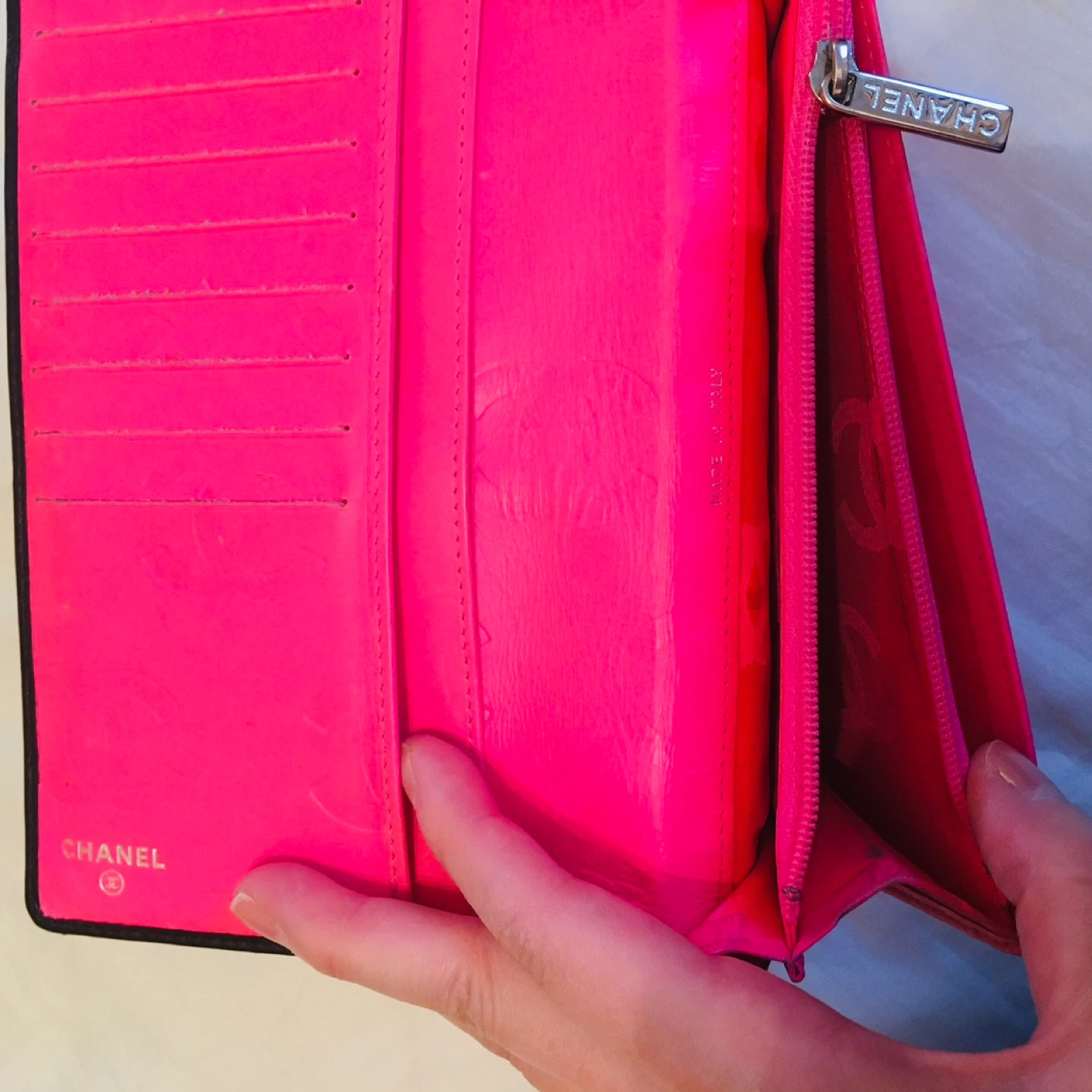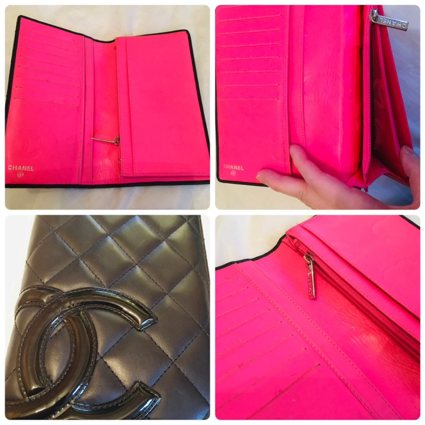 美品 正規品のシャネルの長財布です。 百貨店で購入しました。(定価10万円以上しました。) シリアルナンバーと証明書もあります。 使用期間も1年ほどで、丁寧に使っていて、その後箱の入れて保管しておりました。 月島駅まで来てくださる方にお譲りいたします。 ・ブランド名 【 CHANEL 】シャネル ライン・シリーズ 【 カンボンライン 二つ折り長財布 】 ココマーク マトラッセ ・素材 : 外観外側 :【 レザー ほか 】 ・Color(色目) :  外観 : 【 ブラック(黒) 系色 】 , 【 ロゴ部 : パテント(エナメル) ブラック 色 】 内側 : 【 ピンク 系色 】 金具 : 【 シルバー 系色 】 (色目・形状は写真をご覧になり,判断して頂けます様,よろしく御願い致します。) 商品名 【 二つ折り長財布 】 ★内側のピンクが鮮やかなCHANEL(シャネル)の二つ折り長財布です。状態も良く,使い易いデザインの商品かと思います。 ・サイズ W(巾・ヨコ) : 【 約 18.2 cm 】 H(高さ・タテ) : 【 約 10.5 cm 】 マチ(奥行) : 【 約 2.5 cm 】 (実寸ですので多少の誤差は御容赦ください。) ・付属品 CHANEL 箱、ギャランティーカード ・状態 カード入れに若干の擦れがありますが、全体的にとても綺麗です。 ・型番・製番 Model(型番) : 【 A26717 】 ・その他・商品説明など メイン : 【 オープン 開閉式 】 外側 : ●- : 【 - ヶ所 】 内側 : ●札入れ : 【 1 ヶ所 】 ●カードポケット : 【 8 ヶ所 】 ●オープンポケット : 【 4 ヶ所 】 ●ファスナー式小銭入れ : 【 1 ヶ所 】