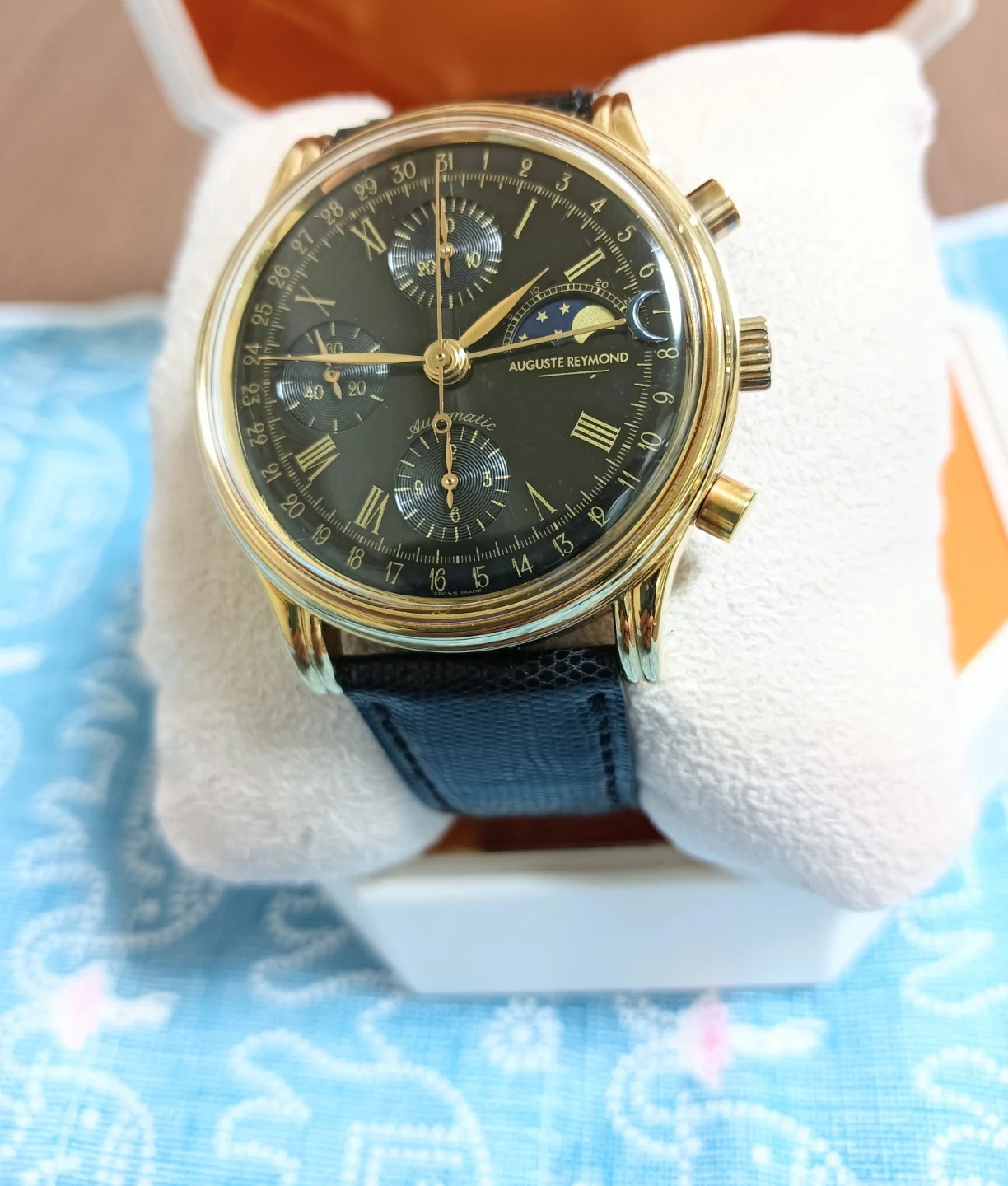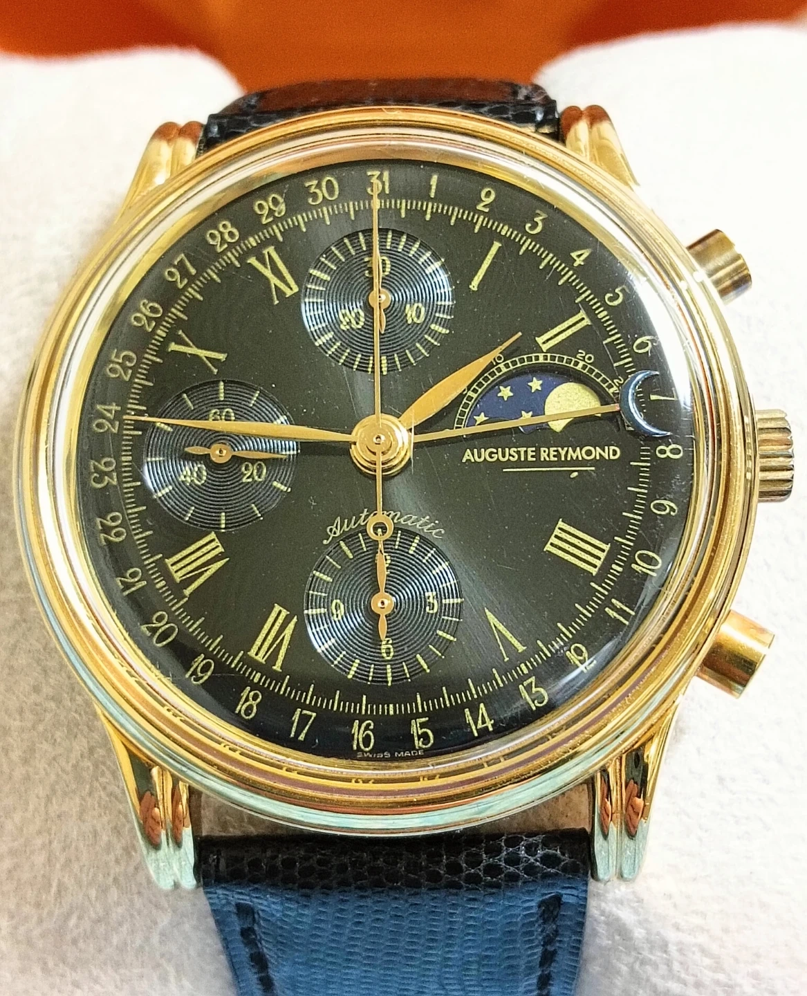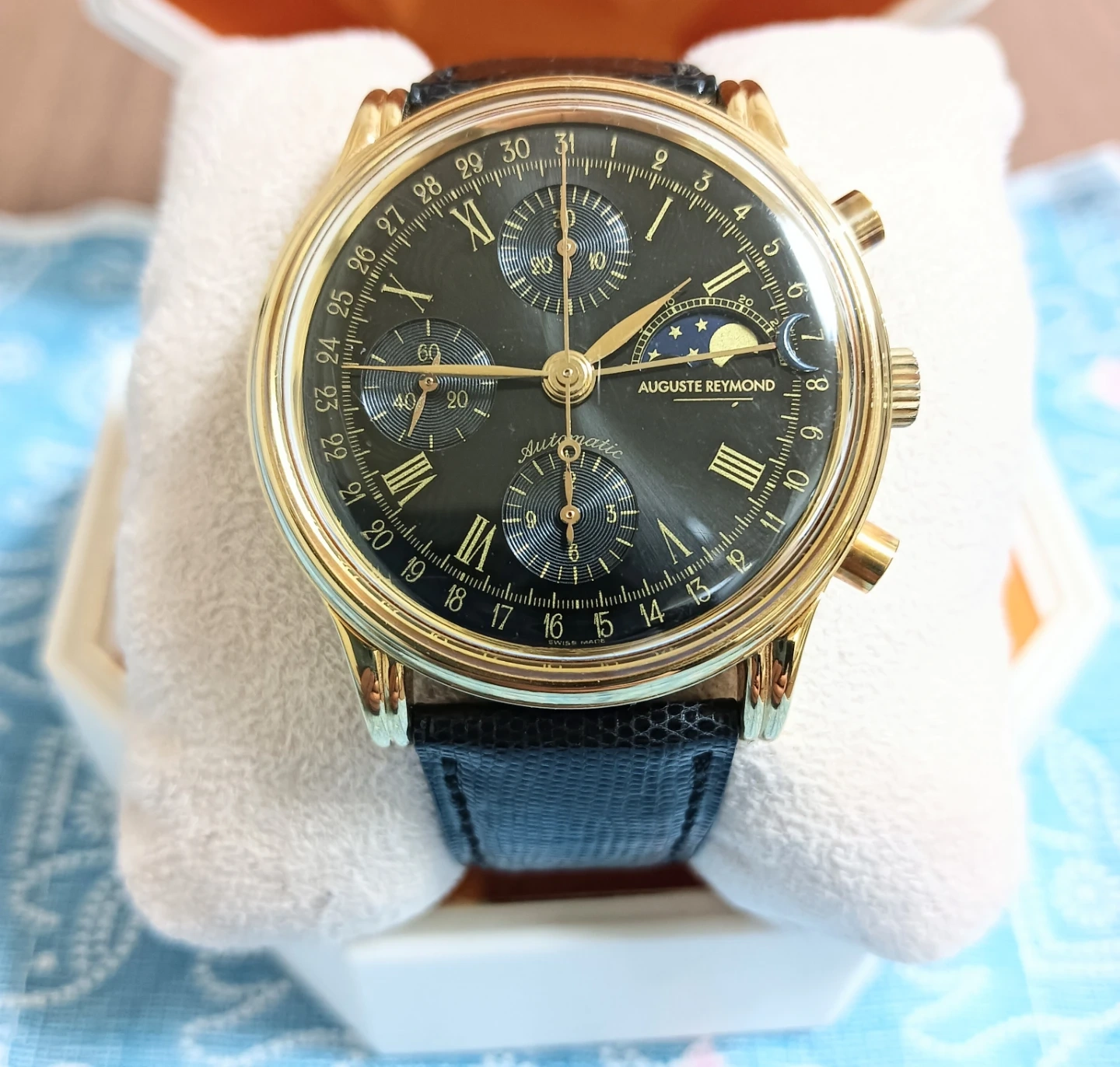 ★★ AUGUSTE REYMOND オ ーガストレイモンド 自動巻き オートマチック コンプリケーション クロノグラフ ムーンフェイズ 裏スケルトン 腕時計 ★★ こちらもスイスの名門ブランドの オーガストレイモンド 自動巻きクロノグラフ コンプリケーション ムーンフェイズの時計です。 ★★ どのブランドもクロノグラフコンプリケーションは複雑機能な為、非常に高額です。 こちらもフォルムも非常に美しい高性能な腕時計ですね。 ★★ 写真の通り全体的にも良いな状態ですが、使用はしてますので、 微かなスレ及びベルトの裏側に使用感はご容赦。 ★★ 腕周り フリー color ゴールド&ブラック こちらは現物のみとなります。 ★★