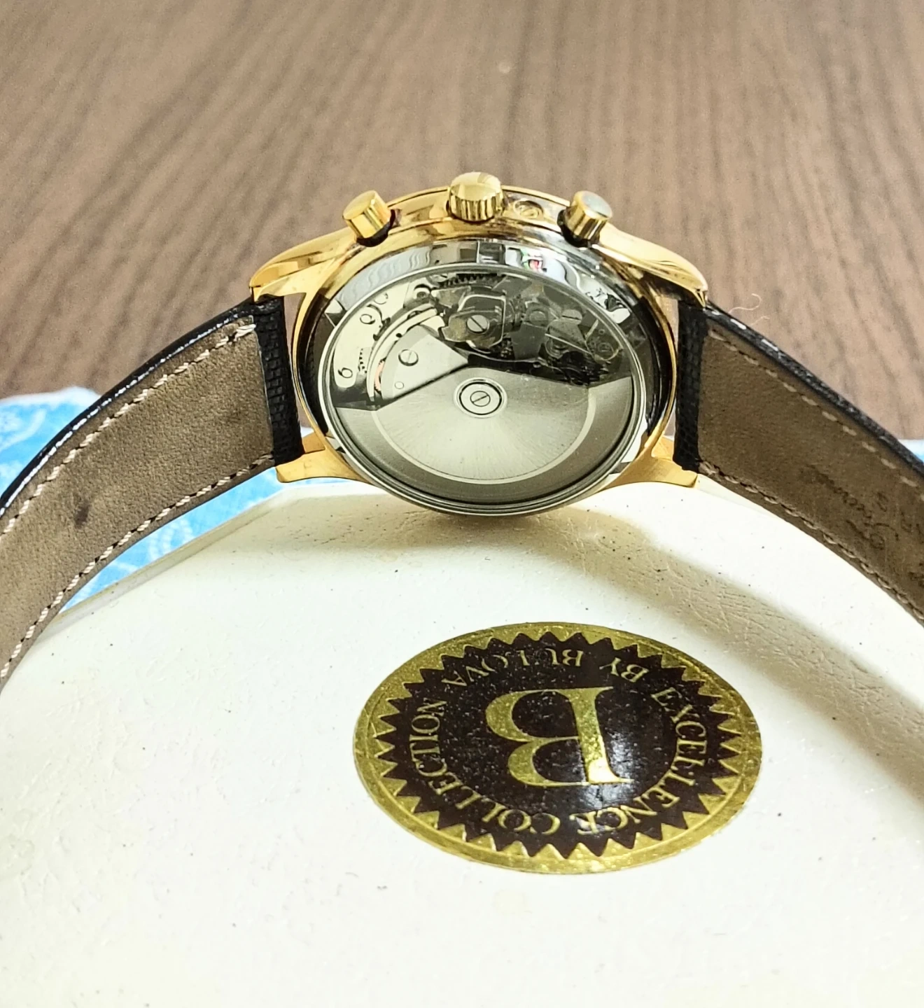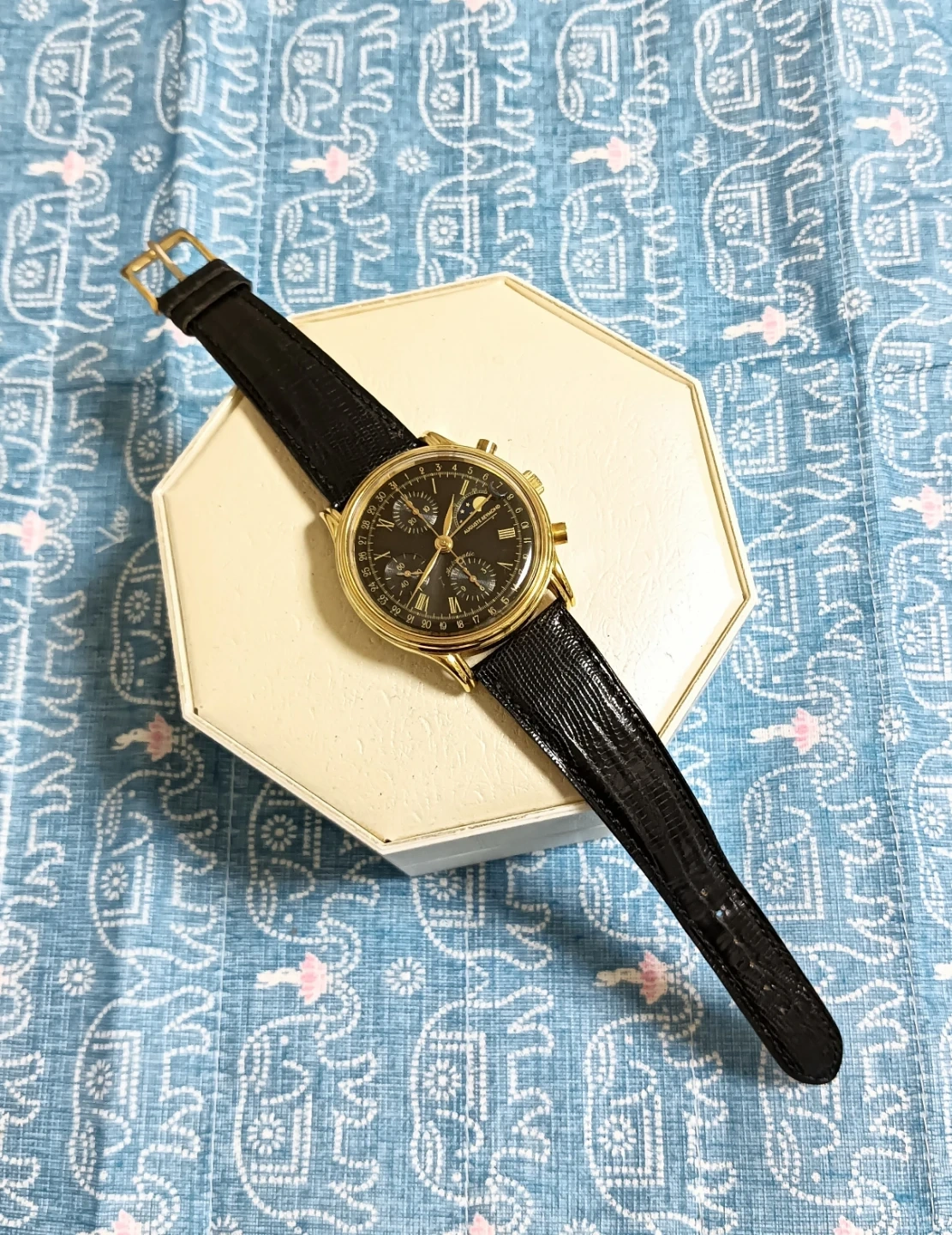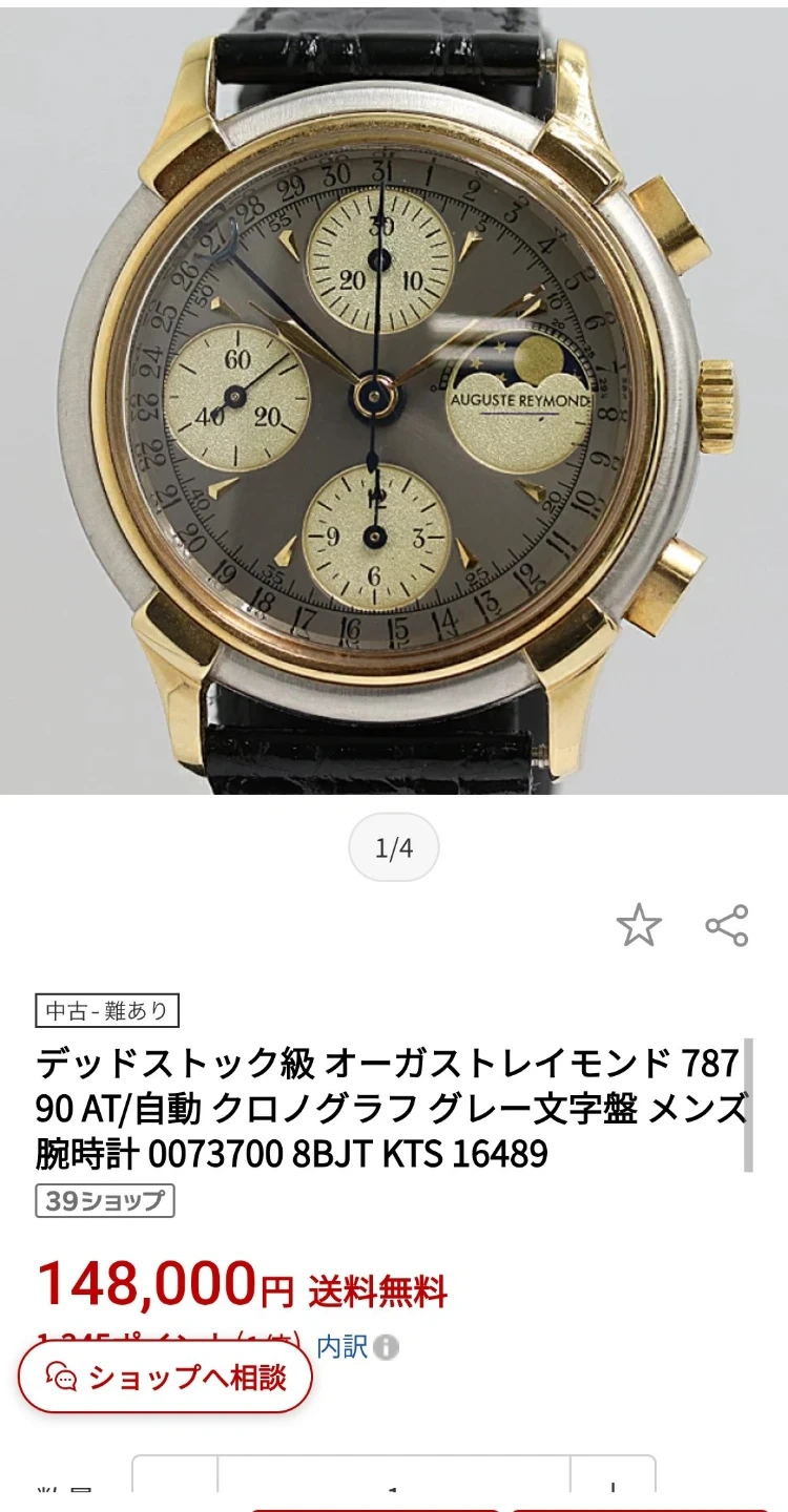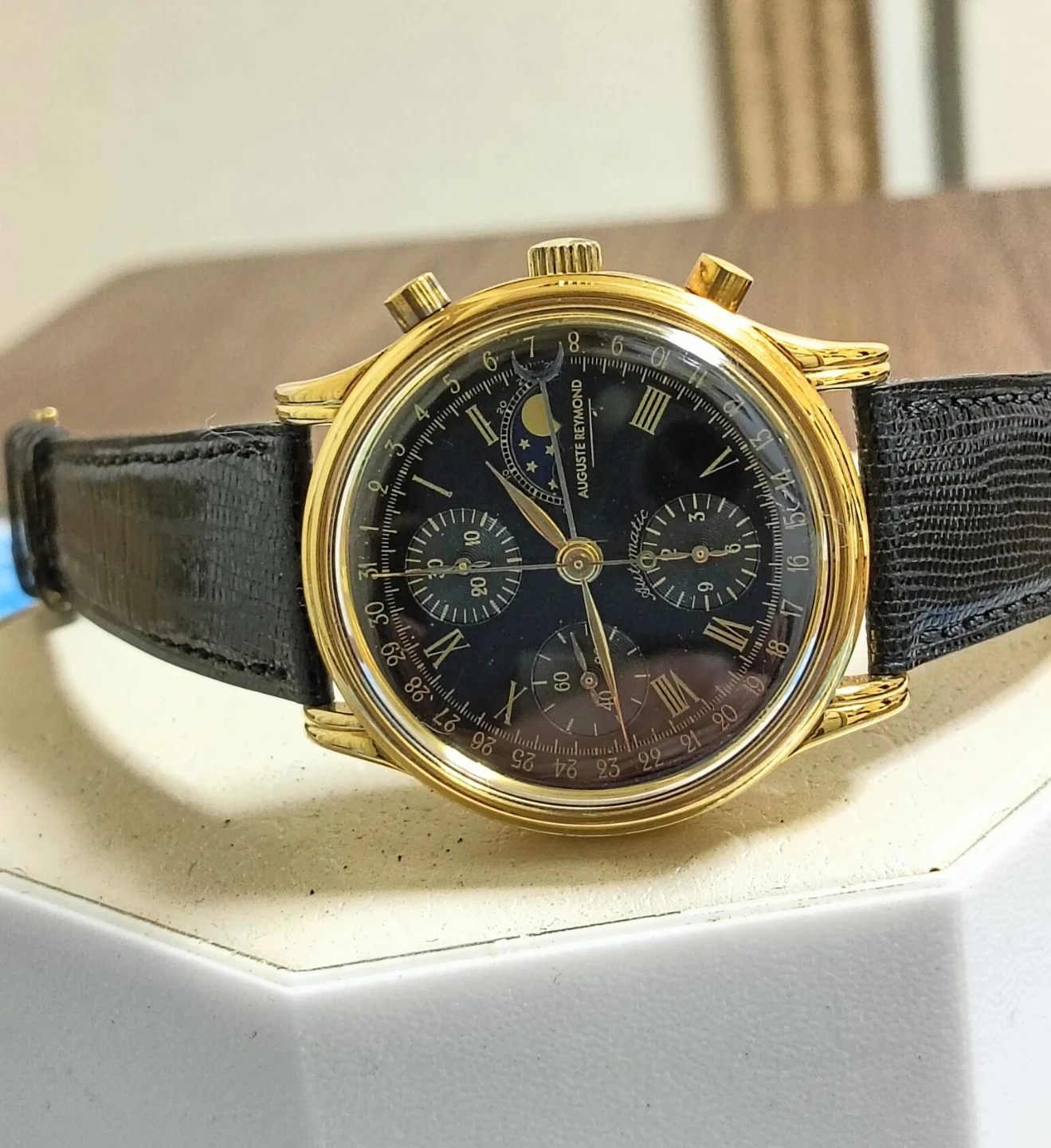 ★★ AUGUSTE REYMOND オ ーガストレイモンド 自動巻き オートマチック コンプリケーション クロノグラフ ムーンフェイズ 裏スケルトン 腕時計 ★★ こちらもスイスの名門ブランドの オーガストレイモンド 自動巻きクロノグラフ コンプリケーション ムーンフェイズの時計です。 ★★ どのブランドもクロノグラフコンプリケーションは複雑機能な為、非常に高額です。 こちらもフォルムも非常に美しい高性能な腕時計ですね。 ★★ 写真の通り全体的にも良いな状態ですが、使用はしてますので、 微かなスレ及びベルトの裏側に使用感はご容赦。 ★★ 腕周り フリー color ゴールド&ブラック こちらは現物のみとなります。 ★★