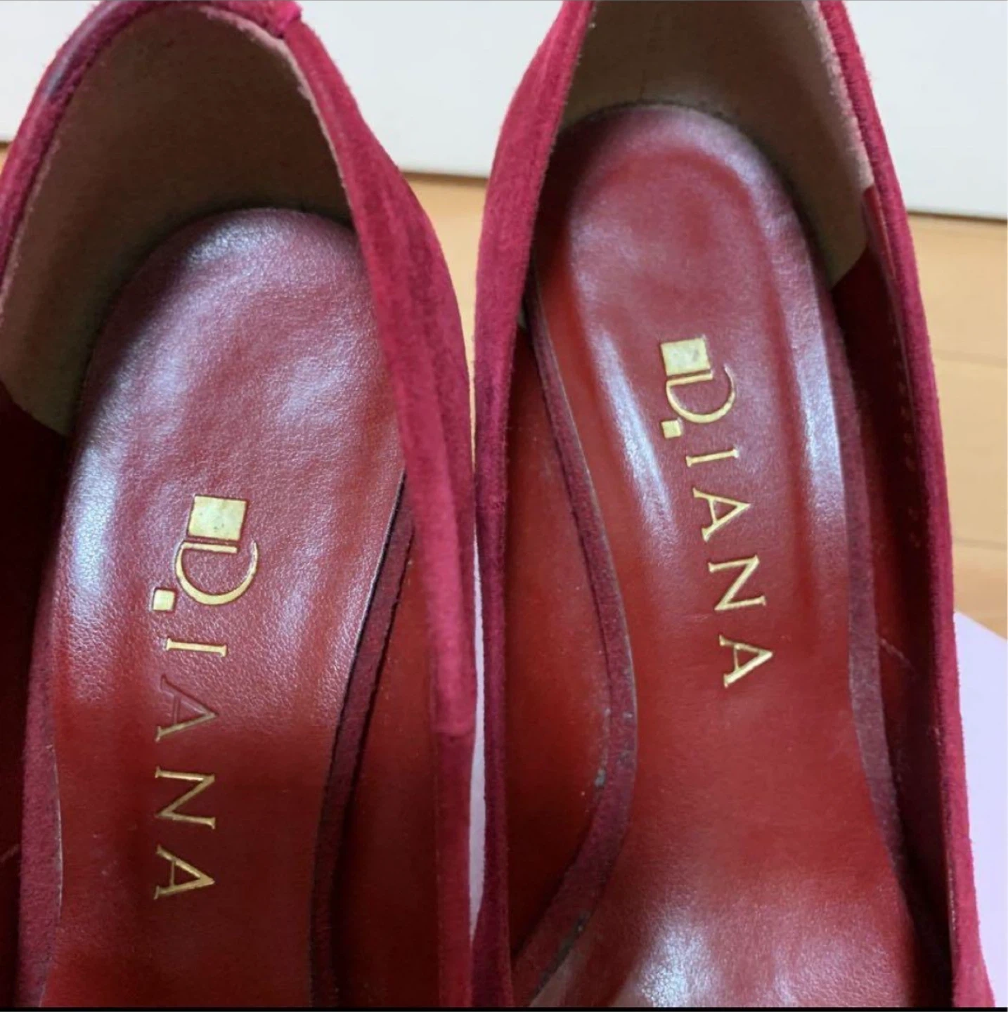ダイアナのパンプスです。 数回履きましたが、履く機会がないため出品しました。 サイズ22センチ ヒール高さ9センチ 前1.5センチ 中敷をダイアナで入れてもらってるのでキツい場合はダイアナで外してもらってください。 また裸足での着用はしてません。 中敷を上にも付けていたので中はとても綺麗です。 使用してない時は箱にしまっていたのでホコリなどもついてないです。 スレもなくとても綺麗です。 定価15000円位でした。 ・ブランド:ダイアナ ・サイズ:22cm ・色:赤 ・素材:スエード 中古品であることをご了承ください。