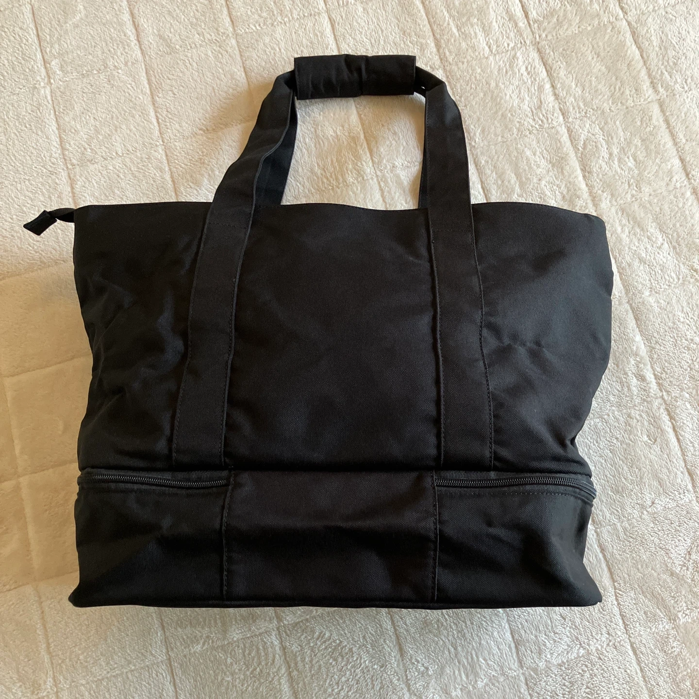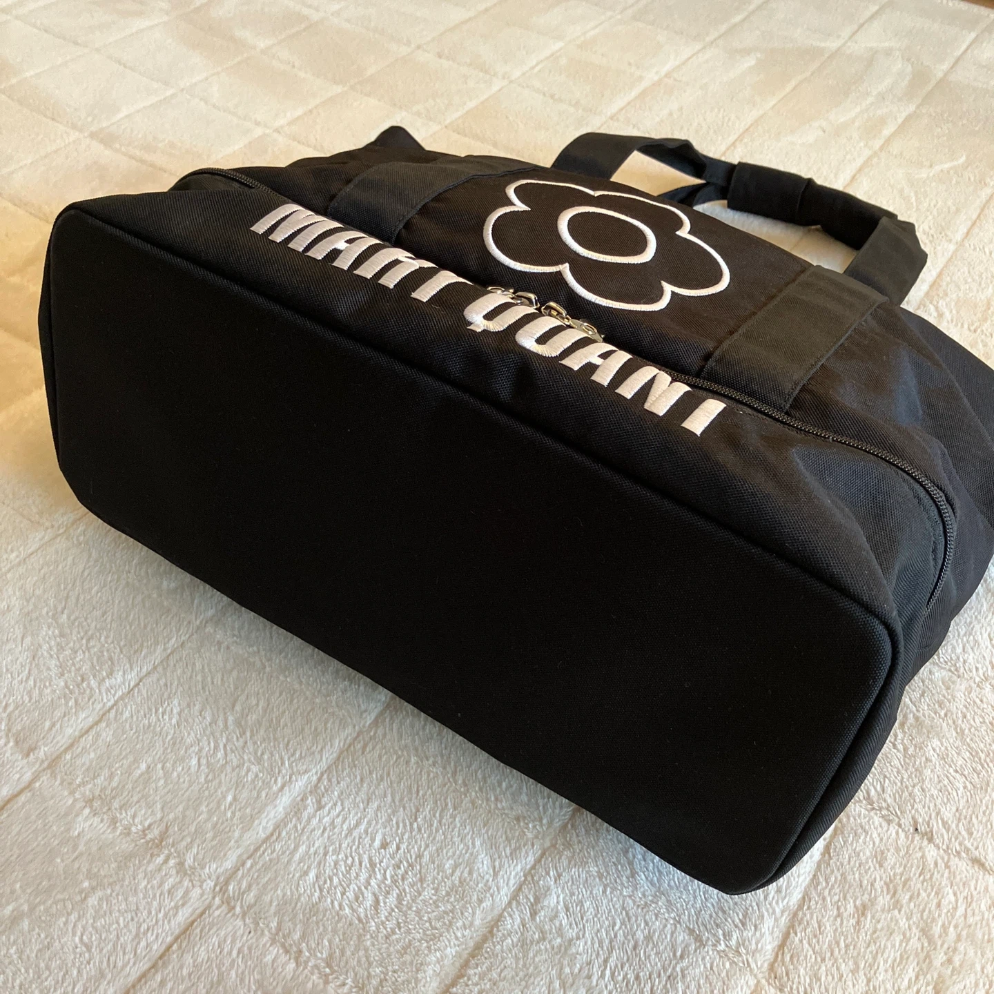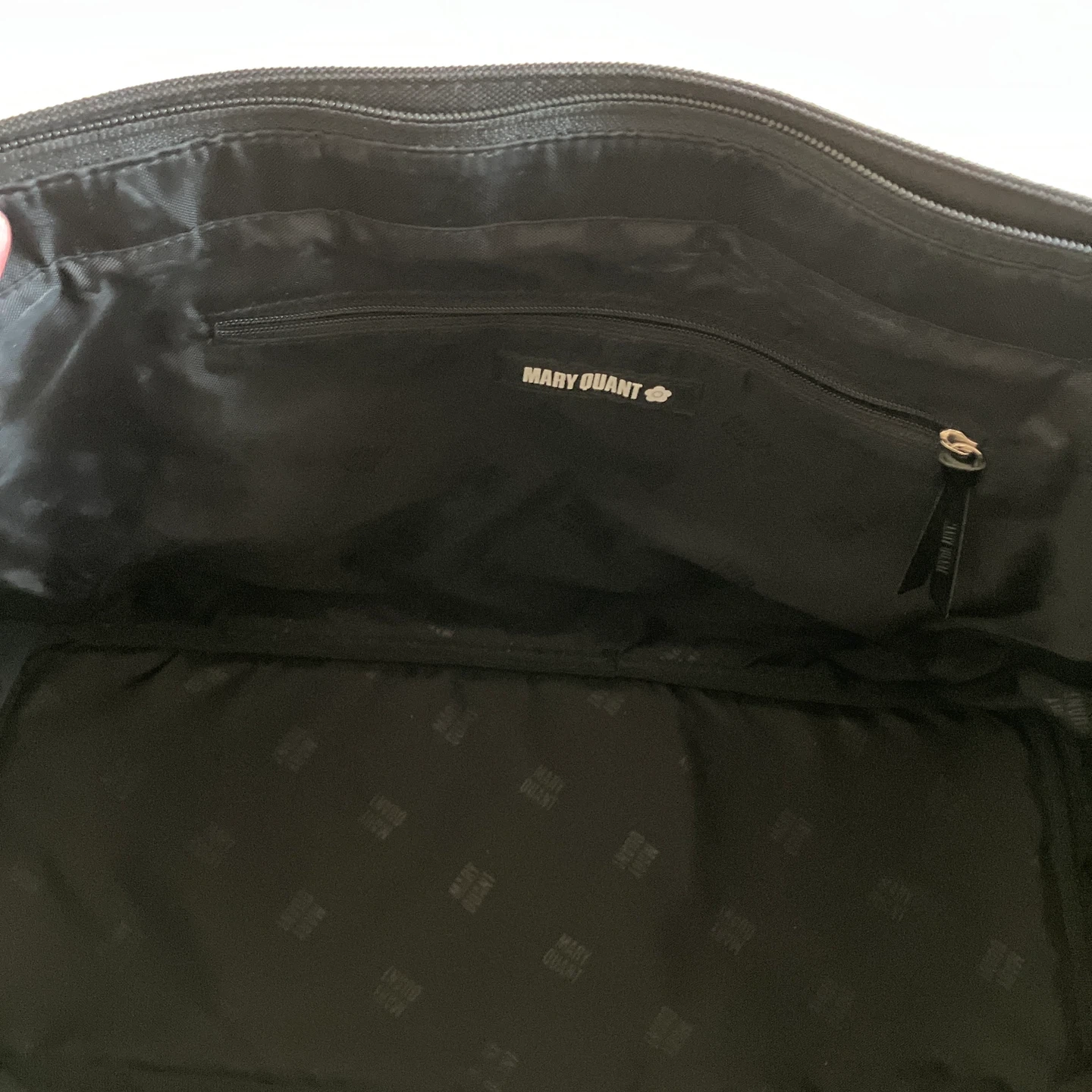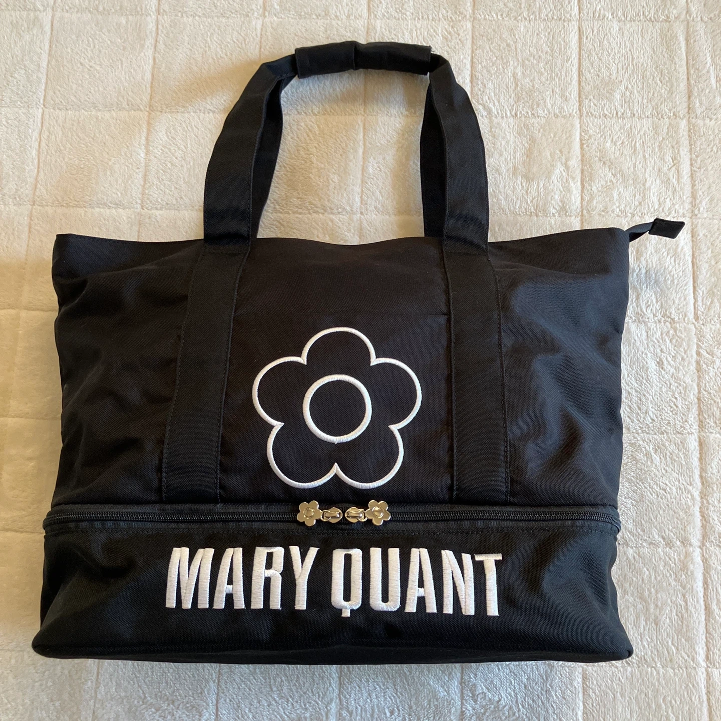 MARY QUANT マリークワントの2層式トートバッグです。 2度使用しただけなので特に汚れなどなくキレイです。 下部はファスナーで独立した収納スペースになっています。 内側はファスナーのポケットが1つと、反対側には左右大きさの違うポケットが付いていて、とても便利です。 サイズ 全体 縦35㎝        横45㎝        マチ15㎝     上部 縦27㎝     下部 縦10㎝ 他のサイトにも出品しているので、急に削除する場合があります、ご了承下さい。