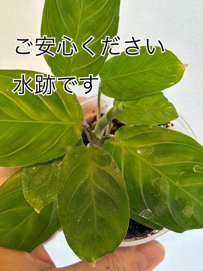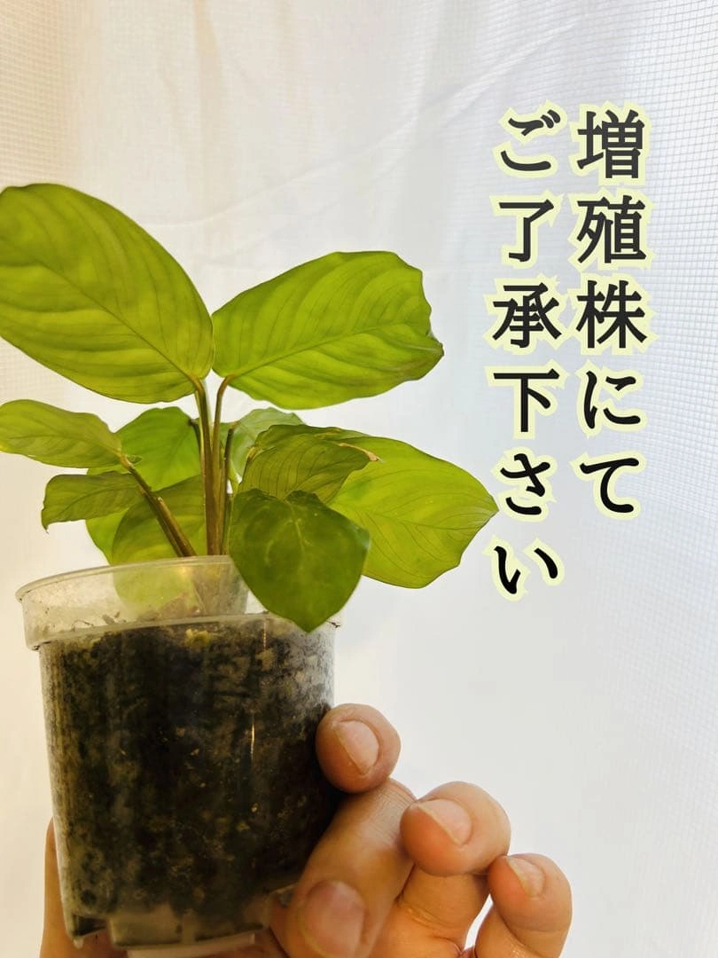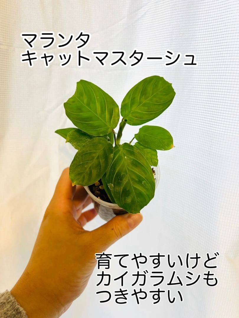 好きな人は大好き(*´ㅂ`*) 育てやすいマランタ キャットマスターシュです。 難点はカイガラムシがつきやすいと言うことです。 こんもりと育つキャットマスターシュは、マランタのなかでも葉の模様が優しめです。 でも大きくなると、子供の手のひらくらいのサイズの 葉が出てきますし、秋ごろになると模様も濃ゆくなり、まるでベルベットな輝きを放ちます。この機会にぜひ。 ※サイズ感は、手のひらサイズです。 ※植物の為、お届けまでの間に多少葉数や状態等が変わる場合がございます。 その他、ご不明な点がございましたら、お気軽にお問い合わせ下さいませ。よろしくお願いいたします。 ◯植物名: マランタ キャットマスターシュ ◯育てやすさ: 育てやすい、直射日光嫌いです。通年通して、曇り空程度の日光が必要です。10℃以下は枯れていきます。吊り鉢の方が調子良さそうです。葉水が好きなくせに、土の湿気多いのは嫌がります。 ◯特徴: カイガラムシがつきやすい ◯状態: 増殖株 ◯葉の状態:葉欠け1枚、スレ、キズ、ほんの少し茶色いところあり ◯受け渡し場所:中央線三鷹駅〜国分寺駅まで ◯受け渡し時間:ご相談